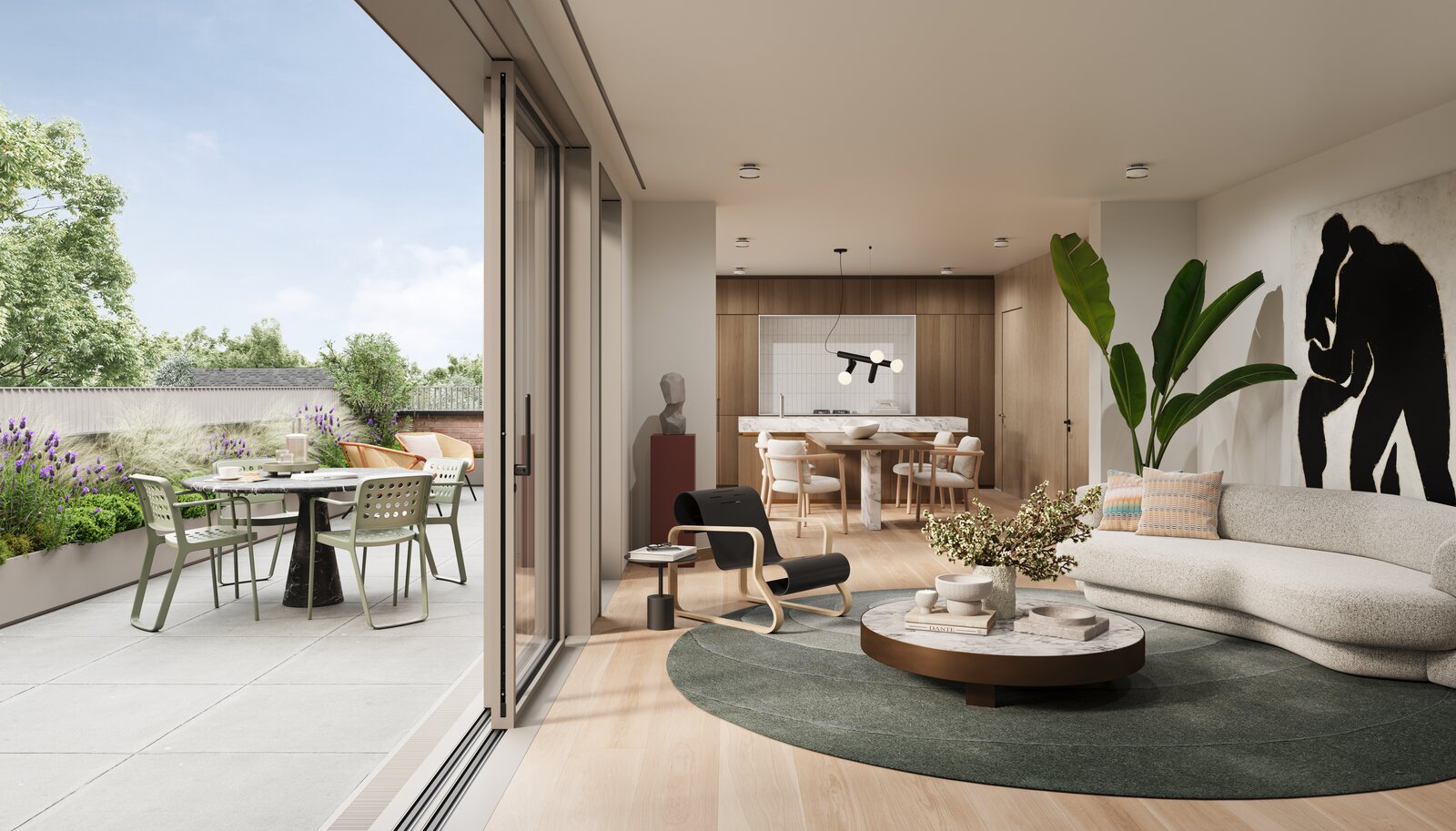 De ruime inkomhal geeft toegang tot de grote, lichtrijke leefruimte met open keuken. Aanpalend aan de keuken bevindt zich een berging. Het royale terras van 24 m² is bereikbaar langs het schuifraam in de leefruimte. Door gebruik te maken van een groot schuifraam en veel raampartijen wordt de leefruimte voorzien van veel natuurlijk licht.