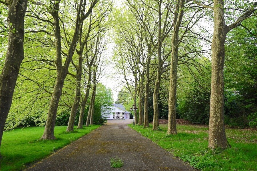 On accède à cette propriété par une longue allée bordée d'arbres imposants.