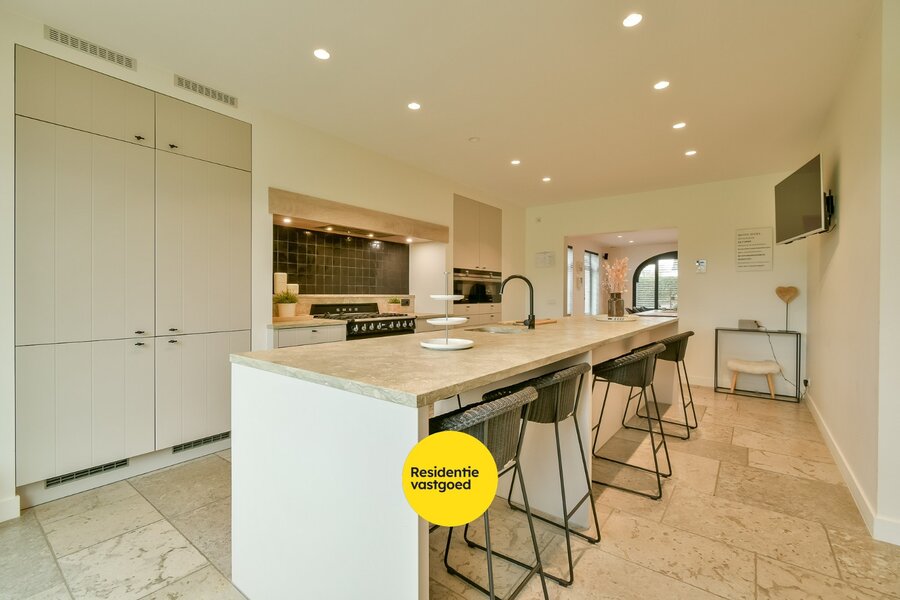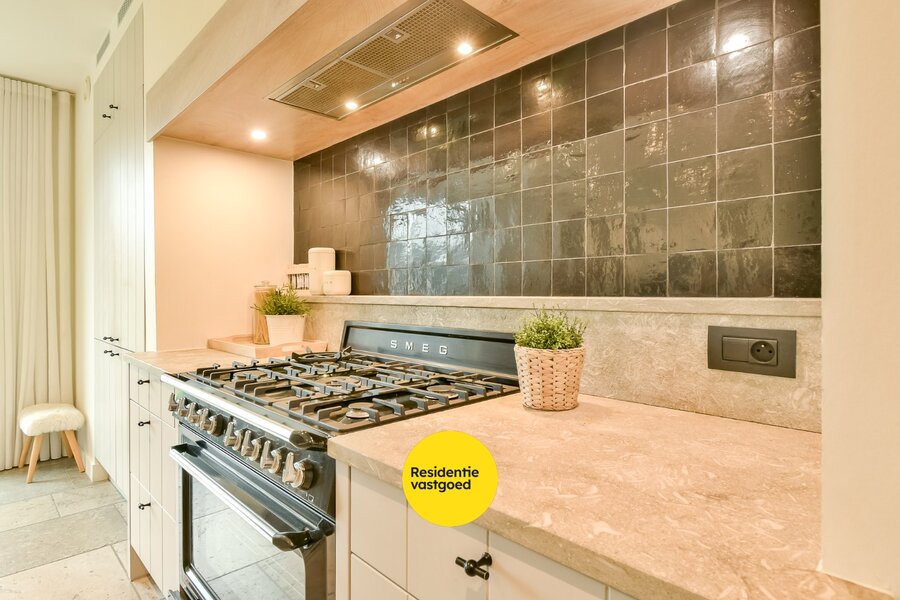 U betreedt de woning via een ruime inkomhal met gastentoilet die overgaat in de lichtrijke woonkamer met parketvloer. Dankzij de grote raampartijen geniet u hier van veel natuurlijk licht, daarnaast zorgt de gashaard voor extra sfeer en gezelligheid. De volledig uitgeruste keuken beschikt over kwalitatieve toestellen en is afgewerkt met een natuurstenen vloer en werkblad. Aansluitend bevindt zich een praktische wasplaats.