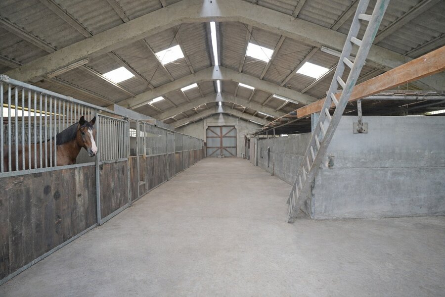KIJKDAG ZATERDAG 21/03 VAN 10U TOT 12U! (graag vooraf inschrijven) Recente open bebouwing (2019) op een perceel van maar liefst 44.888 m², rustig en landelijk gelegen in Houtem vlakbij de kust. Deze energiezuinige eigendom (EPC label A) combineert hedendaags wooncomfort met ruimte, privacy en tal van mogelijkheden voor paardenliefhebbers, zelfstandigen of hobbyisten. Op het gelijkvloers betreedt u de woning via de inkomhal. De lichtrijke leefruimte met vele raampartijen zorgt voor een aangename verbinding met de tuin. Aansluitend bevindt zich de volledig uitgeruste keuken met tegelvloer en kwalitatieve toestellen. Verder is er een praktische berging/technische ruimte. Er zijn twee badkamers: één met hangtoilet, lavabo en douche. De slaapkamer op het gelijkvloers vormt een comfortabele privésuite met dressing en een ensuite badkamer voorzien van dubbel lavabomeubel en inloopdouche. De eerste verdieping bestaat uit een ruime zolder waar eenvoudig extra slaapkamers en een bijkomende badkamer kunnen worden ingericht. Een uitgewerkt plan met twee slaapkamers, badkamer, berging en extra zolderruimte is beschikbaar. Qua technieken is het geheel uitgerust met centrale verwarming, een warmtepompboiler, houtkachel, ventilatiesysteem D, 6 zonnepanelen en twee regenwaterputten van elk 7.500 liter. PVC-ramen met hoogrendementsbeglazing en het zadeldak dragen bij aan het energiezuinige karakter. Buiten geniet u van een tuin rondom het huis, een ruime weide en een laag- en hoogstamboomgaard. Daarnaast beschikt de eigendom over een loods van 320 m² met 5 paardenboxen en opslagruimte, evenals een carport van 40 m² voor het overdekt plaatsen van wagen(s).