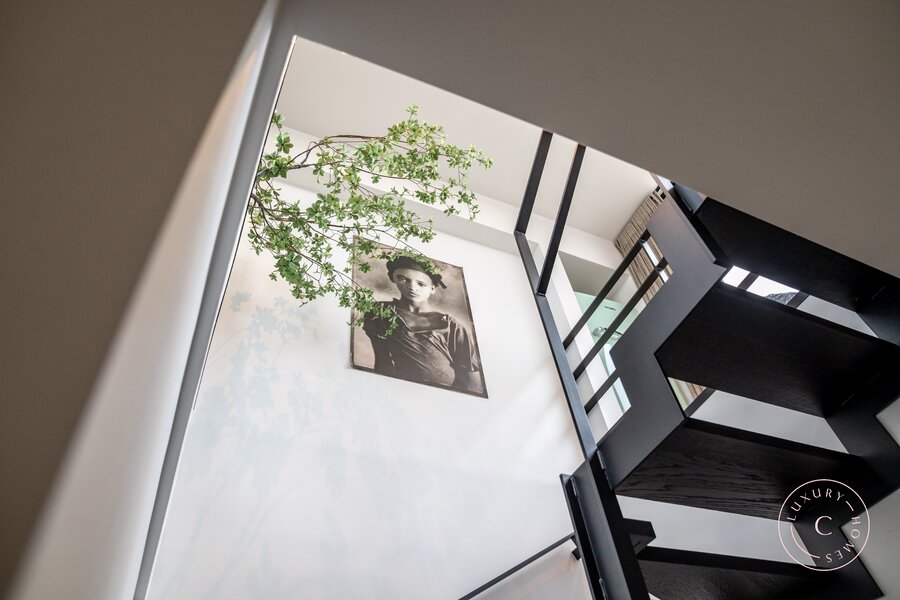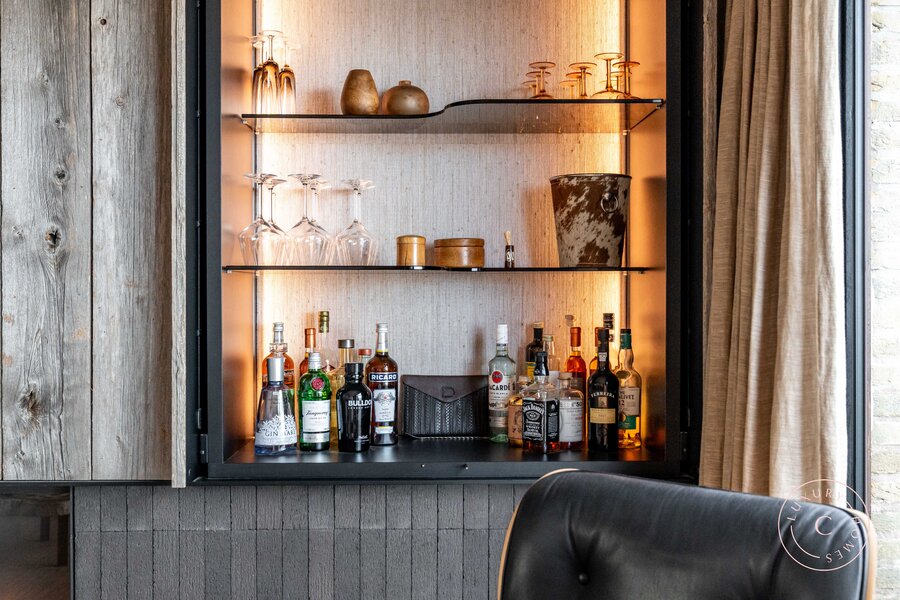 De triplex bevindt zich op de vierde, vijfde en zesde verdieping van de residentie. Bij het betreden van de vierde verdieping komen we via de inkomhal uit op de leefruimte en open keuken die elegant in elkaar overvloeien. Alles is maatwerk en tot in de puntjes afgewerkt, met onder meer een stijlvol ingebouwd tv-meubel waarin niet alleen de gaskachel en televisie zijn verwerkt, maar ook een discrete drankenkast. De keuken is voorzien van alle moderne toestellen, meer dan voldoende opbergruimte én een geïntegreerde ontbijthoek. Een ochtendkoffie kan perfect genoten worden op het zuidgericht terras, terwijl het noordgericht terras op dit verdiep ideaal is voor de namiddag en avond, met zicht over de zee.
