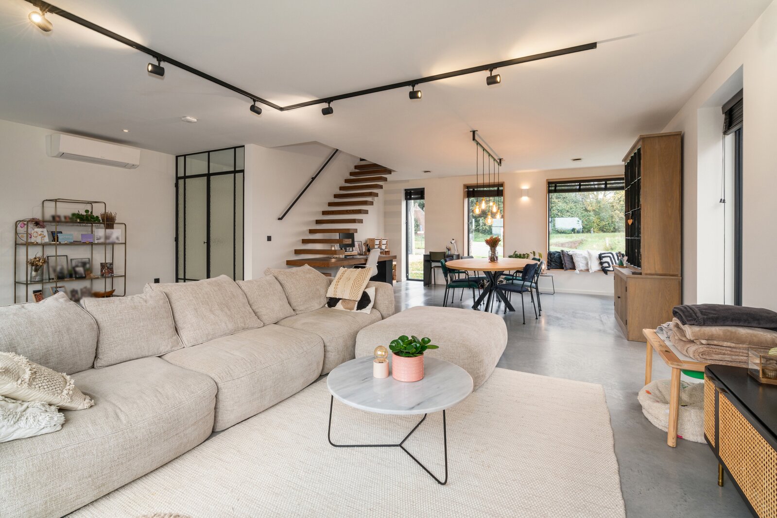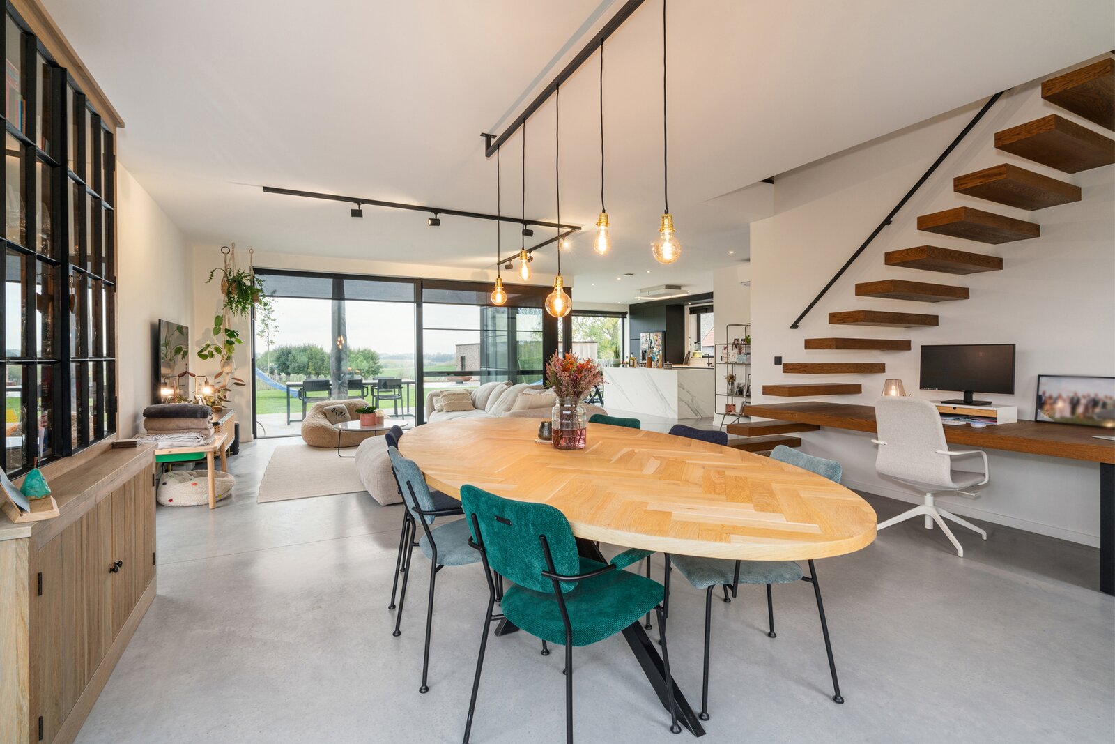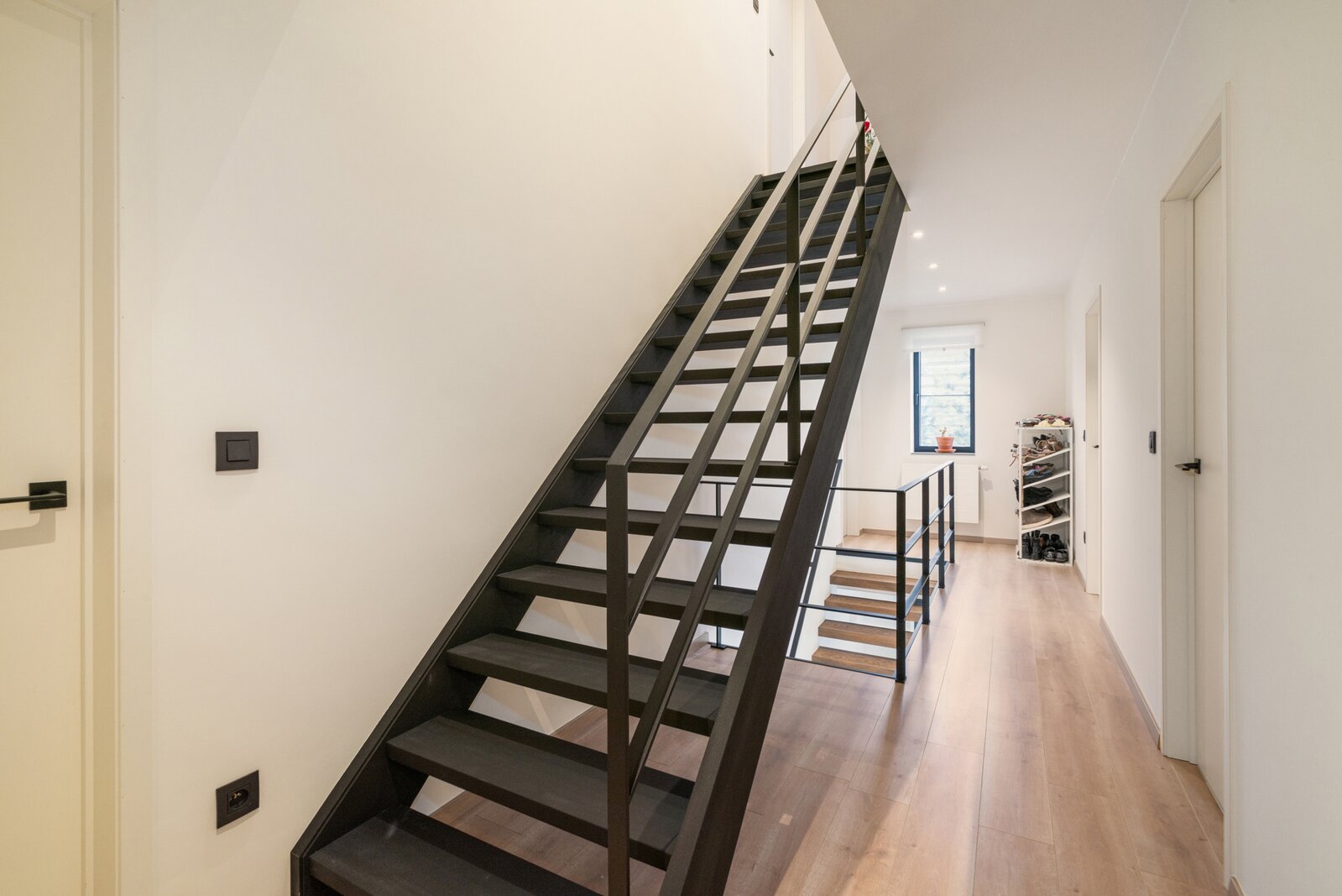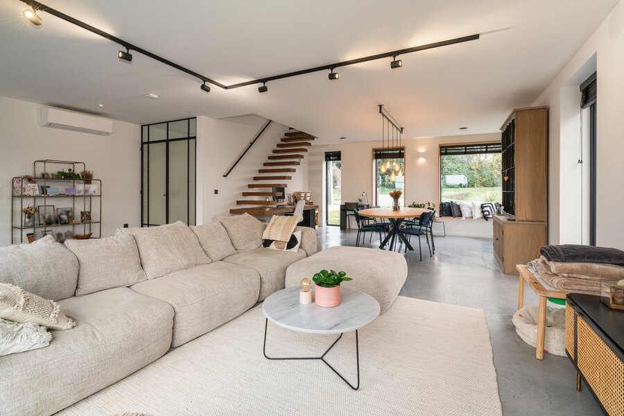 Op het gelijkvloers bevindt zich een ruime eet- en leefruimte met aansluitend een volledig geïnstalleerde open keuken (Siemens en Novy toestellen) die uitkijkt op de verzorgde tuin. De trap loopt fijnloos over tot een mooi bureau. Verder zijn er een handige berging en wasruimte aanwezig. De vloerverwarming in combinatie met de betonnen vloer zorgt hier voor een aangenaam wooncomfort.