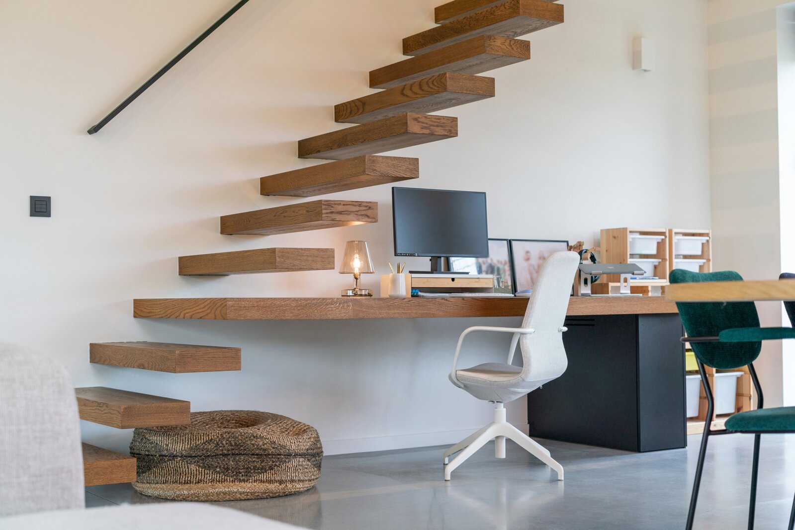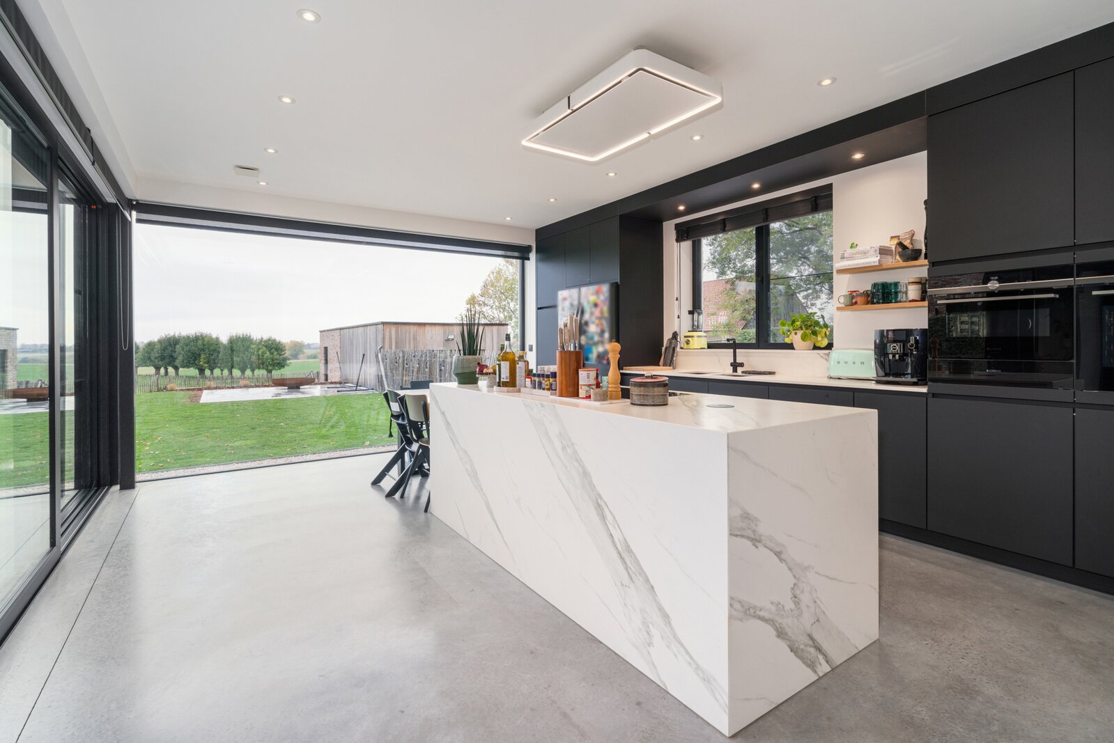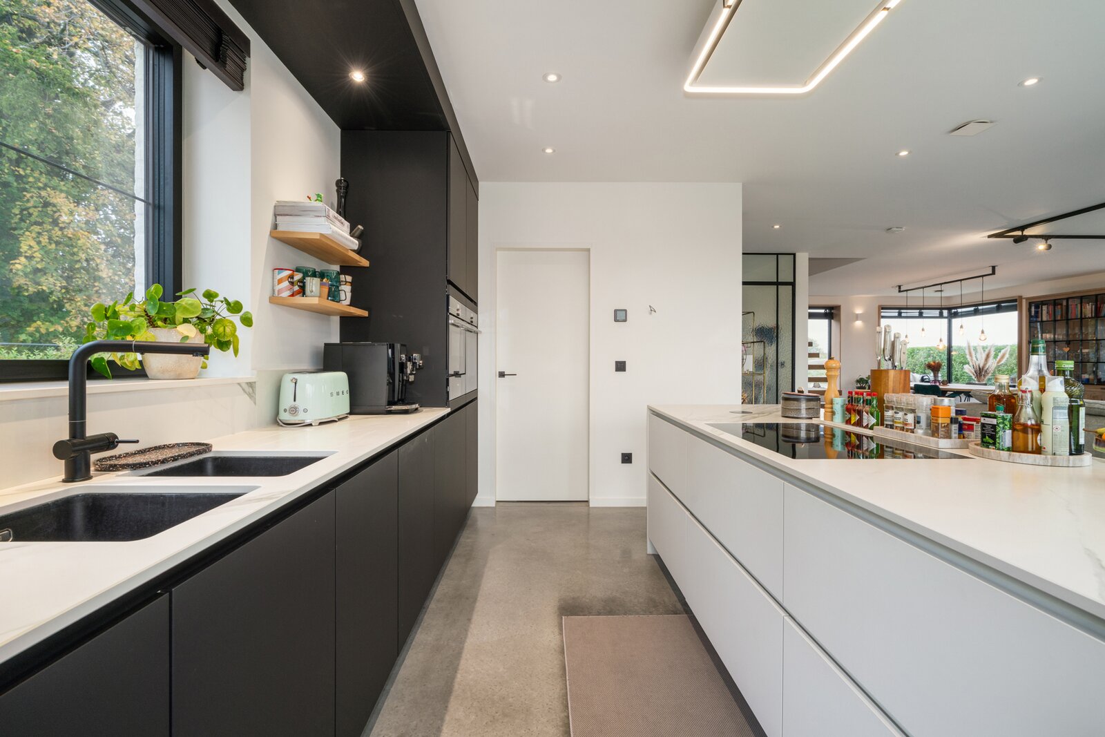Op het gelijkvloers bevindt zich een ruime eet- en leefruimte met aansluitend een volledig geïnstalleerde open keuken (Siemens en Novy toestellen) die uitkijkt op de verzorgde tuin. De trap loopt fijnloos over tot een mooi bureau. Verder zijn er een handige berging en wasruimte aanwezig. De vloerverwarming in combinatie met de betonnen vloer zorgt hier voor een aangenaam wooncomfort.