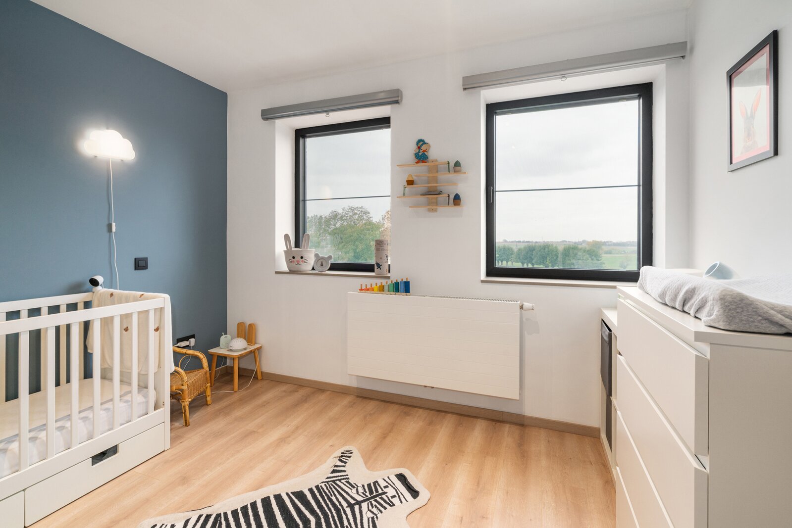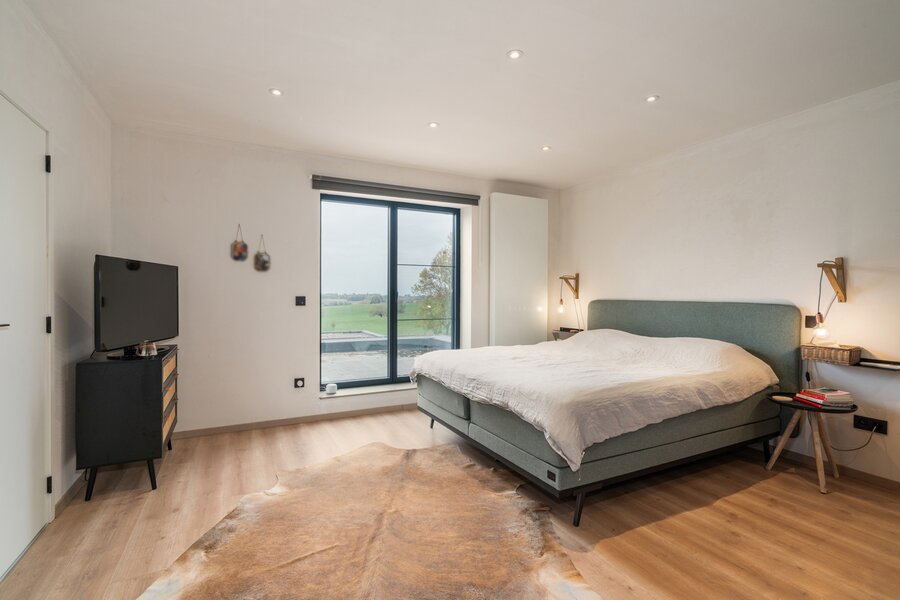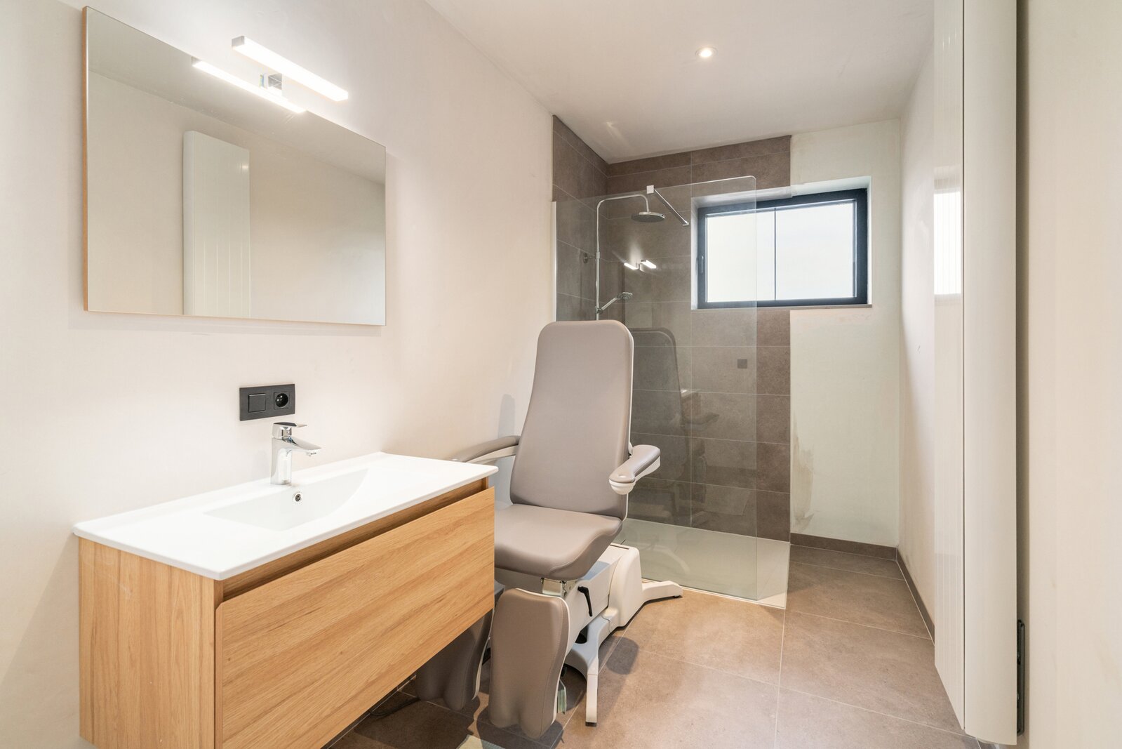 Op de eerste verdieping vinden we de master bedroom met een eigen badkamer, uitgerust met een inloopdouche, vrijstaand bad en dubbele lavabo. Daarnaast zijn er nog twee ruime slaapkamers en een tweede badkamer met douche en lavabo.