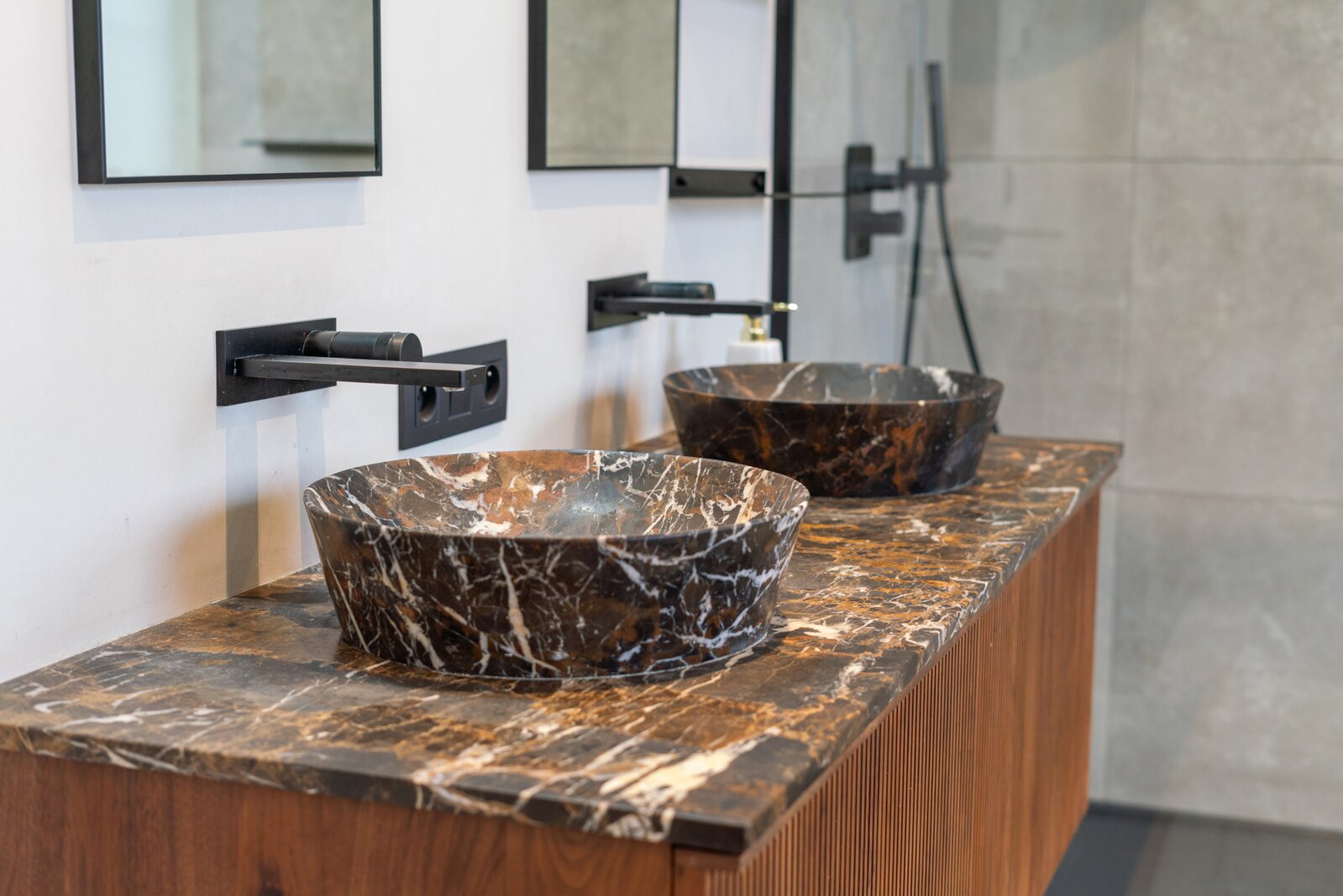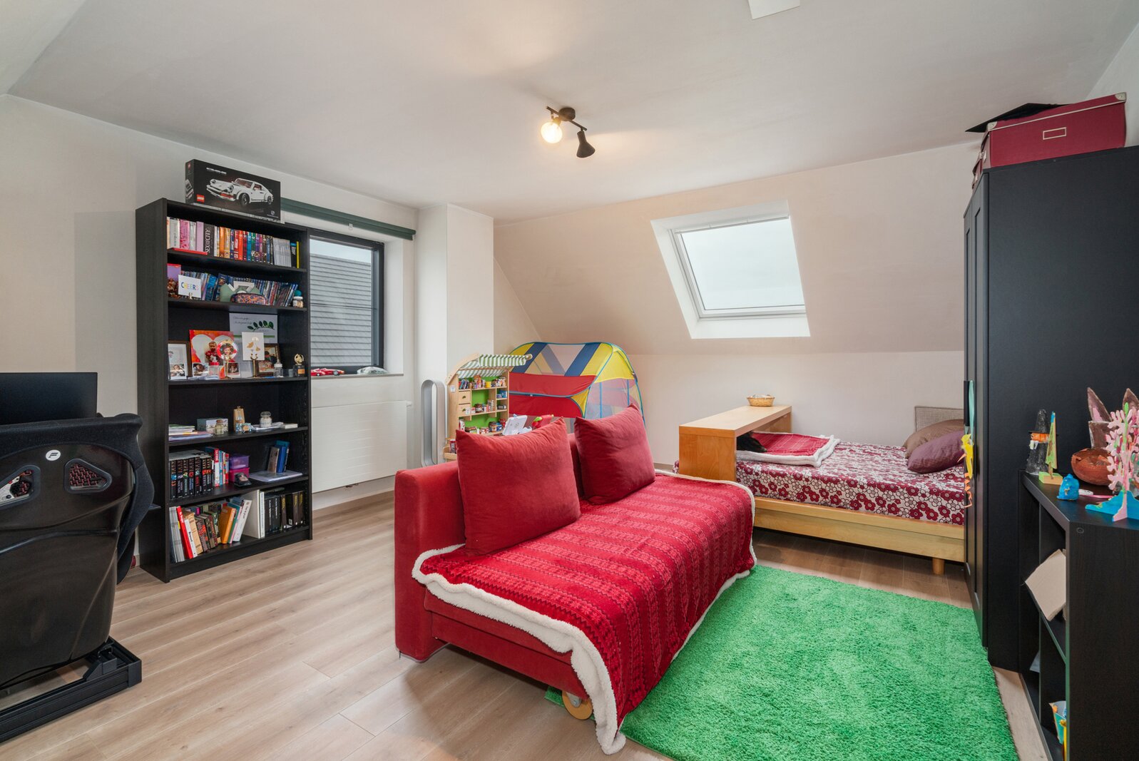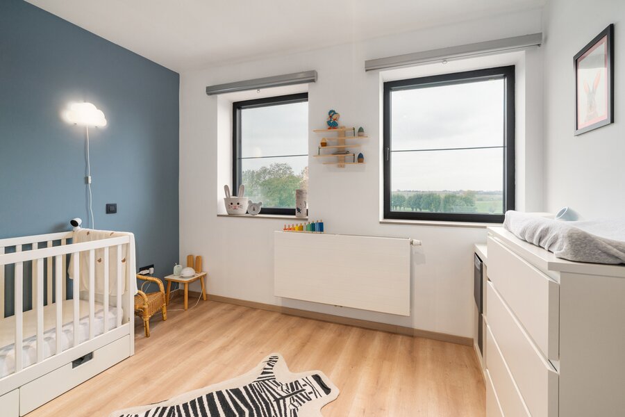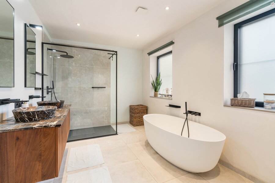 Op de eerste verdieping vinden we de master bedroom met een eigen badkamer, uitgerust met een inloopdouche, vrijstaand bad en dubbele lavabo. Daarnaast zijn er nog twee ruime slaapkamers en een tweede badkamer met douche en lavabo.