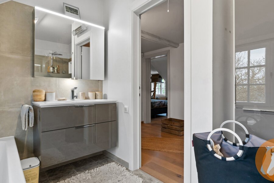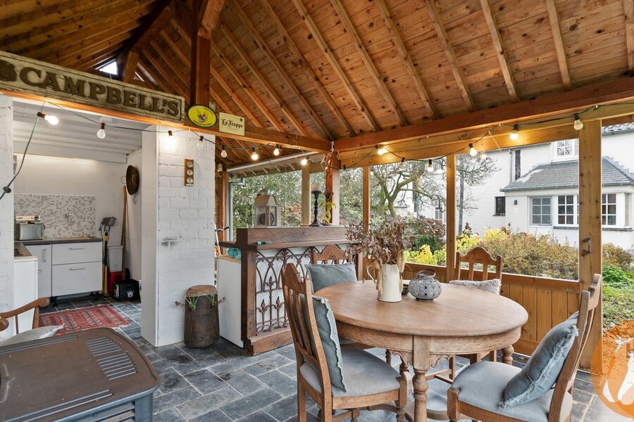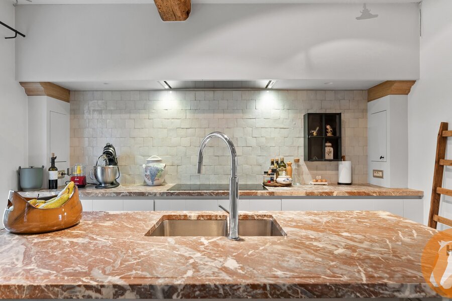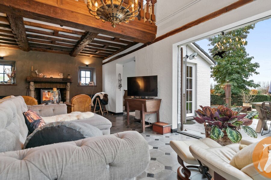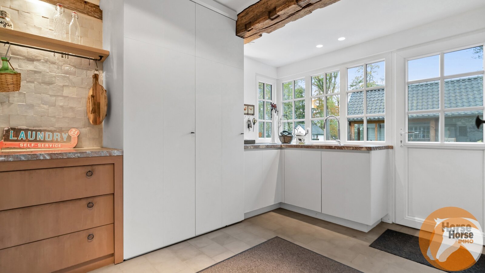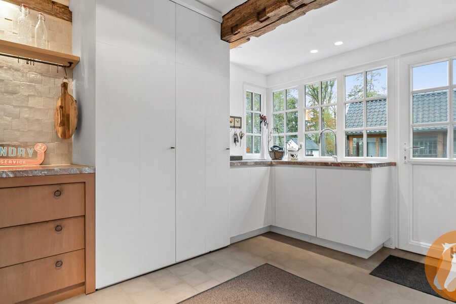 Binnen straalt de woning rust en stijl uit. De leefruimtes vloeien naadloos in elkaar over en baden in natuurlijk licht dankzij de grote raampartijen die het omliggende landschap letterlijk binnenhalen. De keuken, die zelfs werd opgenomen in Landelijk Wonen, combineert traditioneel vakmanschap met moderne luxe en is afgewerkt met onder meer Rouge Belge-marmer en authentieke vloertegels. Het hart van het huis is ongetwijfeld de sfeervolle zithoek, waar een houtkachel voor warmte en gezelligheid zorgt, perfect voor knusse avonden met zicht op de tuin.