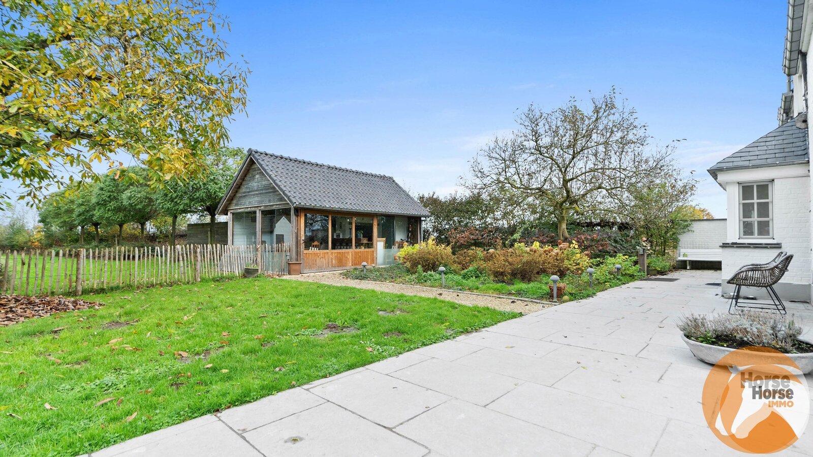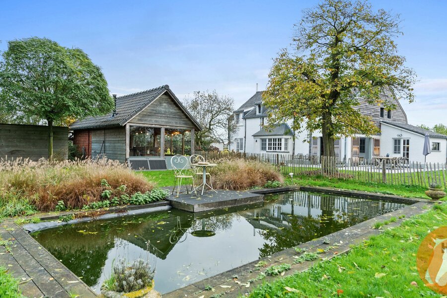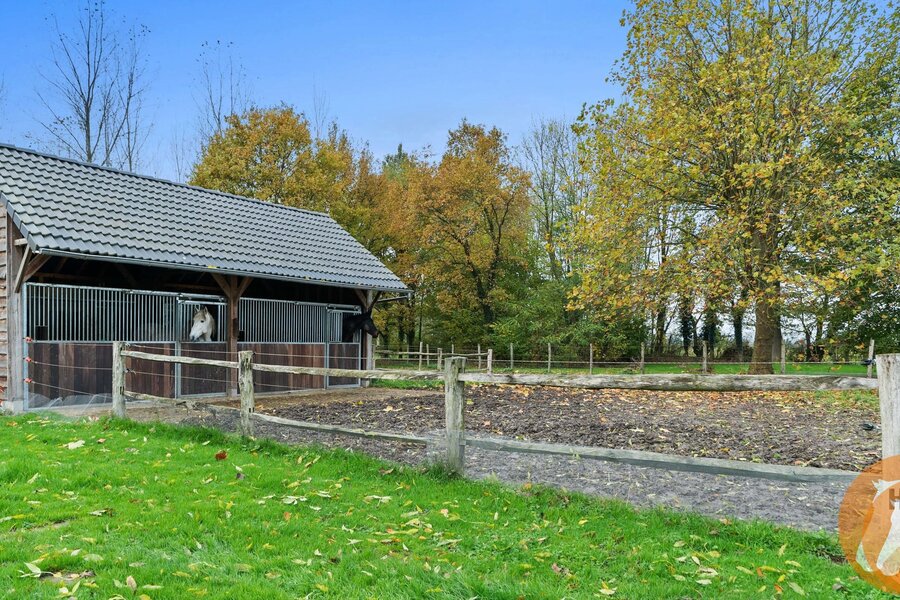 Buiten geniet men van een royaal aangelegd terras, een dubbele garage, een poolhouse met buitenkeuken en douche, een vijver, twee paardenstallen en fraai omheinde weides met kastanje houten palen – ideaal voor het houden van dieren.