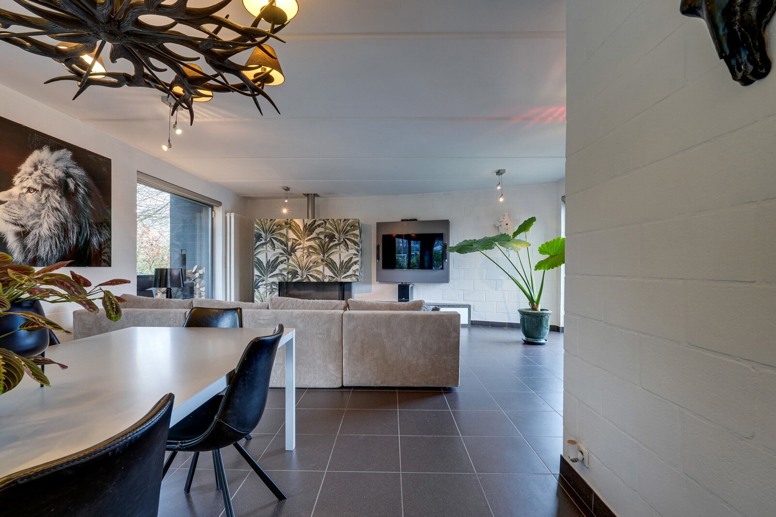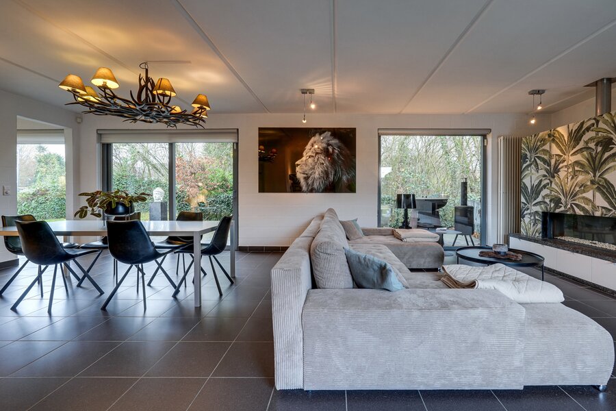 Le séjour lumineux est agrémenté d’un foyer à gaz ouvert, créant une atmosphère chaleureuse et conviviale. La cuisine semi-ouverte attenante constitue un espace central pour cuisiner et partager des moments en famille. Le rez-de-chaussée comprend également un bureau, une buanderie pratique et deux toilettes séparées.