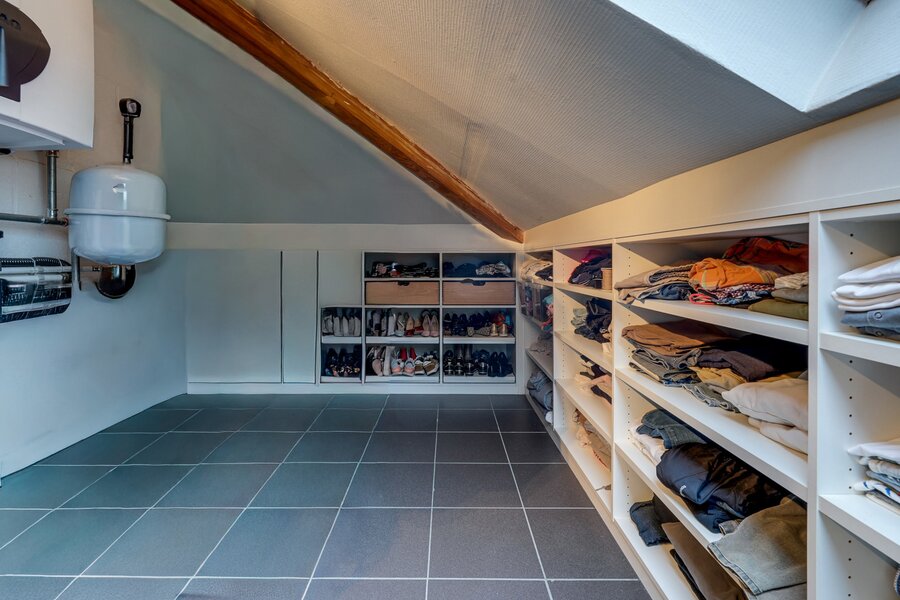 Les espaces de rangement sont nombreux, avec un grenier accessible par échelle escamotable et une cave à vin.
