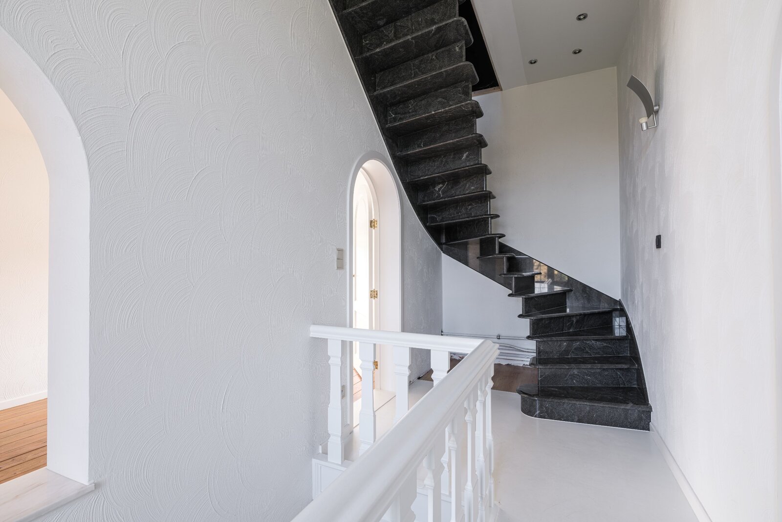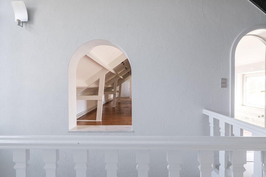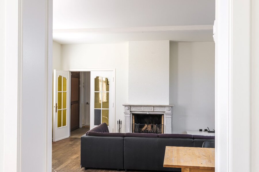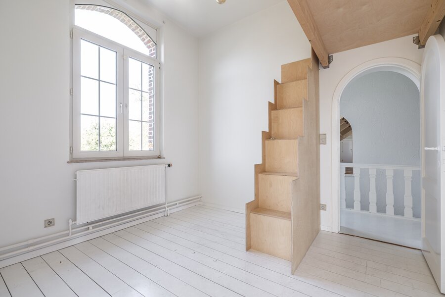 De ruime en lichtrijke leefruimte met marmeren schouw heeft een open haard wat de ruimte die extra gezellige touch geeft. Aansluitend is er de te renoveren keuken met naastliggende technische berging. Zowel de leefruimte als naastliggende ruimtes hebben een vlotte toegang tot de tuin/terras. Er zijn visualisaties beschikbaar met de verschillende mogelijkheden. Aan de linkerzijde van de trapzone is er het "kantoor"gedeelte. Hier zijn verschillende invullingen mogelijk. Op de bovenverdieping zijn minimaal 3 ruime slaapkamers en een mooi uitgeruste en grote badkamer voorzien. De mastersuite heeft nog aansluitend een ruime dressing. Idem wat betreft de andere slaapkamer aan de linkerzijde van het pand. Met de zone in de torenkamer zijn er ook nog verschillende andere invullingen mogelijk. Deze is bereikbaar met een volwaardige trap.