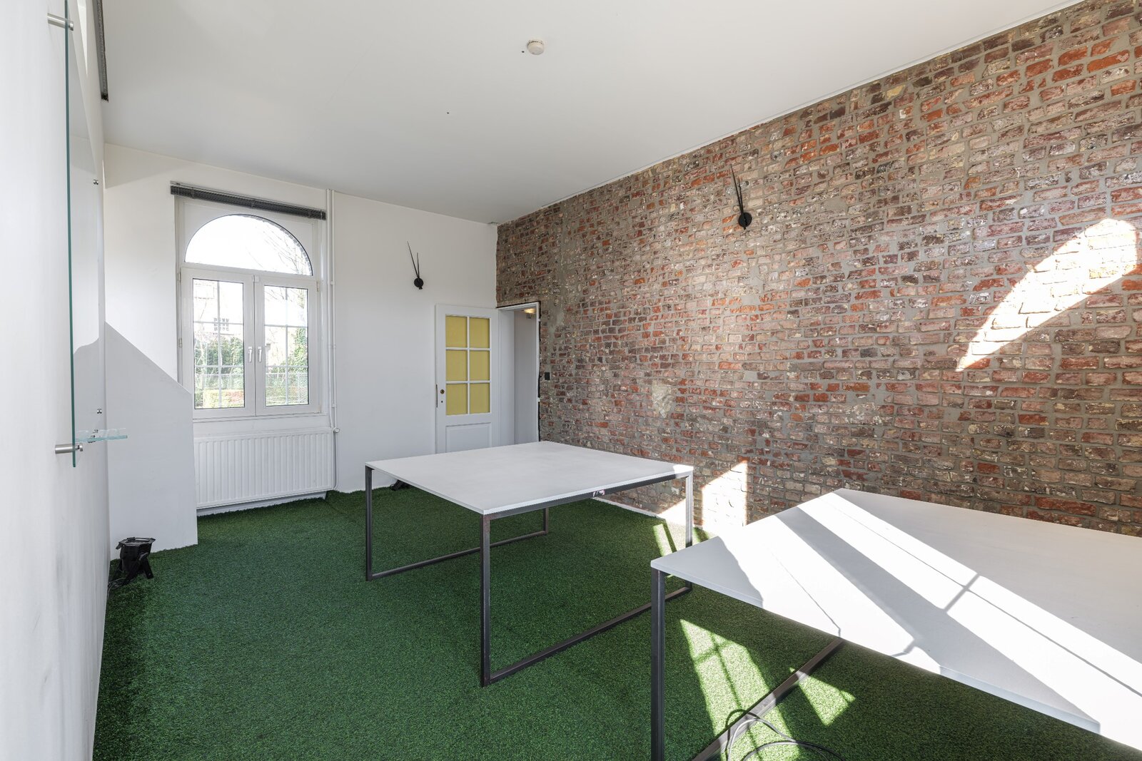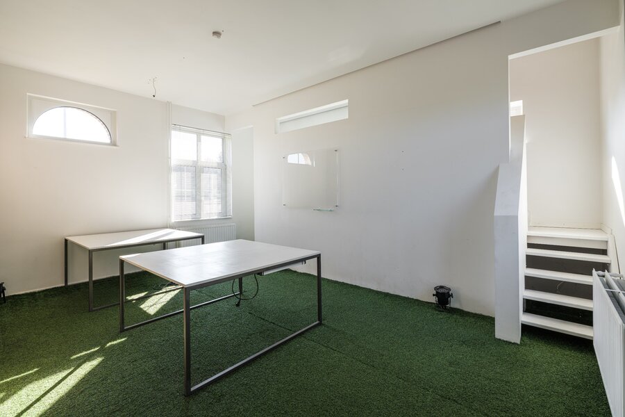 De mooie houten voordeur staat centraal en deelt het pand makkelijk op in het privé gedeelte en het "kantoor" gedeelte. Het ruim kantoor bevindt zich aan de linkerzijde. Deze zone kan makkelijk worden betrokken bij het privé gedeelte.
