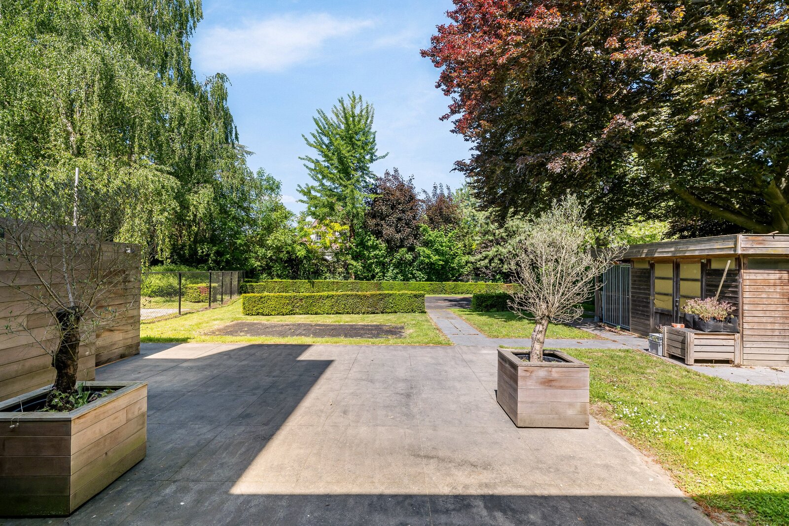 De grote onderhoudsvriendelijke tuin is volledig afgesloten en heeft een automatische dubbele houten poort.