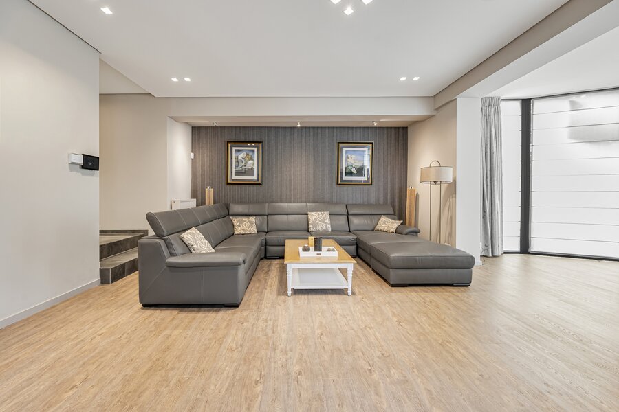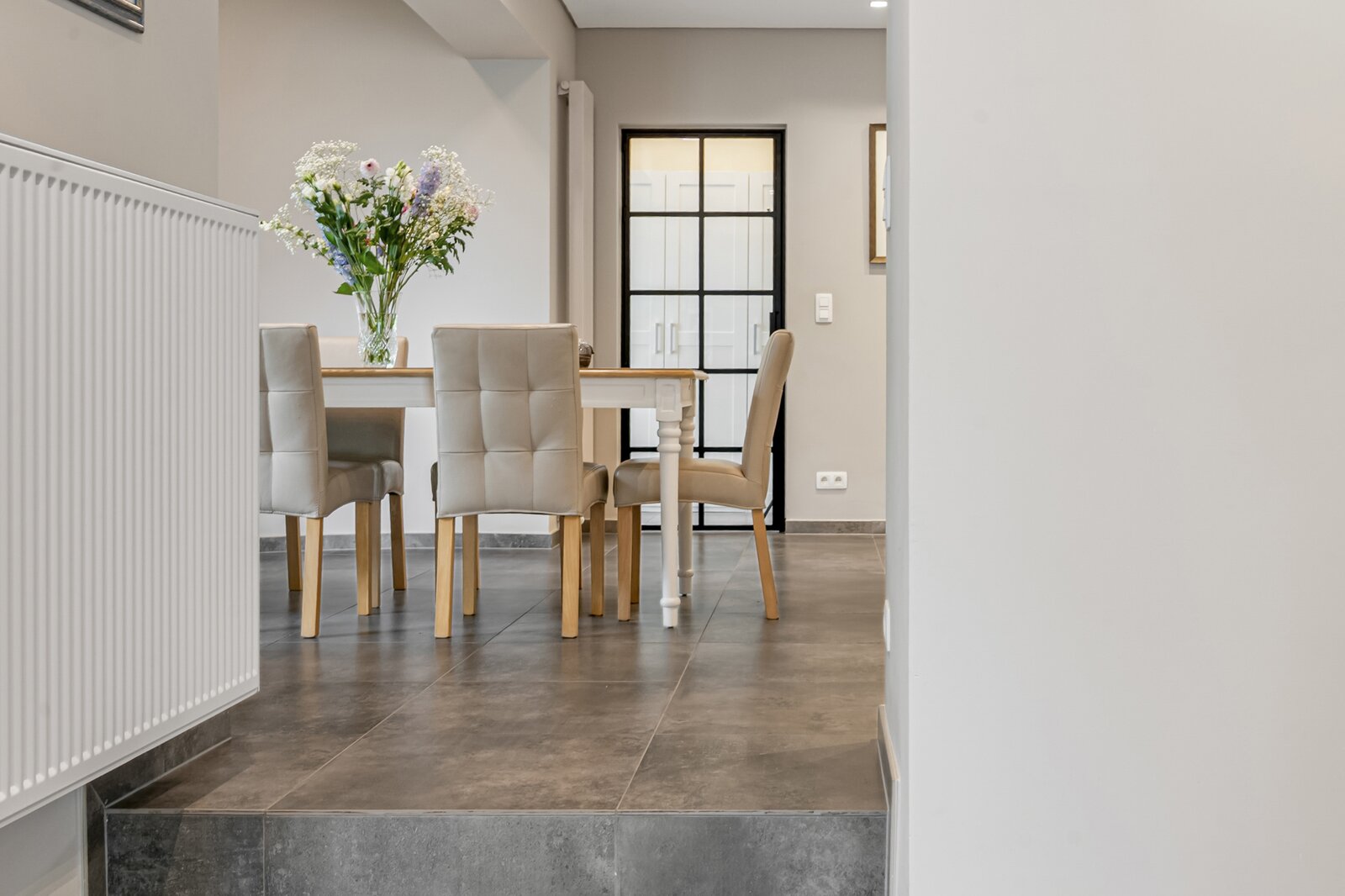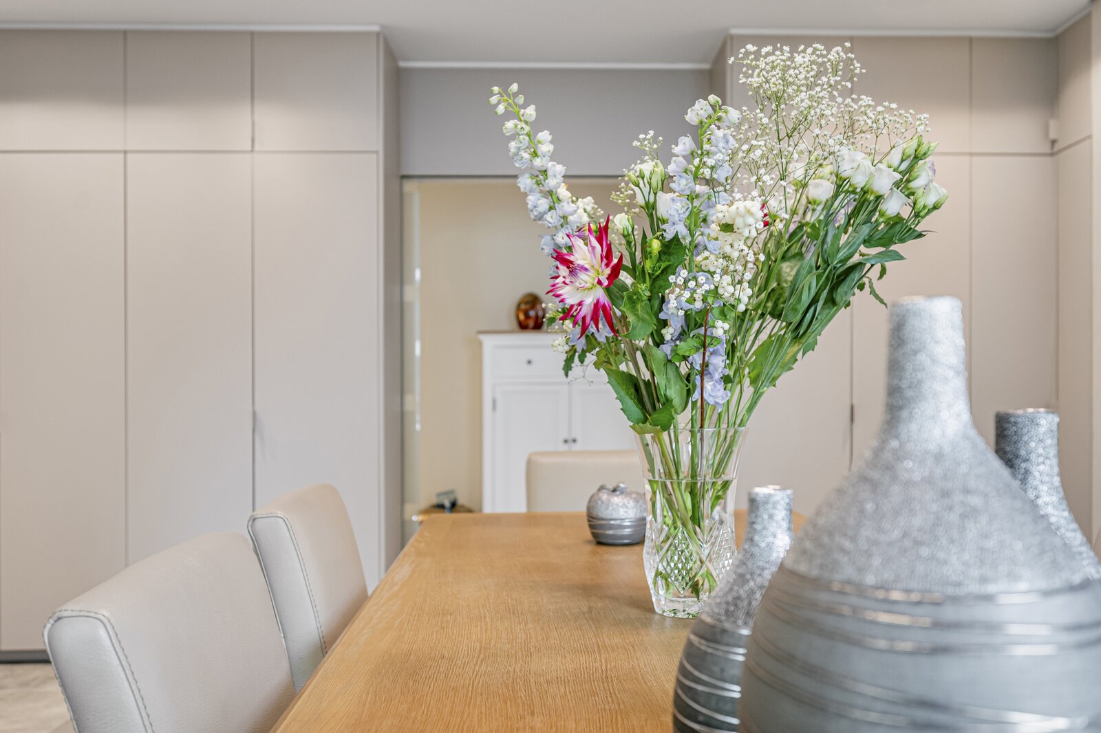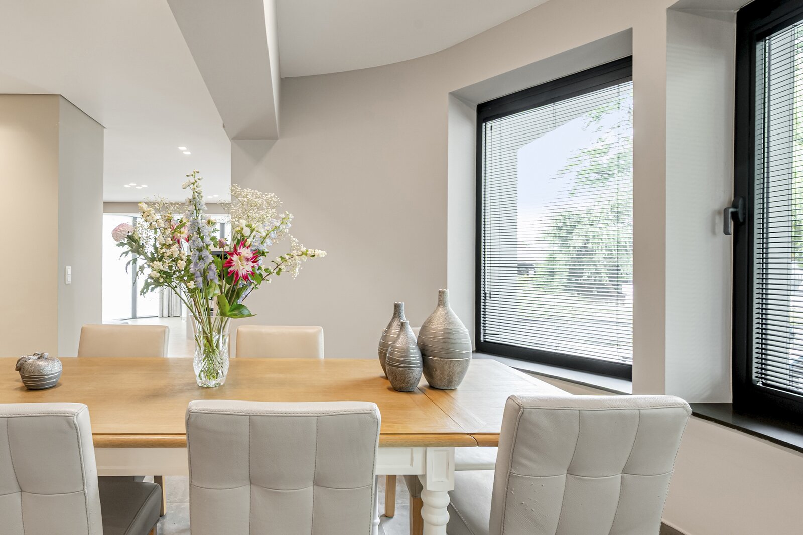 De stijlvolle eetkamer is voorzien van maatkasten en loopt via een stalen deur over in de hyper uitgeruste keuken. De keuken beschikt over een composiet werkblad en hoogwaardige toestellen, waaronder inductiekookplaat met ingewerkte dampkap, vaatwasser, koelkast, diepvries, oven, microgolf- en stoomoven. Aansluitend vindt u een koele berging, een aparte wasplaats met extra berging en een gastentoilet.