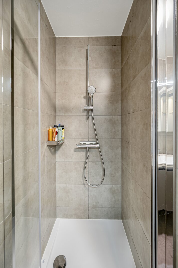 Het slaapgedeelte is volledig afgewerkt met maatwerk, inclusief ingemaakte kasten en schappen, en biedt drie comfortabele slaapkamers. Twee van de kamers zijn voorzien van een bureau, ideaal voor studie of werk. De master bedroom beschikt over een ensuite badkamer, terwijl de tweede badkamer praktisch is ingericht met een dubbel lavabomeubel en inloopdouche.