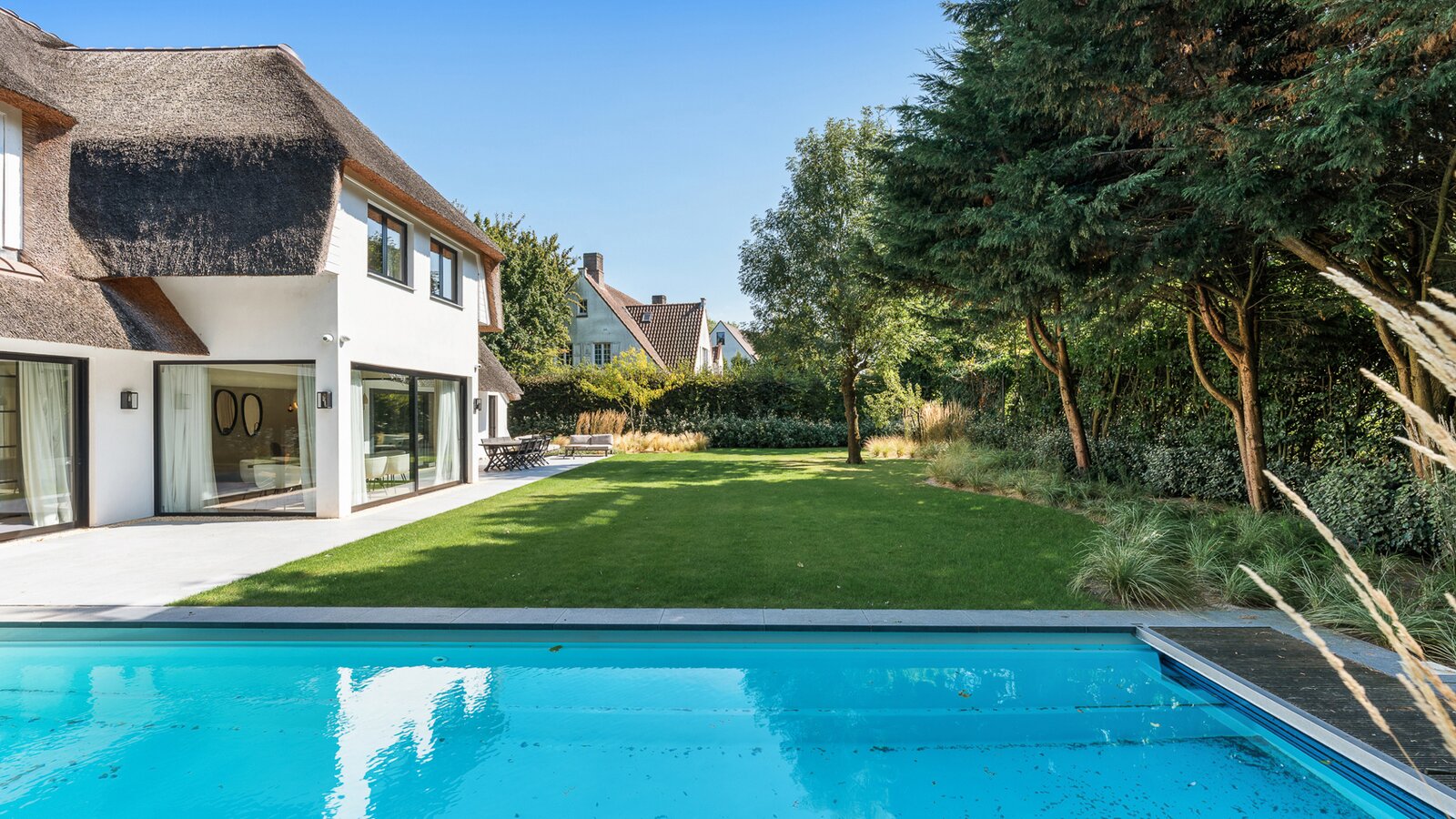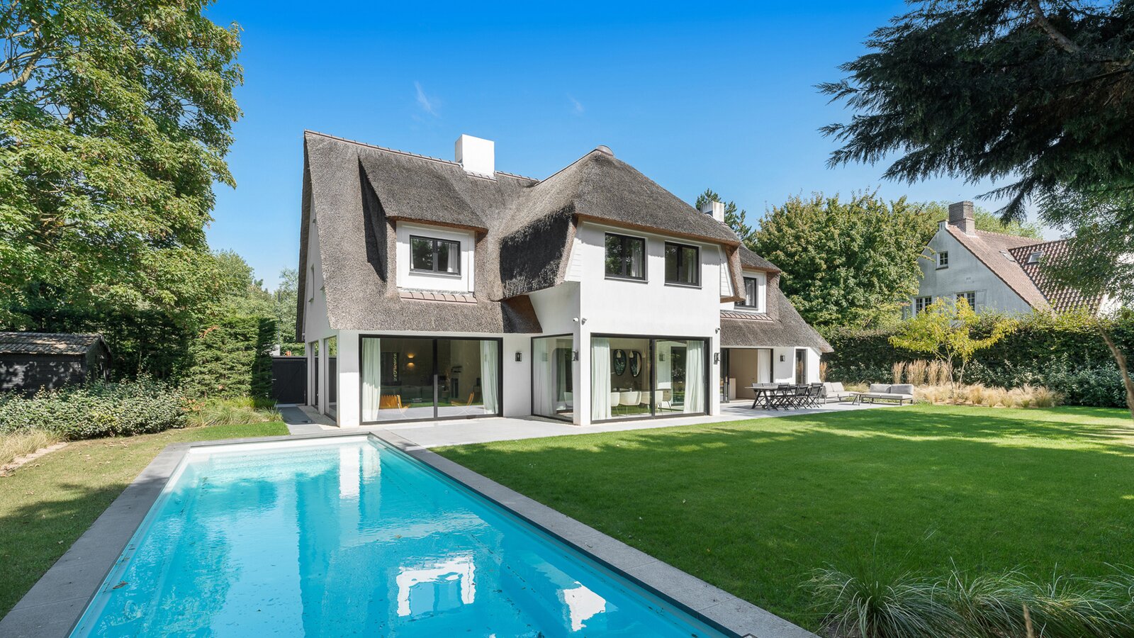 Villa entièrement rénovée, située au calme sur un terrain de 1.174m², à quelques pas du "Royale Zoute Tennis Club" et du Zwin. Composition : spacieux hall d'entrée avec vestiaire et toilette. Spacieux salon avec feu ouvert et salle à manger avec accès à la terrasse et au beau jardin avec piscine. Coin TV séparé. Cuisine ouverte et entièrement équipée. Buanderie pratique. Aux étages supérieurs : spacieuse chambre principale avec salle de bain attenante (baignoire, double vasque, douche). 2ème et 3ème chambre chacune avec salle d'eau attenante. 4ème et 5ème chambre. Salle de bain complète (baignoire, douche, double vasque, WC). Au deuxième étage : Chambres 6 et 7. Salle de bains. Garage pour 2 voitures et grand stationnement extérieur. Salle de douche pratique au rez-de-chaussée. Idéal aussi bien pour des vacances reposantes que pour une résidence permanente ! Veuillez vous rendre dans l'un de nos bureaux sur rendez-vous.