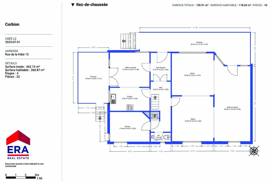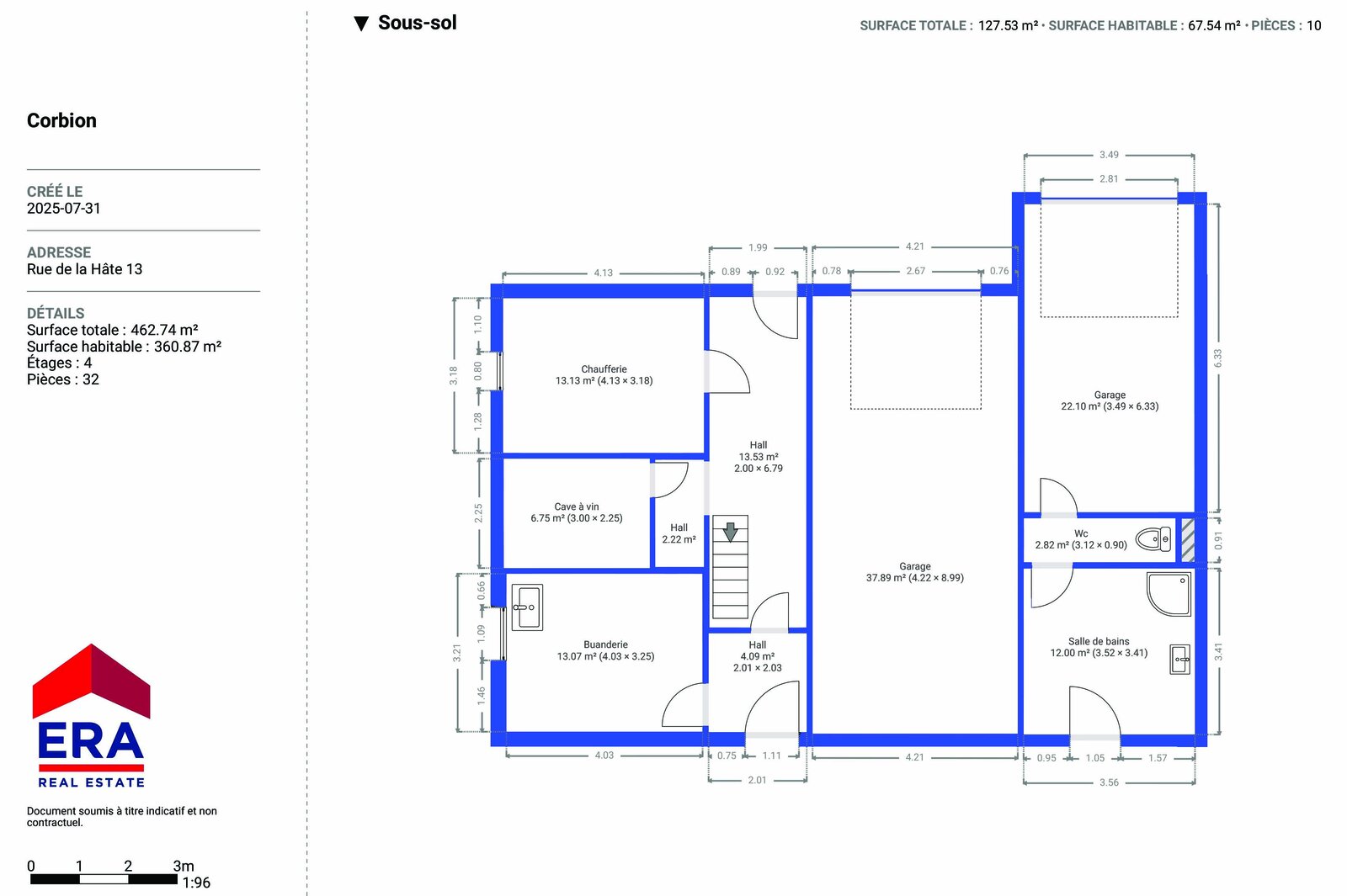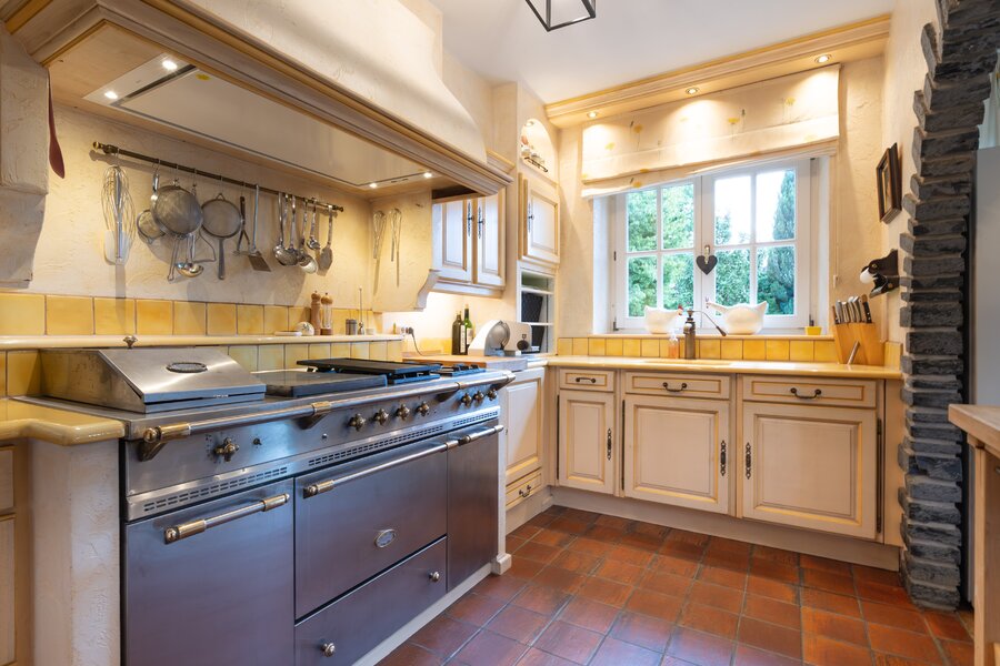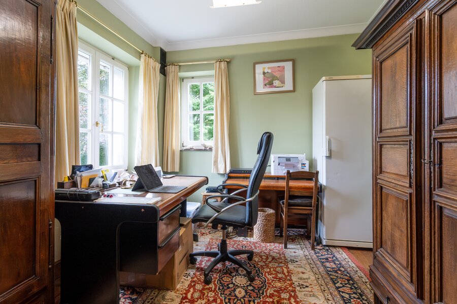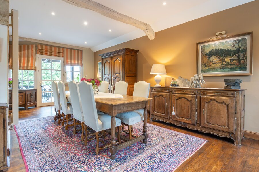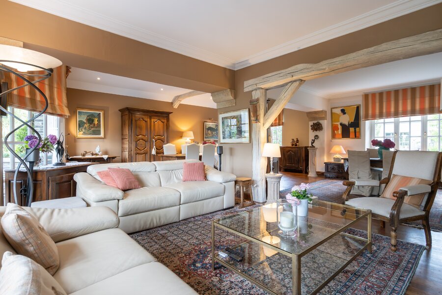 Composition : un spacieux séjour lumineux, une cuisine équipée professionnelle, 3 bureaux, 3 toilettes, 2 salles de bains, une salle de bain avec jacuzzi, 4 chambres, un grenier, 2 garages, une cave à vins, une buanderie, une chaufferie, plusieurs terrasses, une piscine couverte et un jardin avec un petit point d’eau.