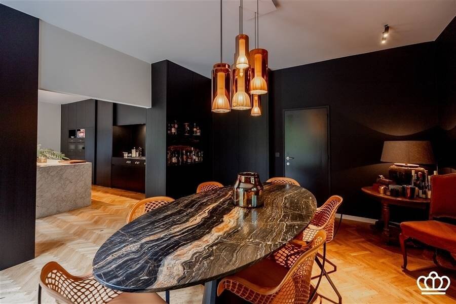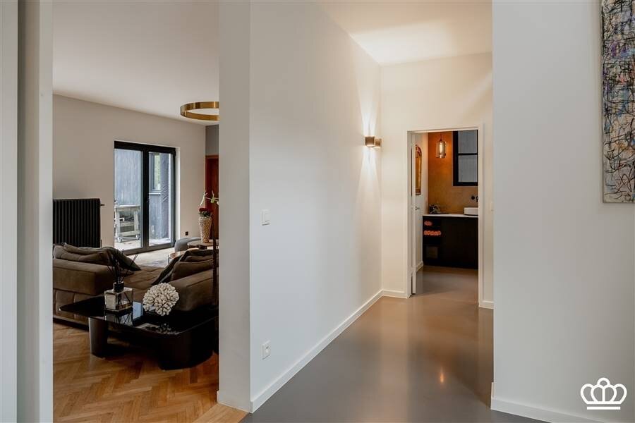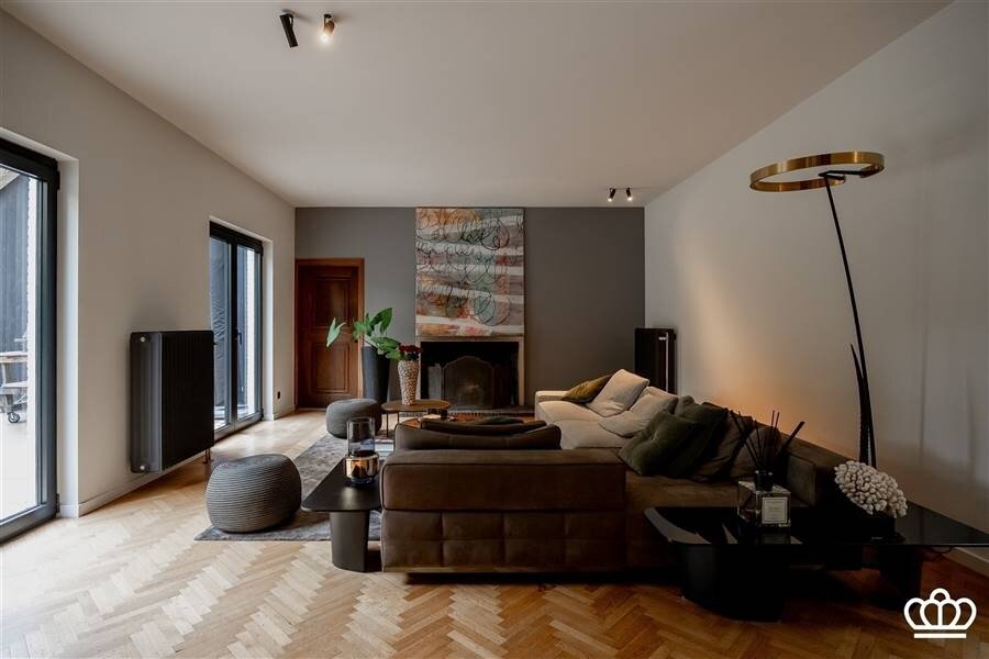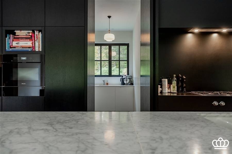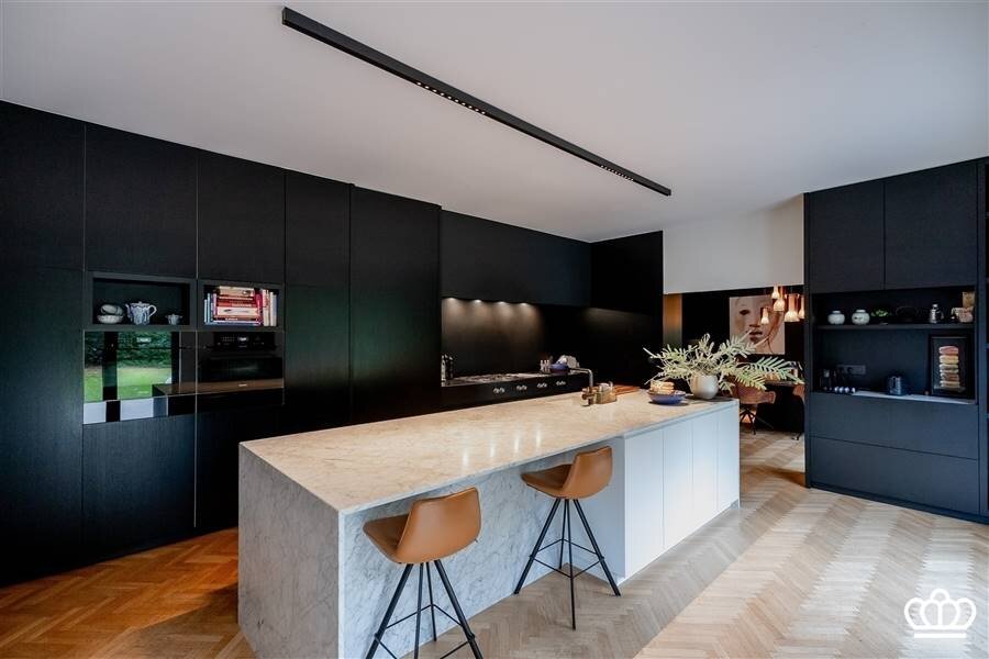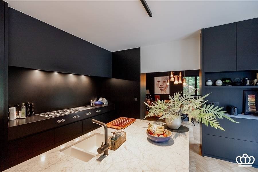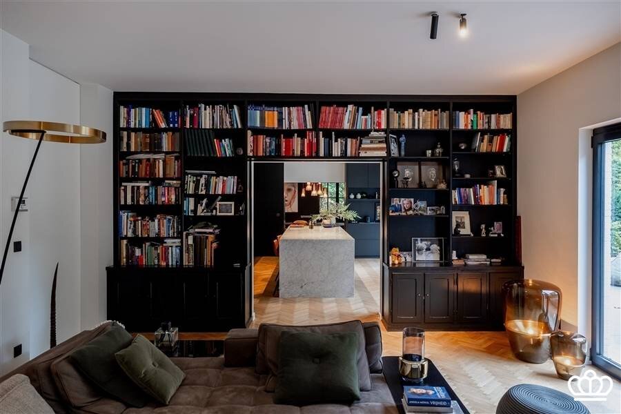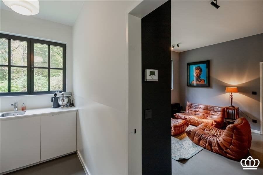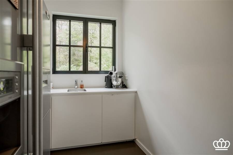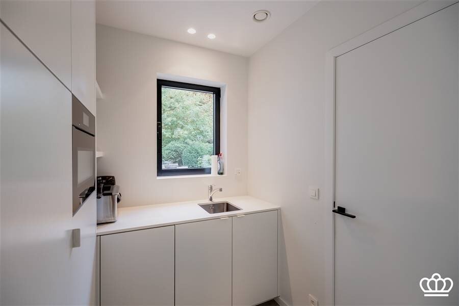 Royale entreehal met vide en gastentoilet. De leefruimtes op visgraatparket bevinden zich aan de achter- / zuidzijde van de villa, onderverdeeld in een gezellige woonkamer met open haard, een volledig ingerichte keuken met eiland en een aparte eetkamer, vanwege de grote ramen genieten deze ruimtes veel lichtinval en bieden directe toegang tot het terras. Achter de keuken bevindt zich een bijkeuken, een speel / TV kamer en een zij-inkomhal met berging.