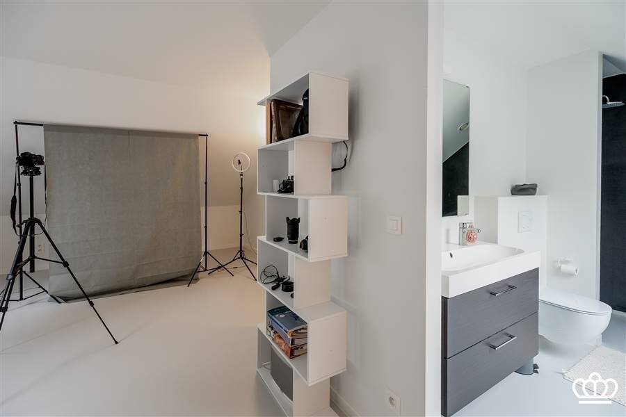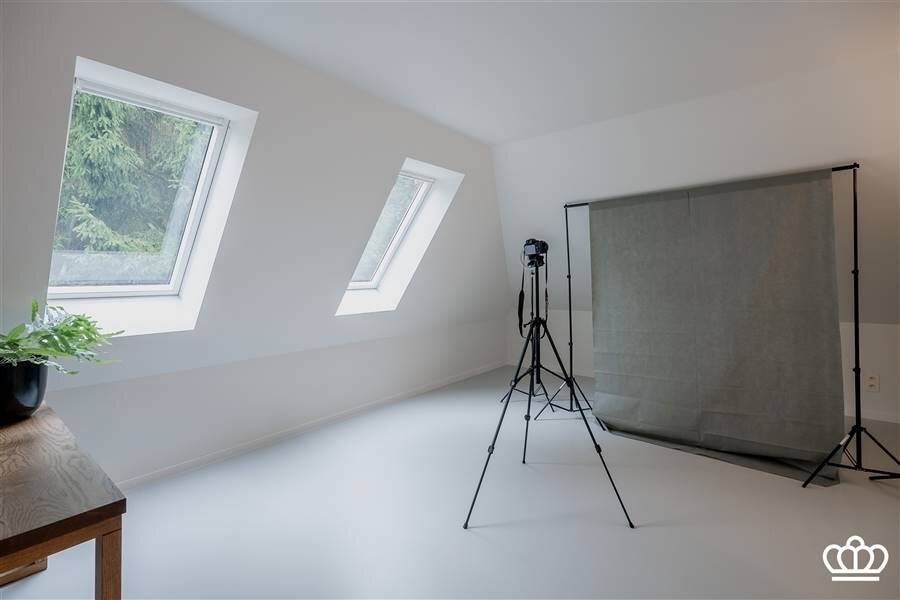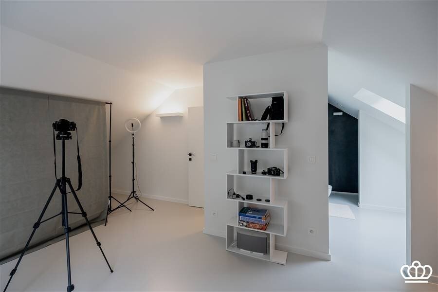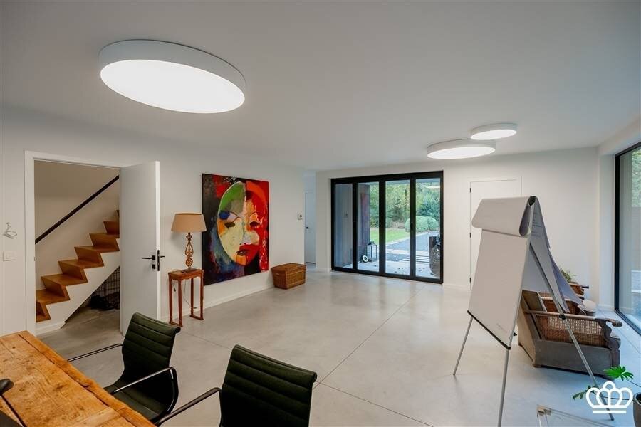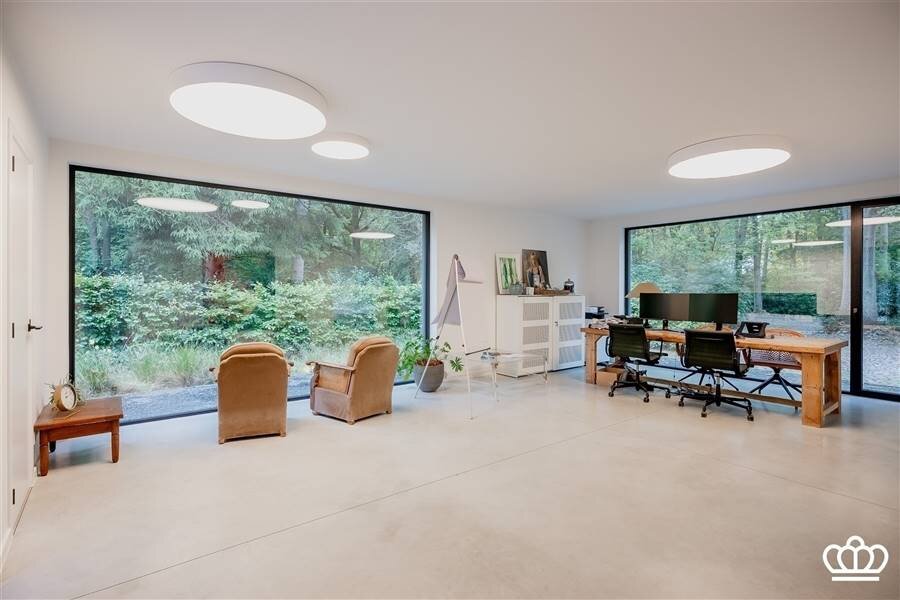 Het grote bureel is bereikbaar zowel via een separate als een interne ingang en beschikt over een kitchenette, een toilet en bergruimte.