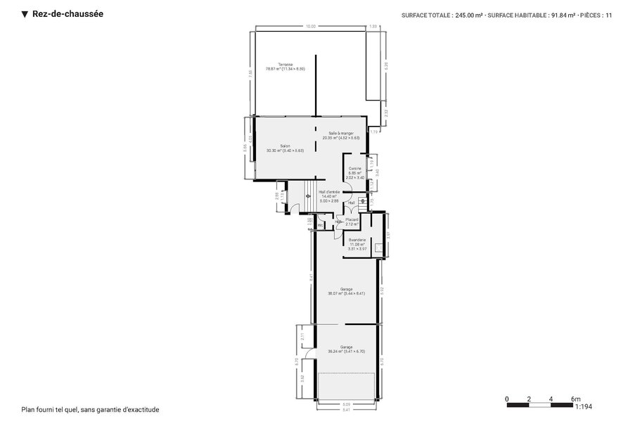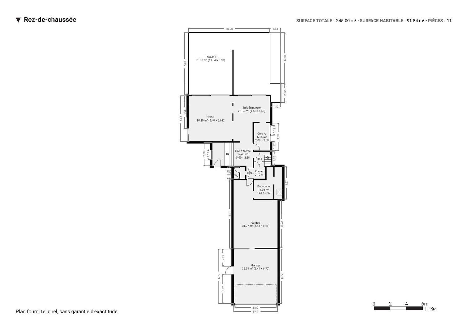 Le rez-de-chaussée se compose d'un hall d'entrée avec WC indépendant, un garage de plus de 70 m², un salon lumineux et climatisé, d’une salle à manger et d’une cuisine entièrement équipée.