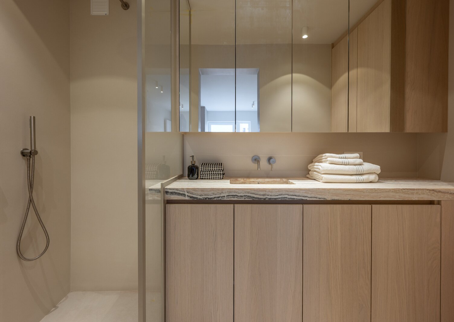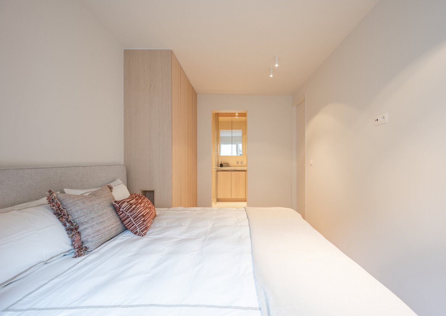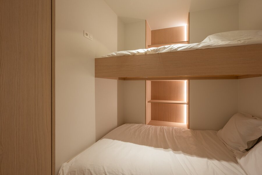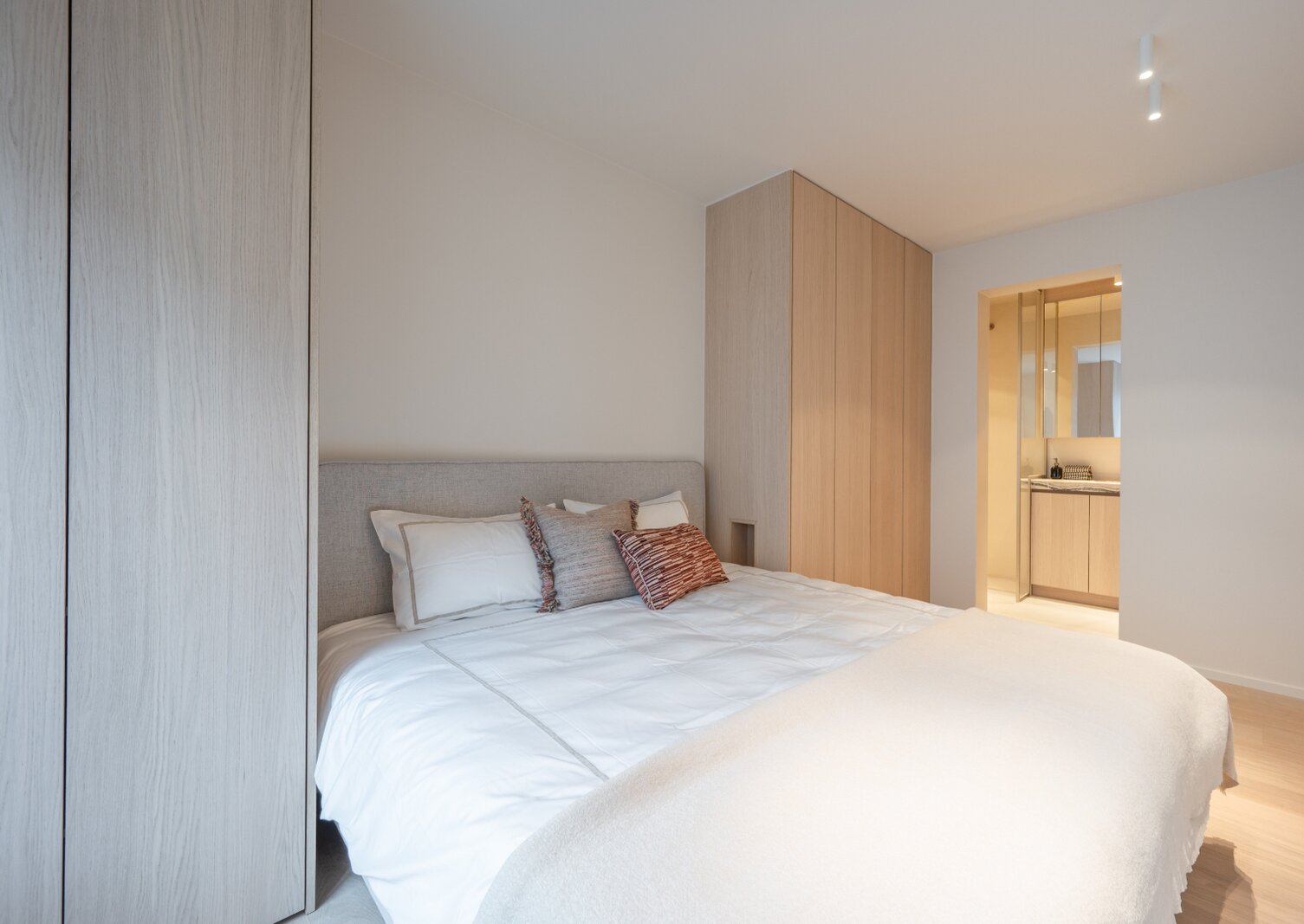 L'appartement dispose de deux chambres à coucher avec placards intégrés et d'une troisième petite chambre. Il y a également deux salles de bains modernes, chacune équipée d'une douche et d'un lavabo.