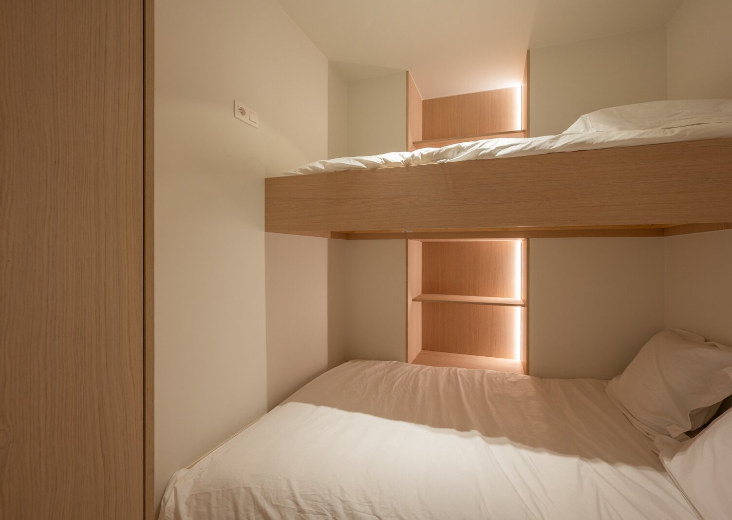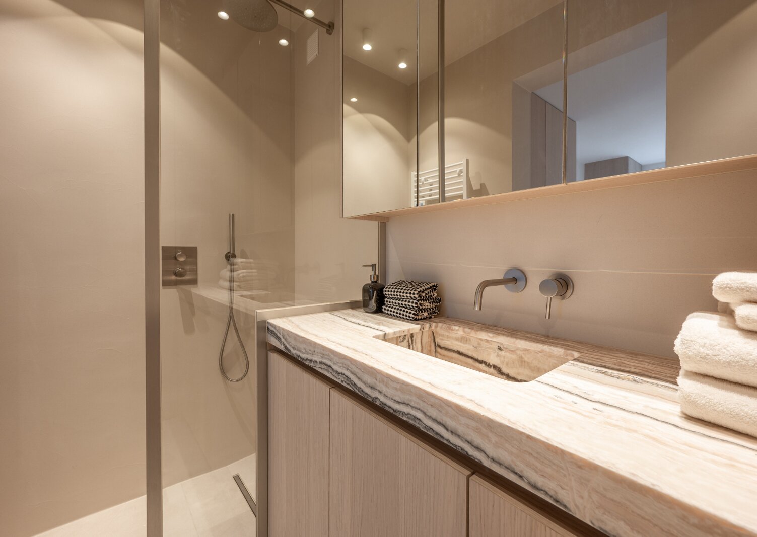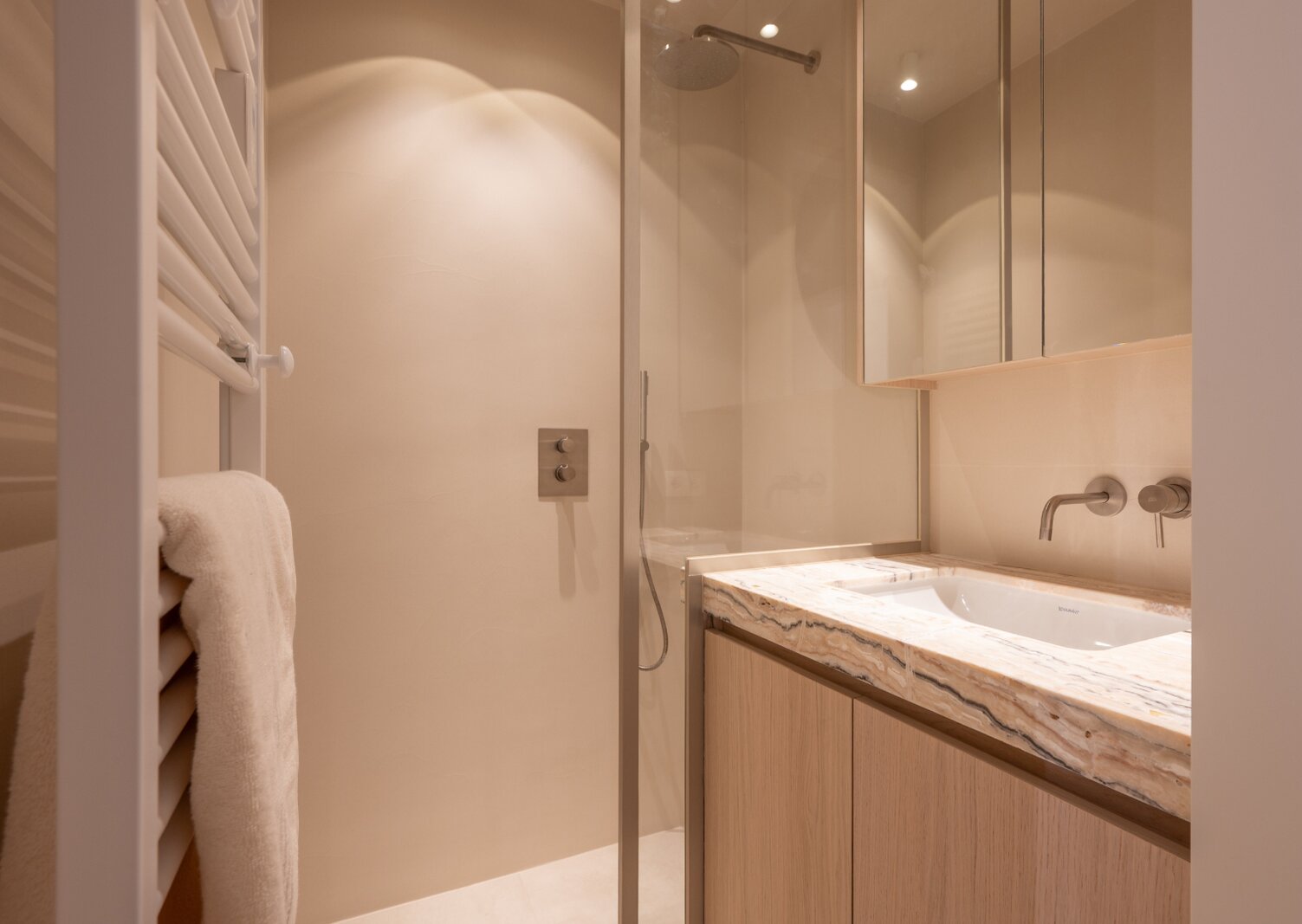 L'appartement dispose de deux chambres à coucher avec placards intégrés et d'une troisième petite chambre. Il y a également deux salles de bains modernes, chacune équipée d'une douche et d'un lavabo.