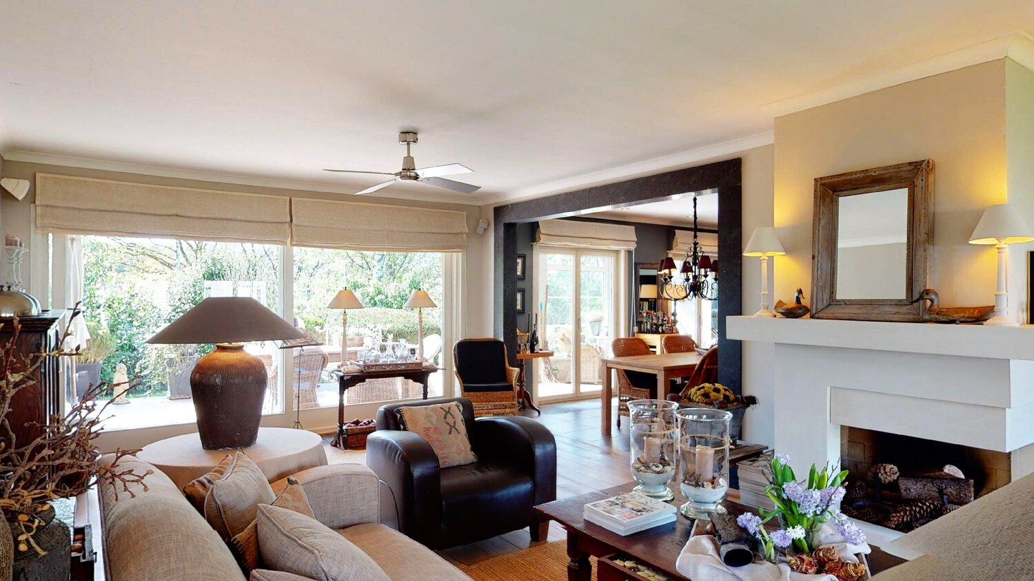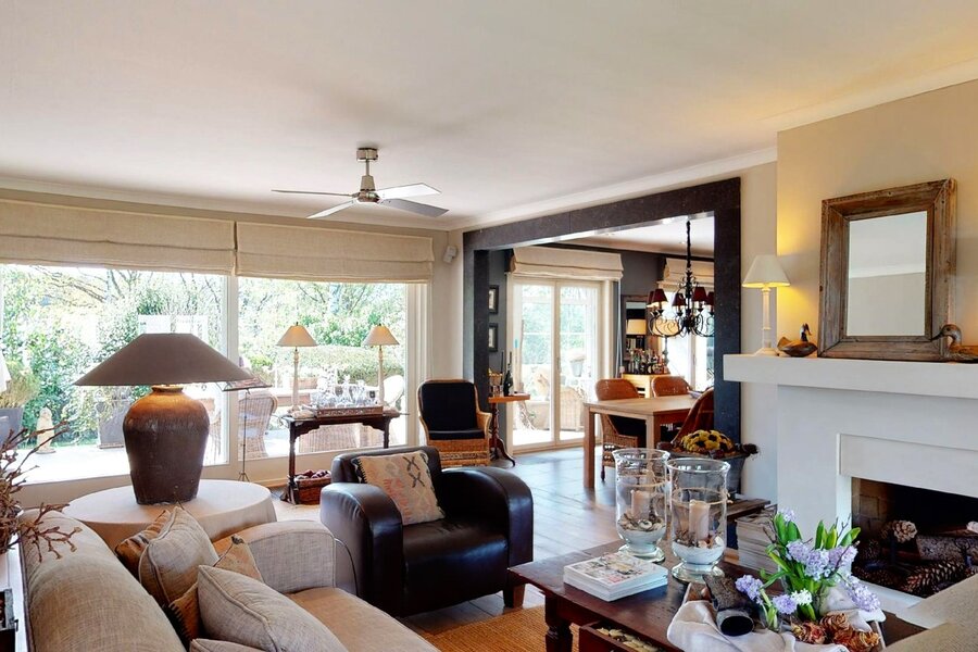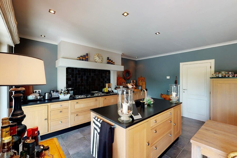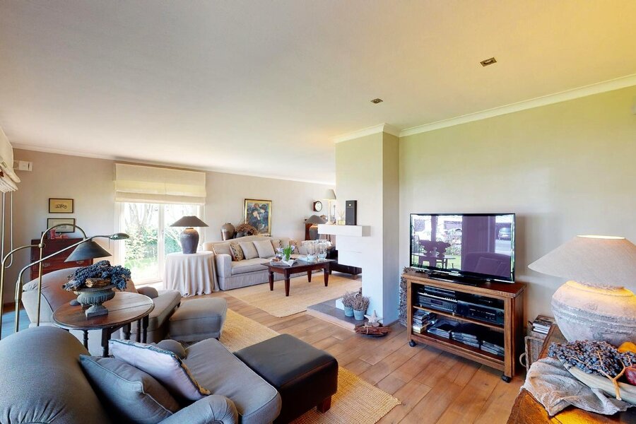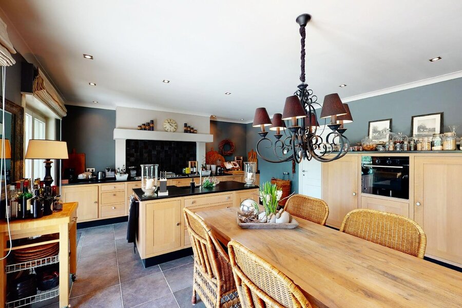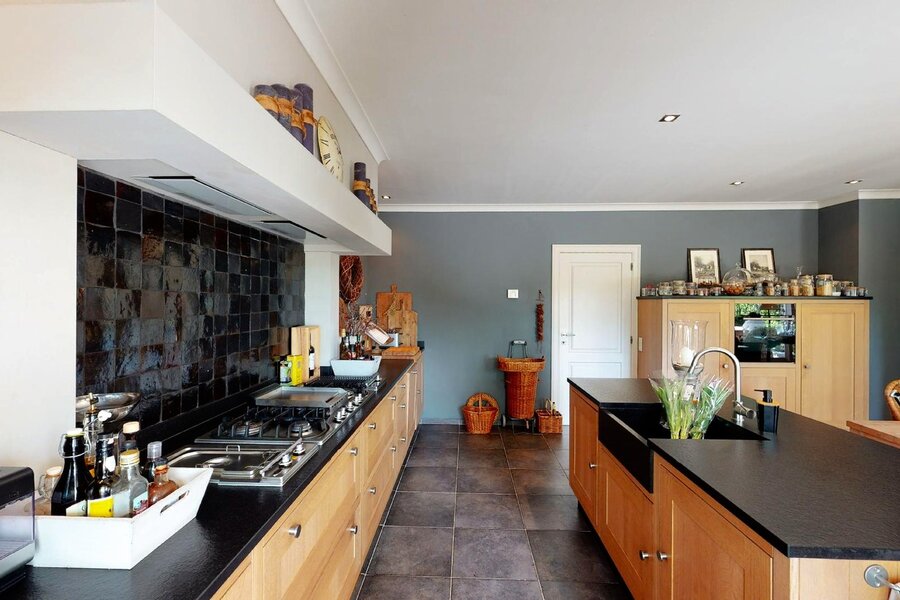 Op de gelijkvloerse verdieping wordt u ontvangen in een royale inkomhal die uitmondt in de verschillende leefruimtes. De leefruimte, voorzien van een gezellig haardvuur, baadt in het daglicht dankzij de grote raampartijen met open zicht op de tuin. De luxueuze open leefkeuken vormt het hart van de woning en is uitgerust met hoogwaardige toestellen, waaronder een professioneel Boretti gasfornuis met meerdere kookzones, geïntegreerde teppanyaki, grill en friteuse, een dubbele dampkap, heteluchtoven, koelkast en vaatwasmachine.
