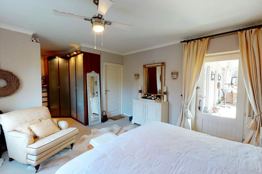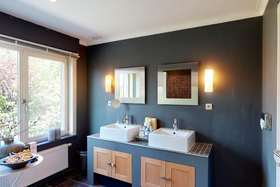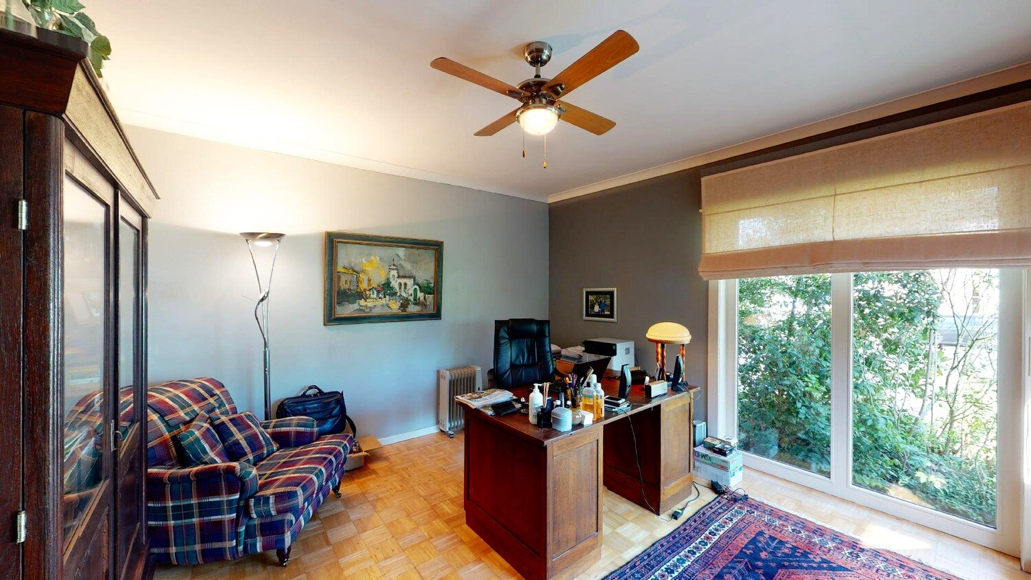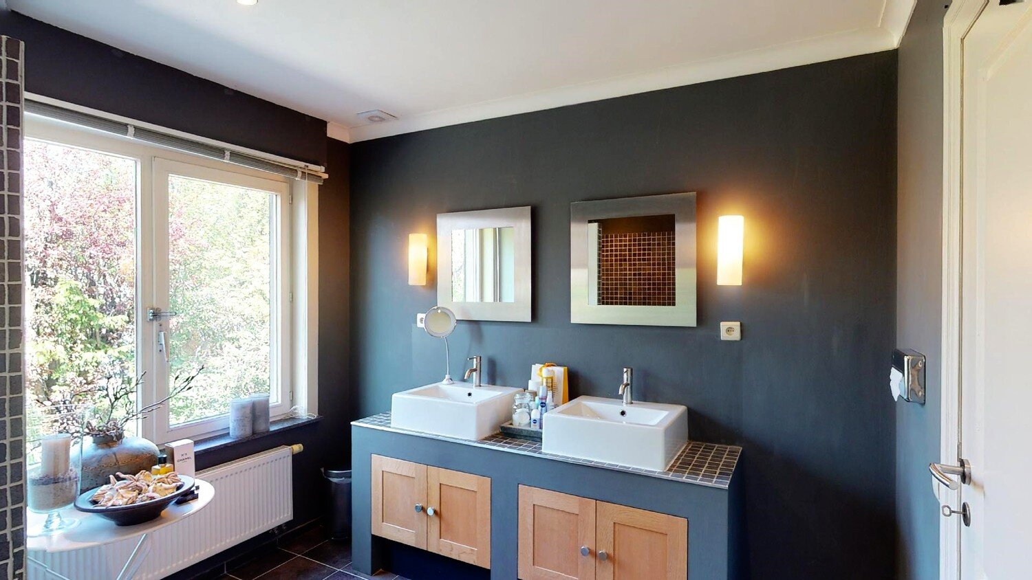 Verder beschikt deze verdieping over twee ruime slaapkamers, waaronder een master suite met dressing en rechtstreekse toegang tot een overdekt terras. De tweede kamer is momenteel ingericht als bureauruimte, ideaal voor wie wonen en werken wil combineren. De ruime badkamer straalt comfort en kwaliteit uit en is voorzien van een dubbele wastafel en een royale inloopdouche. Een apart gastentoilet vervolledigt het geheel.