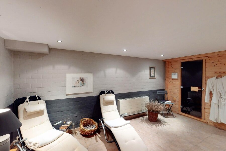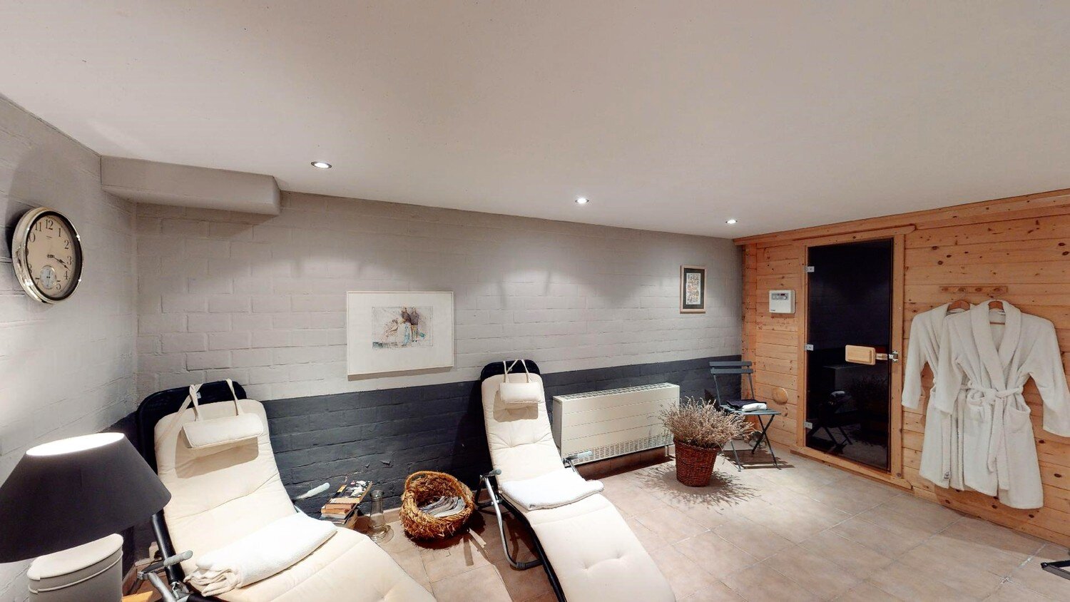 De bungalow is volledig onderkelderd en herbergt een ware privébeleving. Deze verdieping omvat onder meer een wellnessruimte met Finse sauna voor vier personen en spa bad, een stijlvol ingerichte wijnkelder, een polyvalente ruimte die perfect dienst kan doen als gastenverblijf, een praktische was- en bergruimte, technische lokalen en een inpandige garage met plaats voor twee wagens.