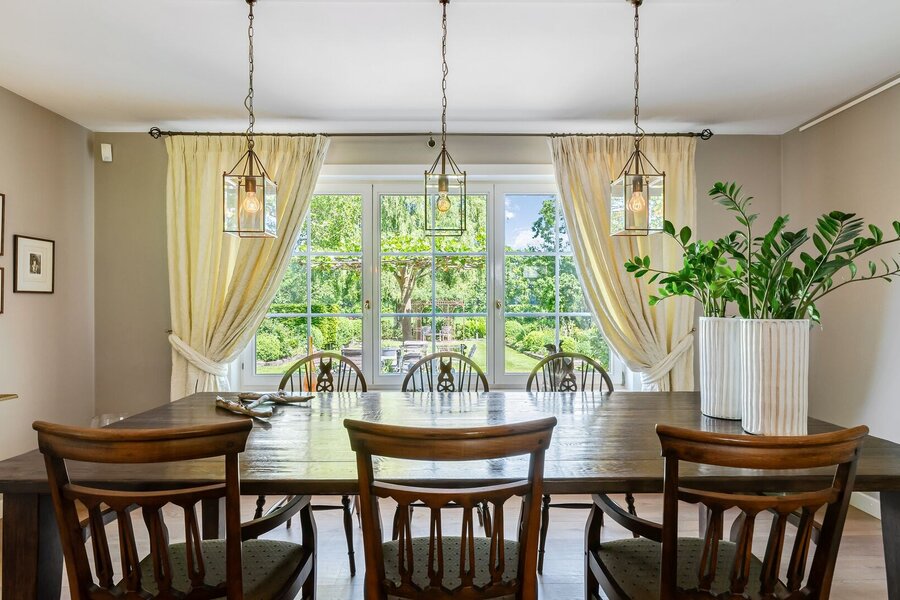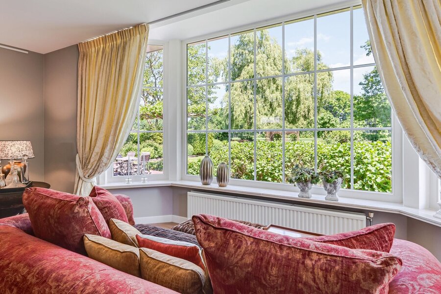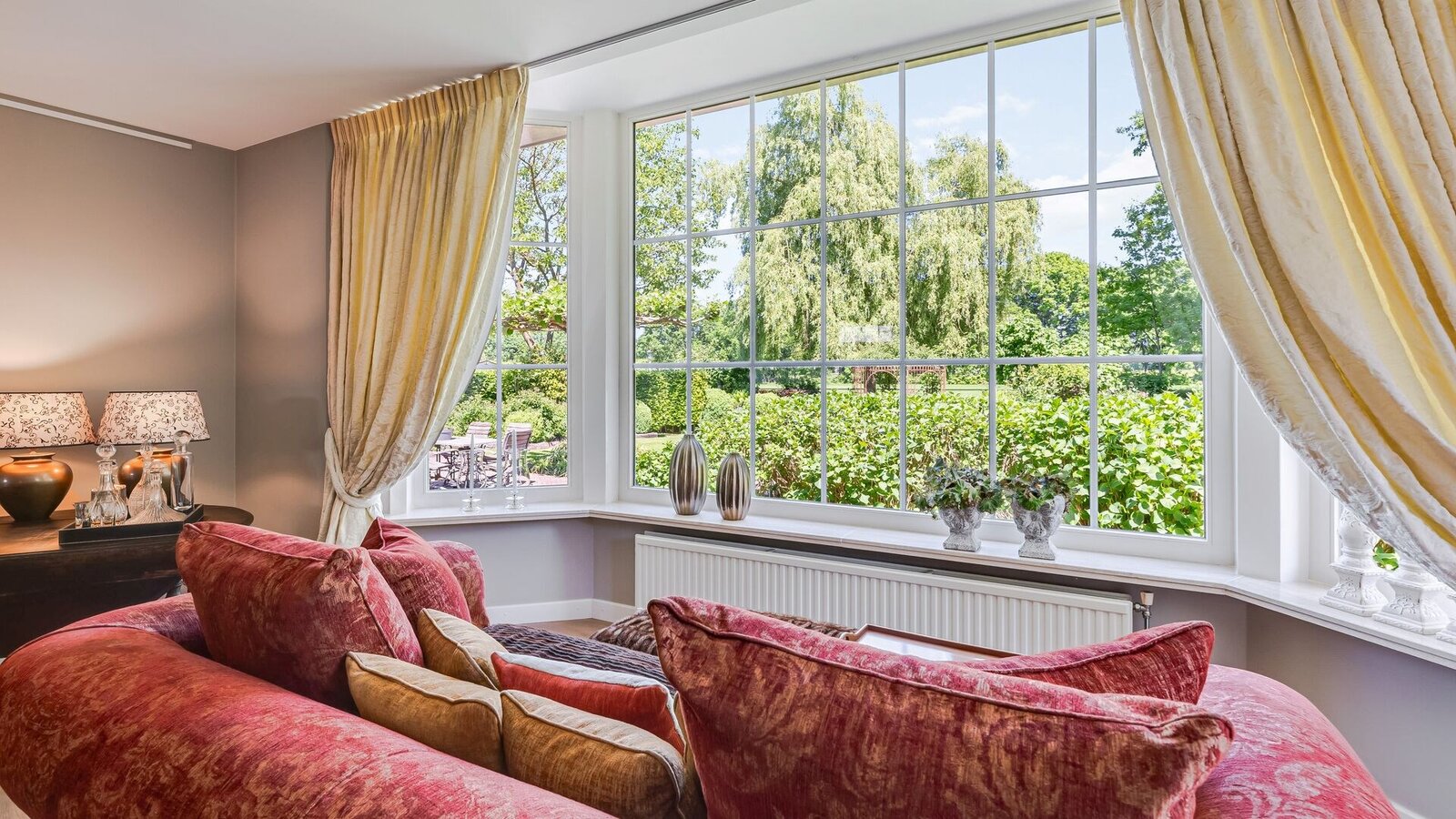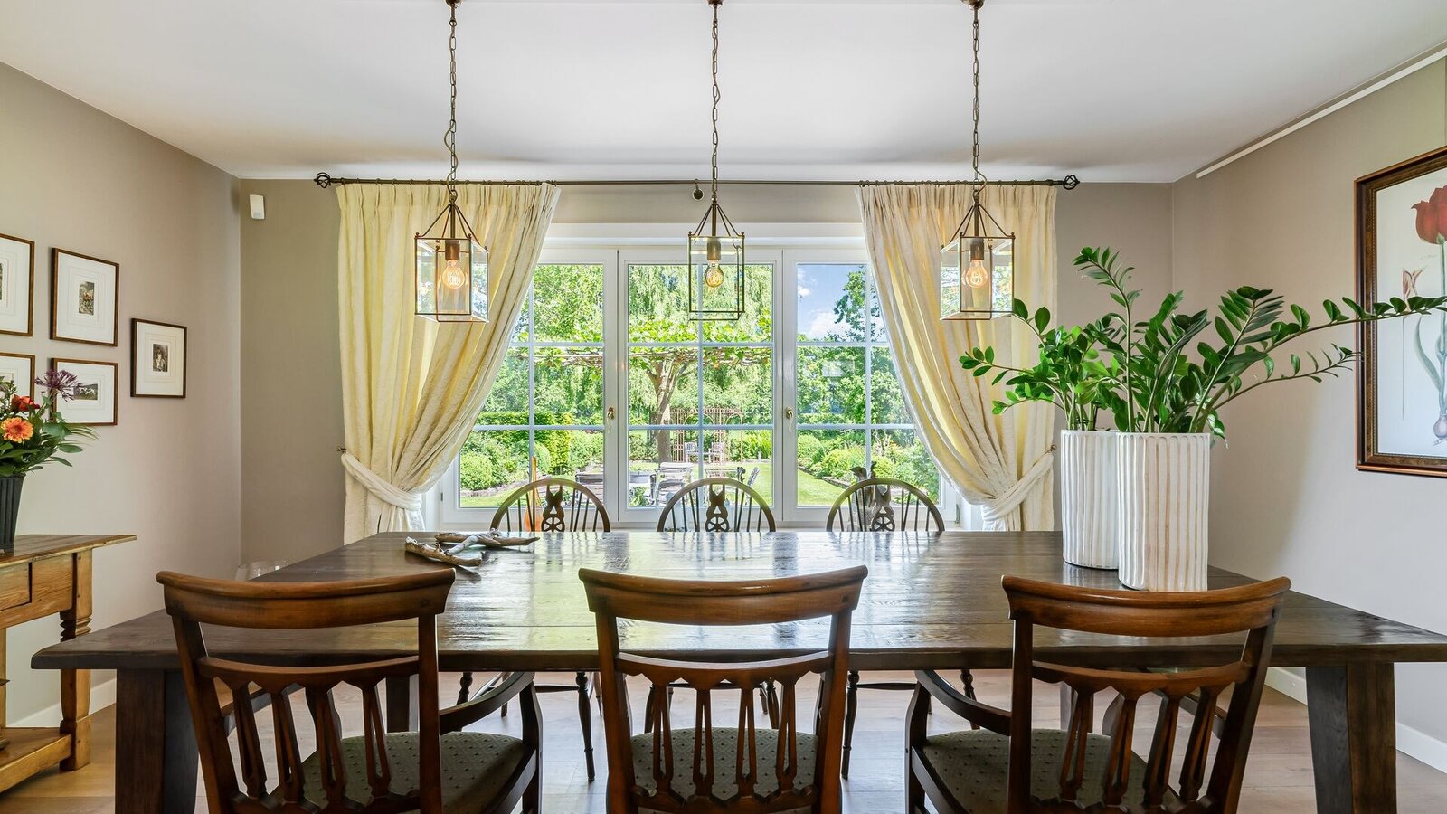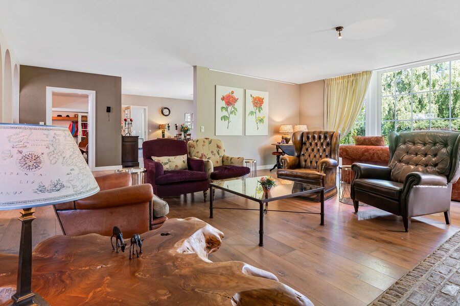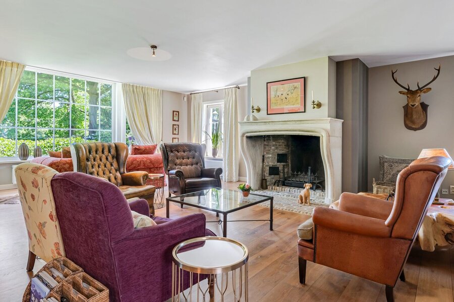 De deuren bieden vanuit deze hal toegang tot de verschillende ruimten. Zo treft u een gastentoilet met tussenruimte, geschikt als vestiaire. Aan de rechterkant bevinden zich de leefruimten, met o.a. een schitterende eetkamer en twee gezellige zithoeken waarvan 1 met grote open haard. Deze leefruimten beschikken allen over een massief eiken parketvloer, grote raampartijen met mooi zicht naar de tuin.