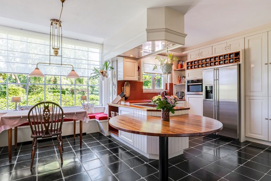 Vanuit de centrale inkomhal hebt u toegang tot de riante woonkeuken, compleet ingericht met toestellen, gezellige eethoek en voldoende kastruimte.