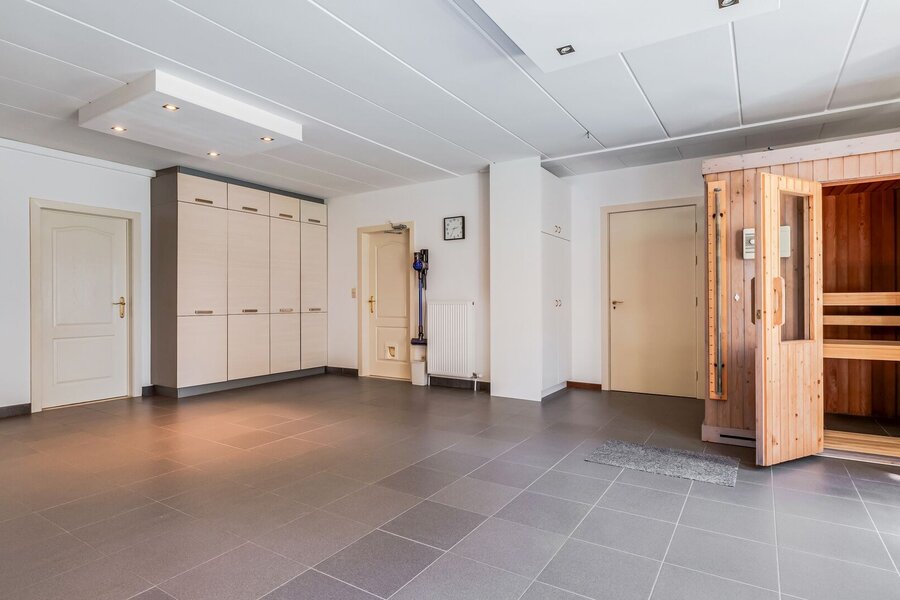 Verder bevindt zich op het gelijkvloers een dubbele inpandige garage, momenteel ingericht als multifunctionele ruimte met sauna en veel opslagmogelijkheden. Inclusief extra werkplaats en aparte technische ruimte. Ideaal voor ontspanning, hobby's en praktische toepassingen.