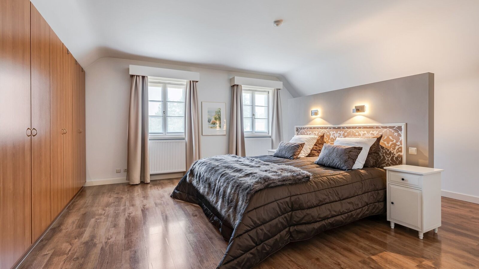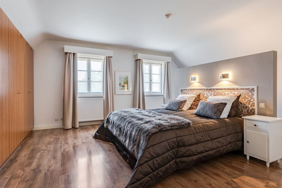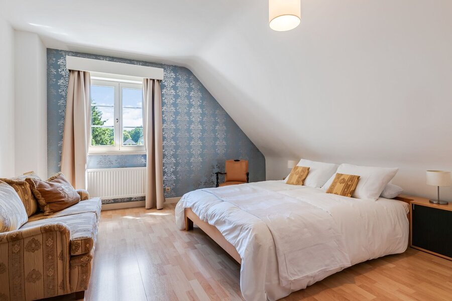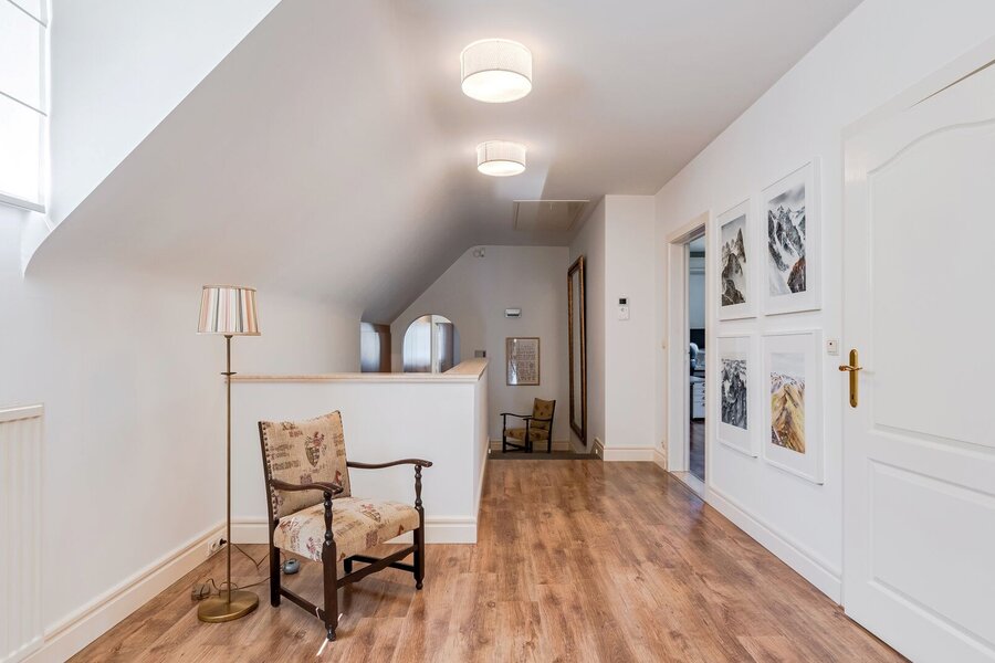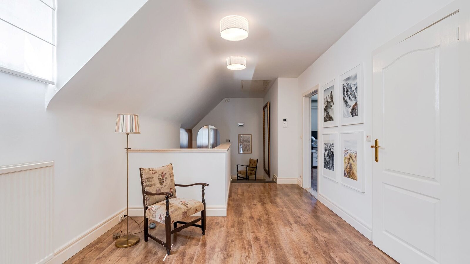 De stijlvolle trap brengt u vanuit de centrale inkomhal naar de bovenliggende verdieping. De ruime overloop geeft toegang tot de sfeervolle mastersuite met eigen badkamer. De badkamer is voorzien van een ligbad, douche, toilet en dubbele wastafel in meubel.