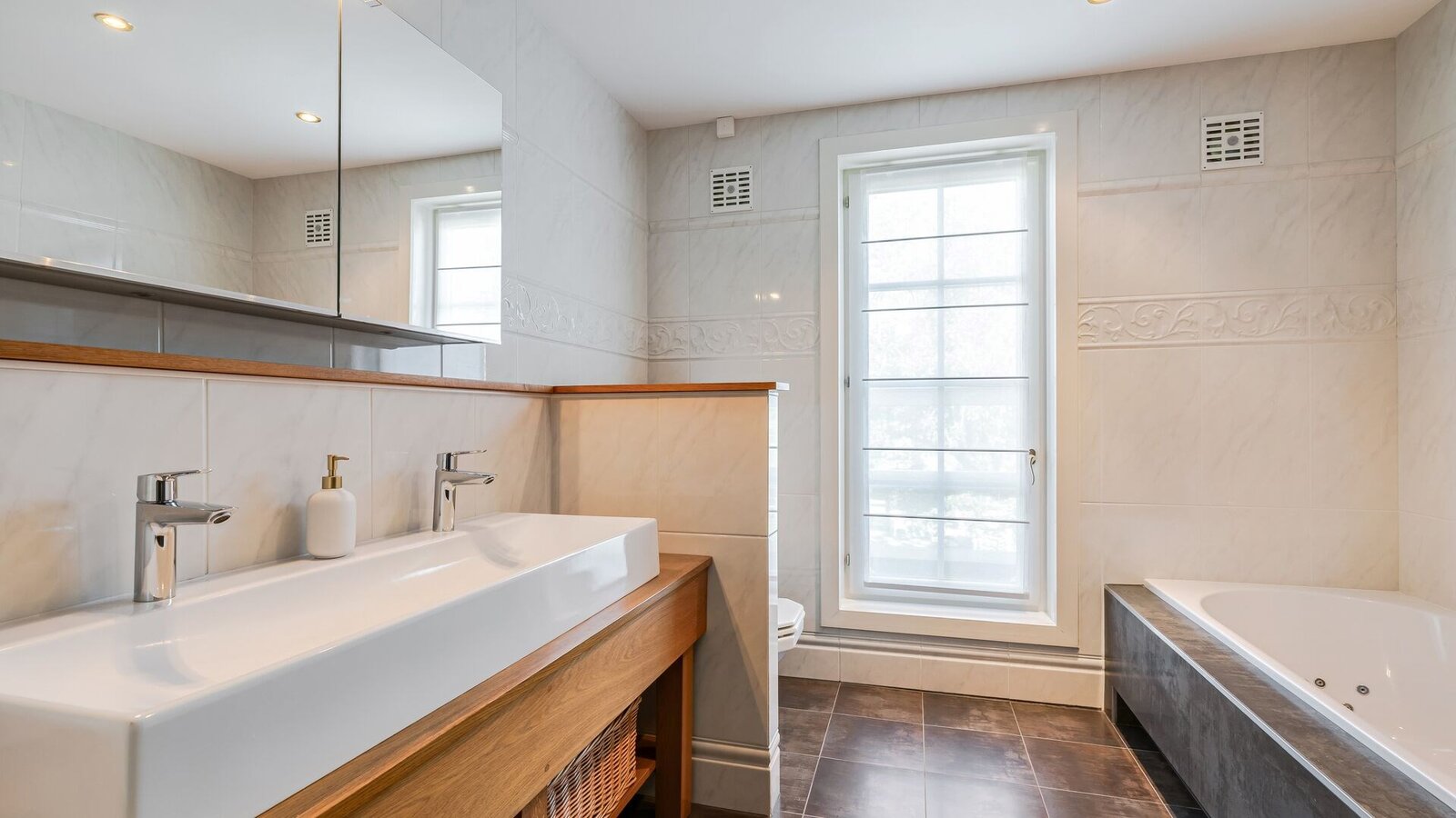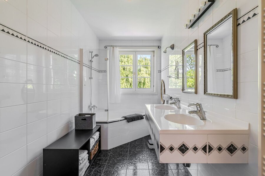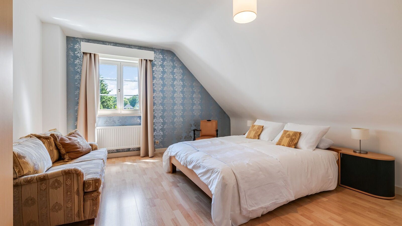 De stijlvolle trap brengt u vanuit de centrale inkomhal naar de bovenliggende verdieping. De ruime overloop geeft toegang tot de sfeervolle mastersuite met eigen badkamer. De badkamer is voorzien van een ligbad, douche, toilet en dubbele wastafel in meubel.