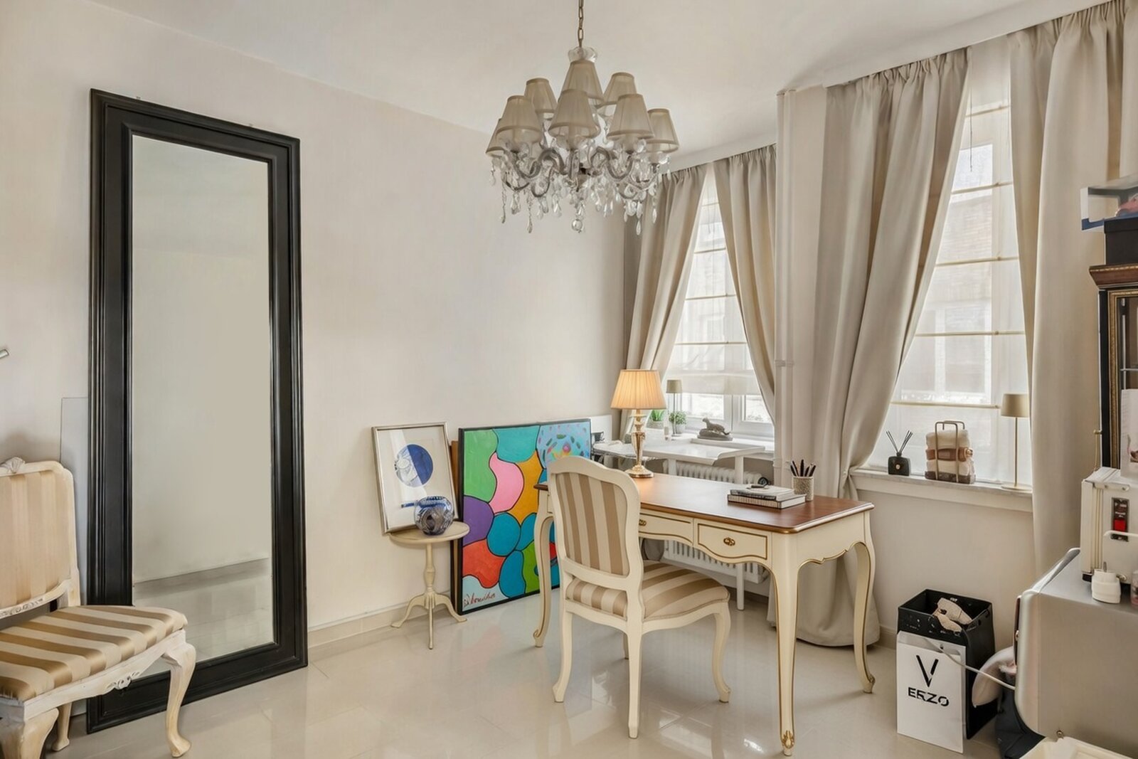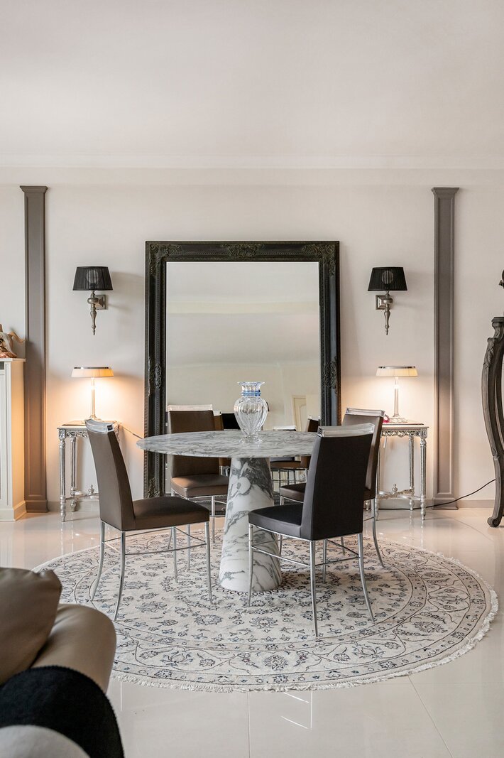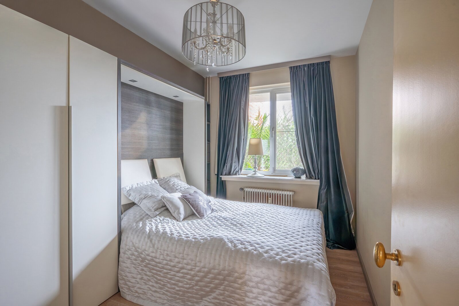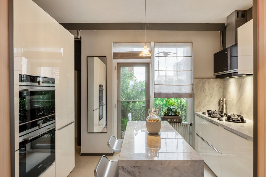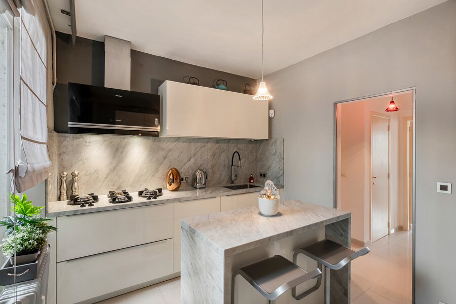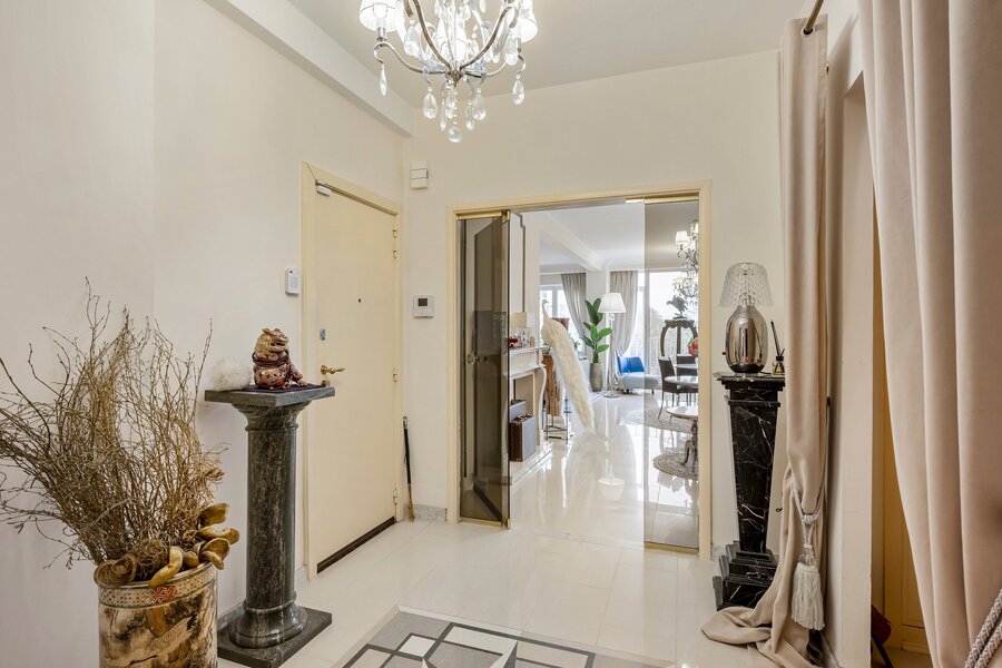 - Hoogwaardige afwerking met natuursteen doorheen het appartement