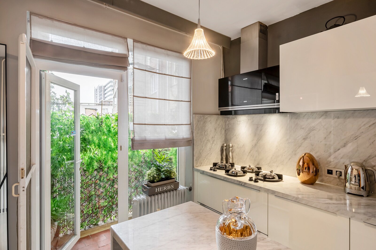 - Volledige maatwerkkeuken uit 2021 met marmeren werkblad, hoogwaardige Siemens toestellen (2 combi-ovens, PITT cooking gasfornuis, dampkap, vaatwasser, koelkast en vriezer), geïntegreerde spoelbak en ontbijthoek