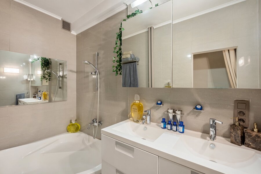 - Volledig ingerichte badkamer met dubbele wastafel en hoekbad