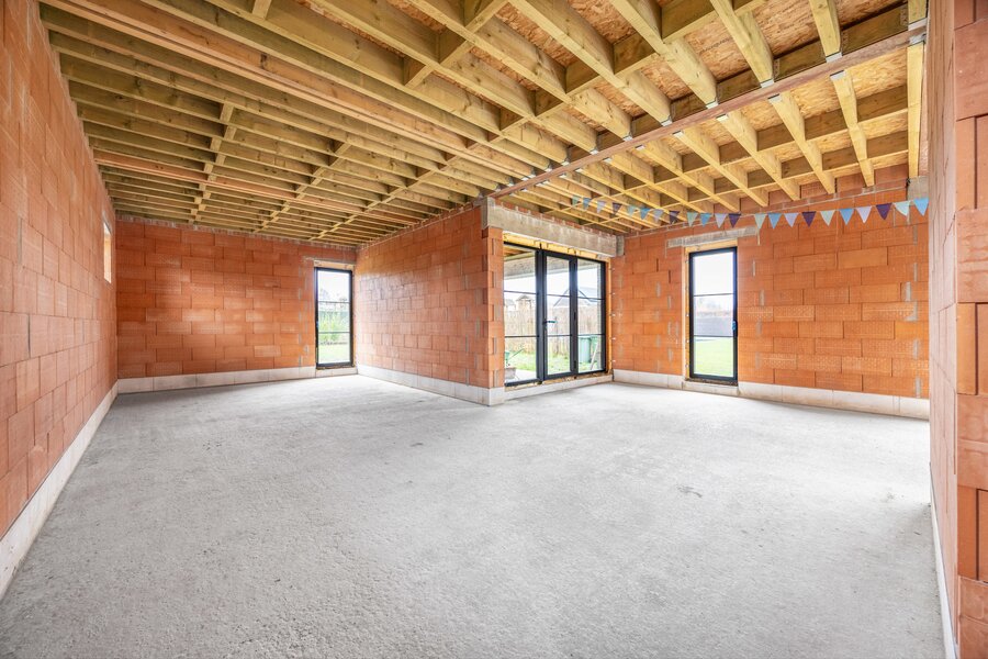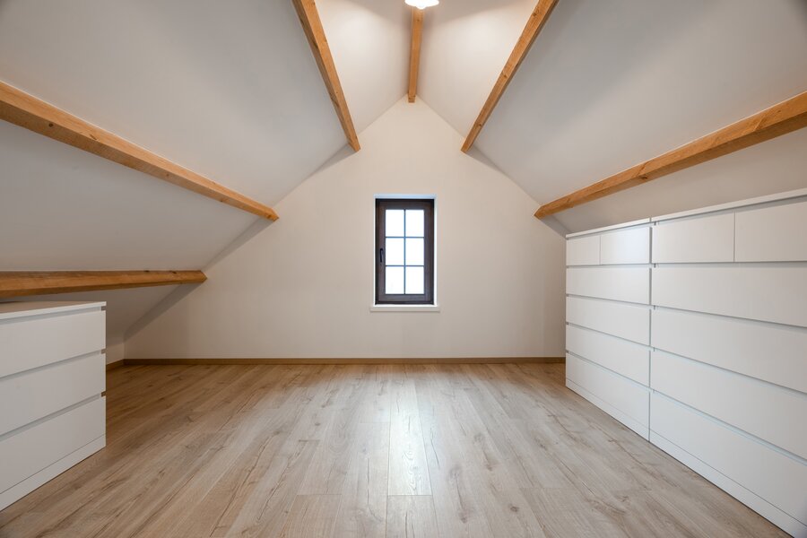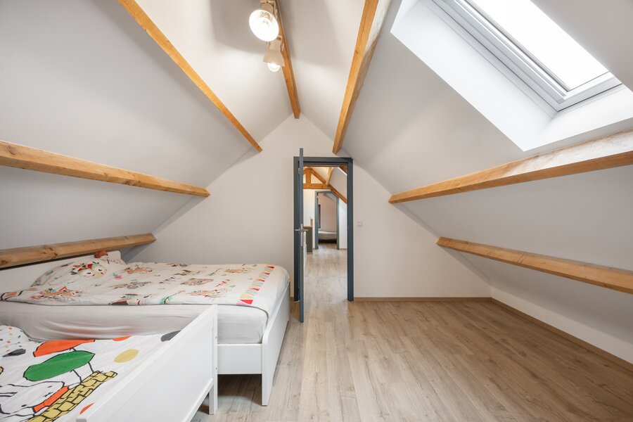 De zolder en grote raampartijen bieden tal van mogelijkheden: een open leefruimte, een gezellige zithoek met haard of een ruime leefkeuken…