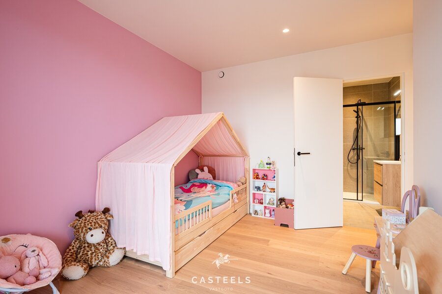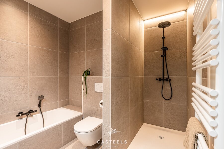 De volledig op maat gemaakte keuken is hypergeïnstalleerd en uitgerust met kwalitatieve toestellen van Bora en Siemens, perfect geïntegreerd in het geheel. Het penthouse beschikt over twee volwaardige slaapkamers, elk ingericht als suite met ensuite badkamer en dressing, wat een aangenaam en comfortabel woonniveau creëert. Daarnaast is er een afzonderlijk bureau met maatwerk, ideaal voor thuiswerk of als polyvalente ruimte. Verder zijn er twee toiletten, waaronder een gastentoilet in de inkomhal met op maat gemaakte vestiairekast. Ook technisch is dit pand volledig toekomstgericht. Verwarming en koeling verlopen via een warmtepomp, aangevuld met airconditioning, een Renson-ventilatiesysteem, zes privatieve zonnepanelen, een waterverzachter en een EPC A-label. Het appartement is volledig geschilderd en verkeert in perfecte nieuwstaat.