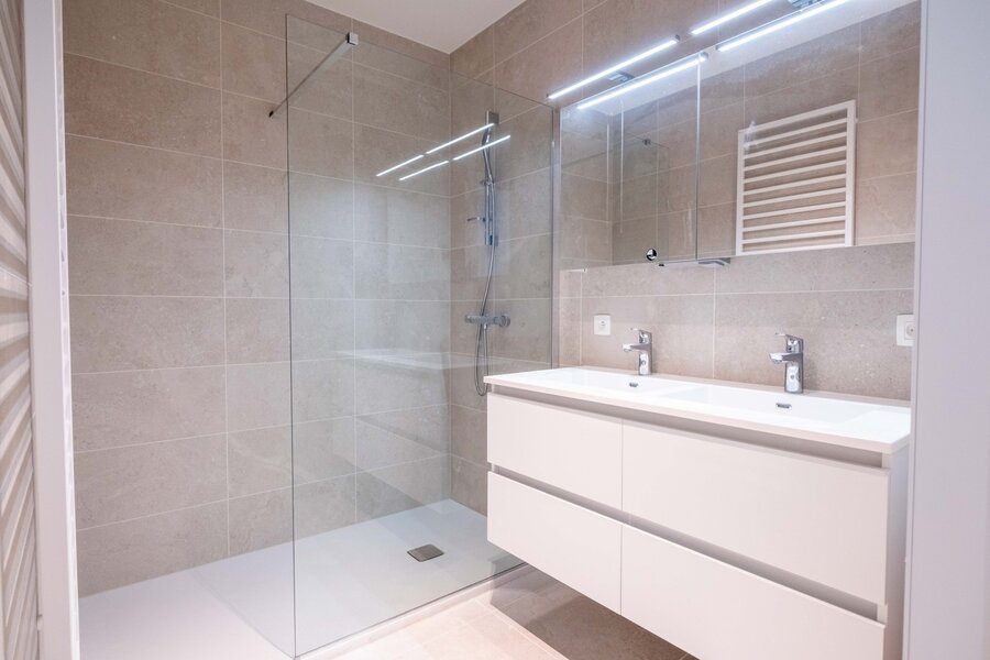 De open keuken is volledig uitgerust en vormt een harmonieus geheel met de leefruimte. De twee volwaardige slaapkamers bieden opnieuw een ongeëvenaarde zicht over de kuststad. De stijlvolle badkamer is voorzien van een moderne inloopdouche en dubbele lavabo. Tot slot nodigt het ruime terras uit om te genieten van de zon en het spectaculaire uitzicht, op elk moment van de dag.