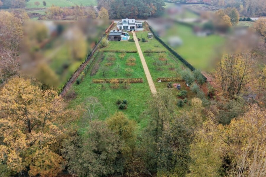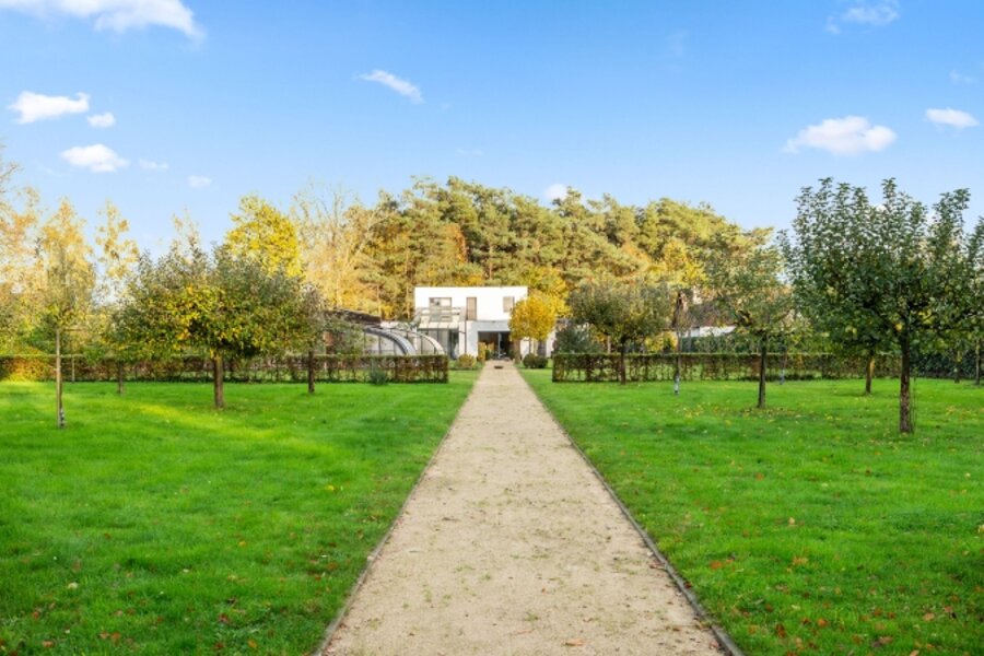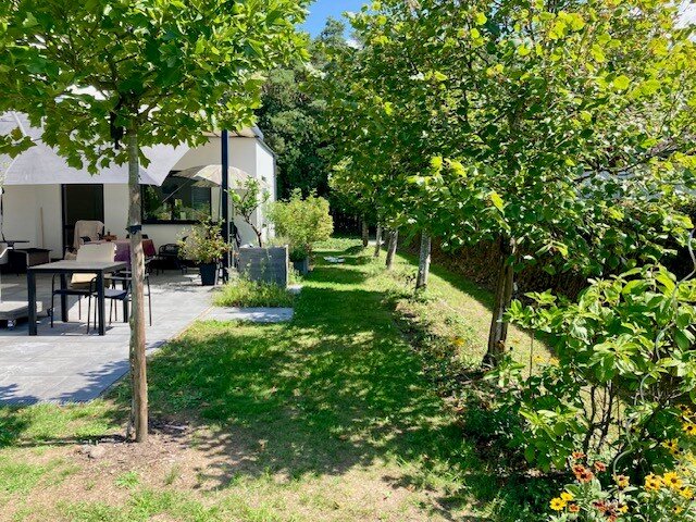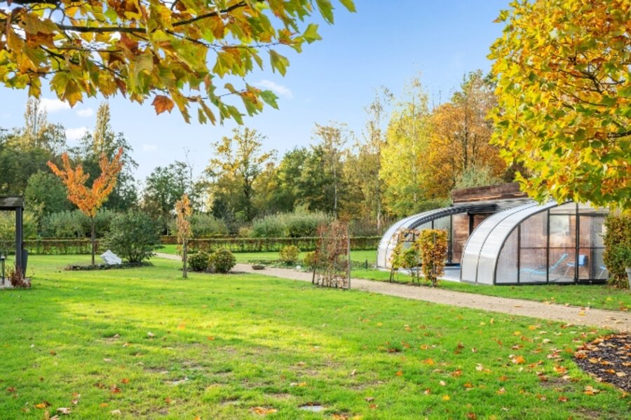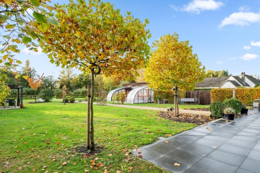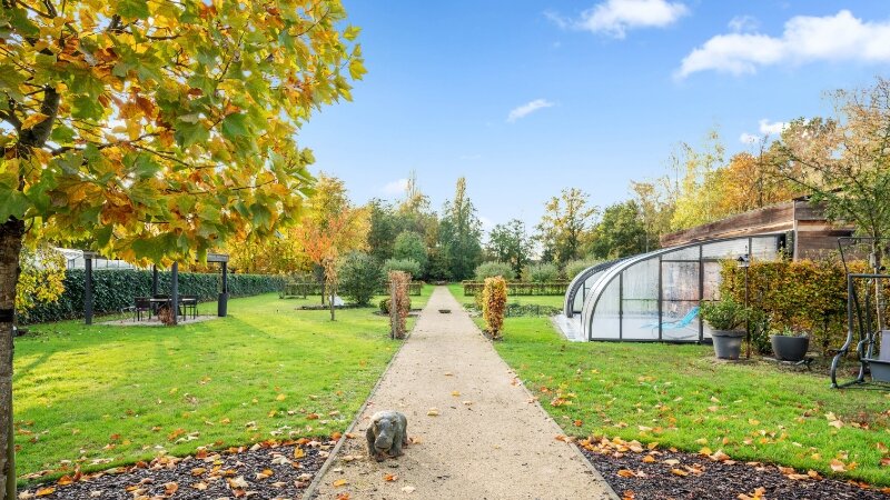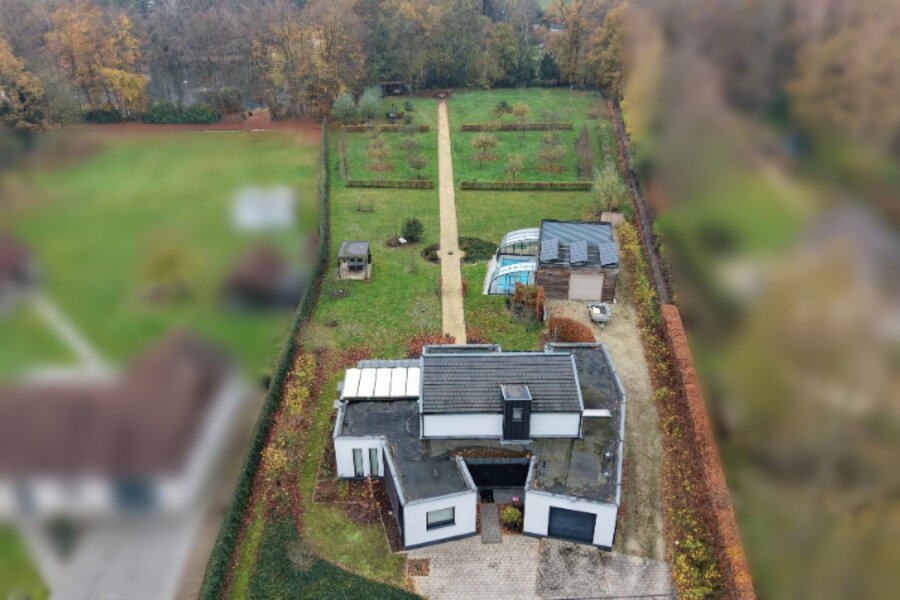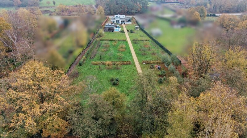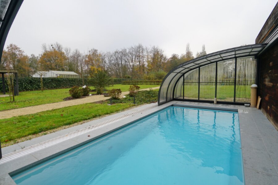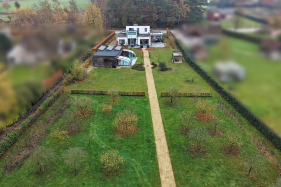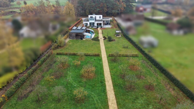 Moderne villa op een mooi perceel van 58 are met mooie aangelegde tuin met o.a. fruitbomen en met een openluchtzwembad (verwarmd met warmtepomp, met verplaatsbare telescopische hoge overkapping, rolluik, douche en toilet), zeer grote terrassen en pergola in de tuin.