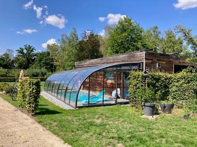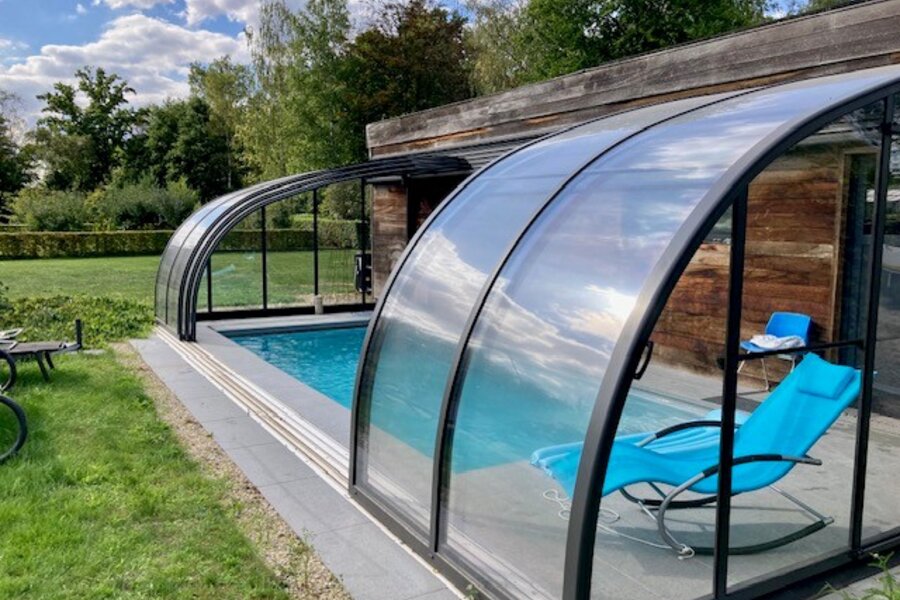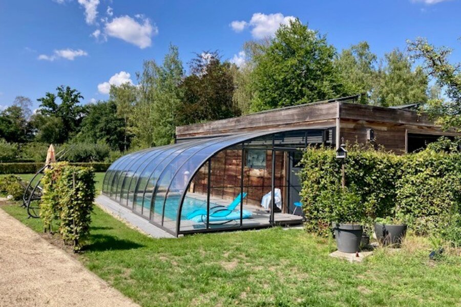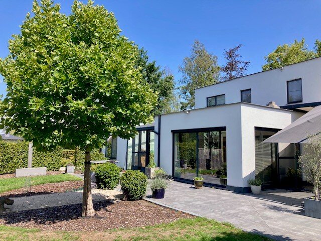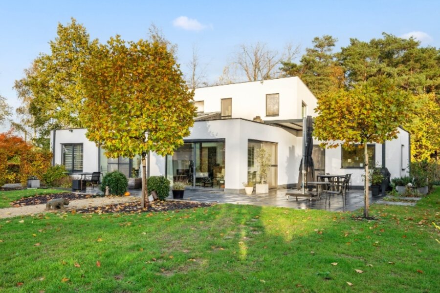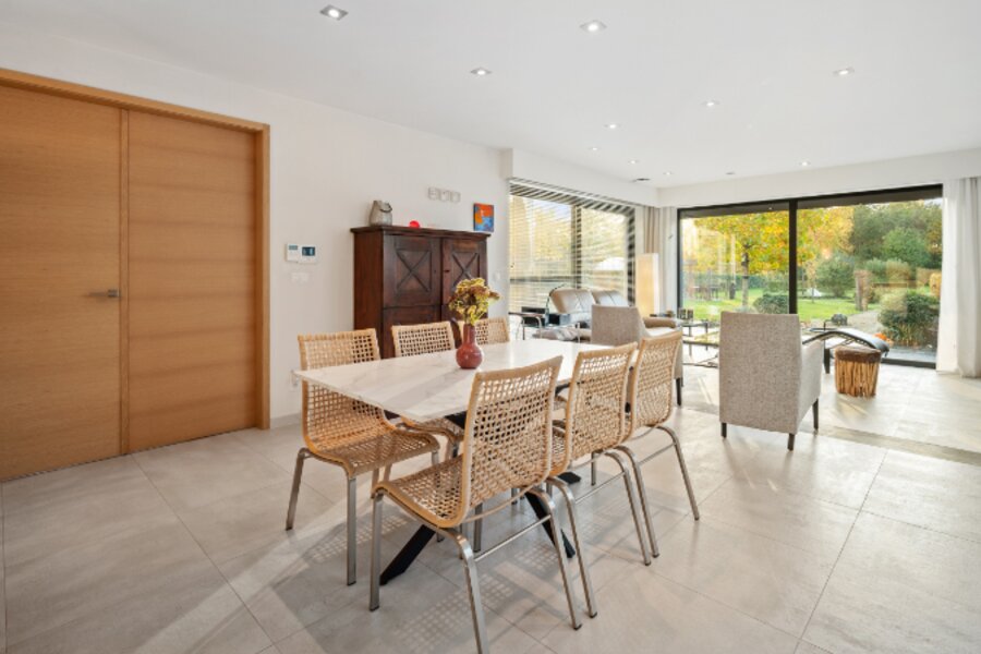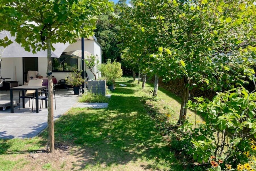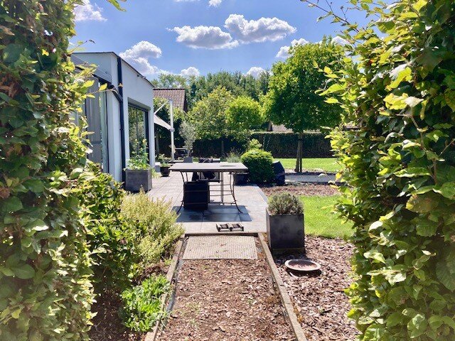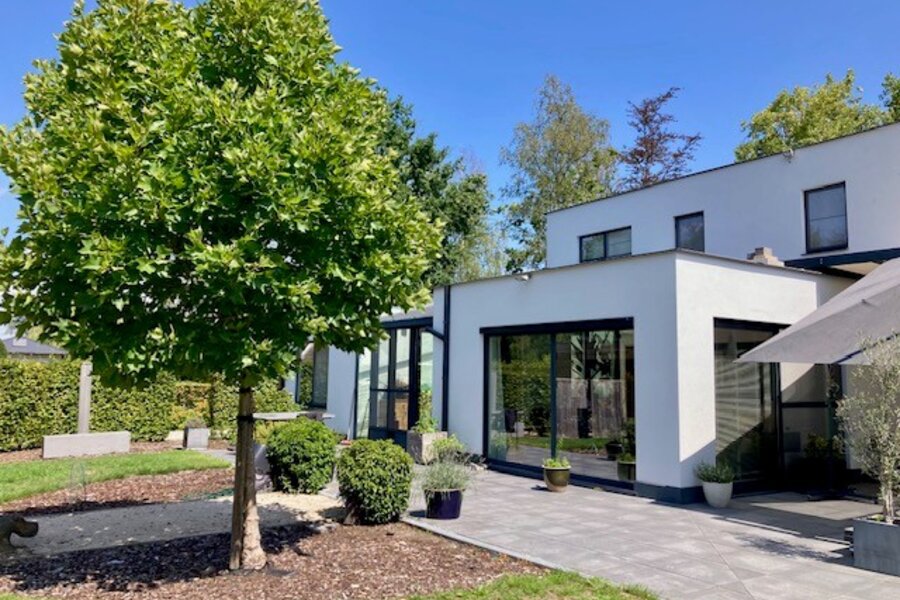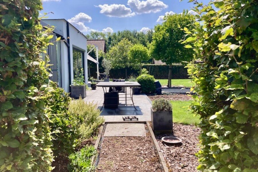 Moderne villa op een mooi perceel van 58 are met mooie aangelegde tuin met o.a. fruitbomen en met een openluchtzwembad (verwarmd met warmtepomp, met verplaatsbare telescopische hoge overkapping, rolluik, douche en toilet), zeer grote terrassen en pergola in de tuin.