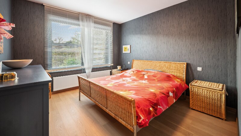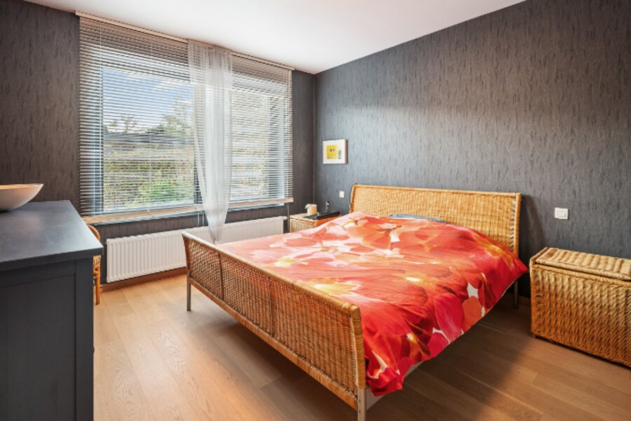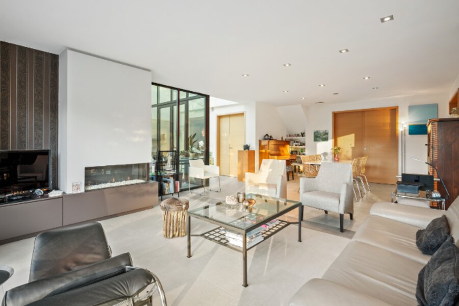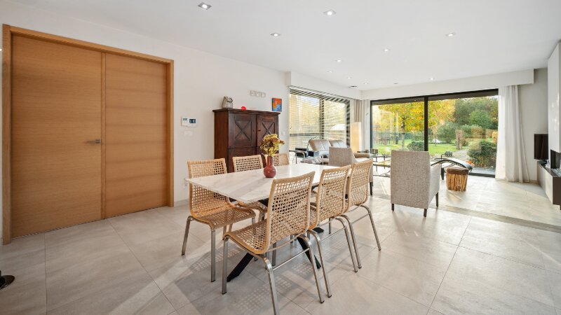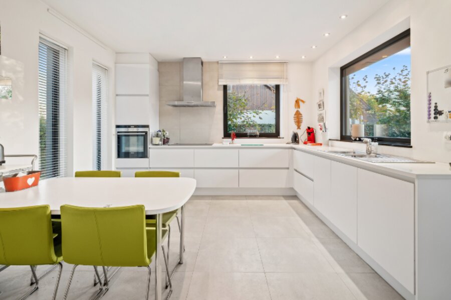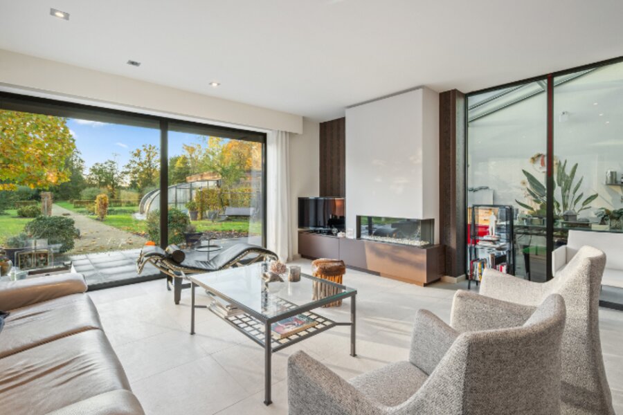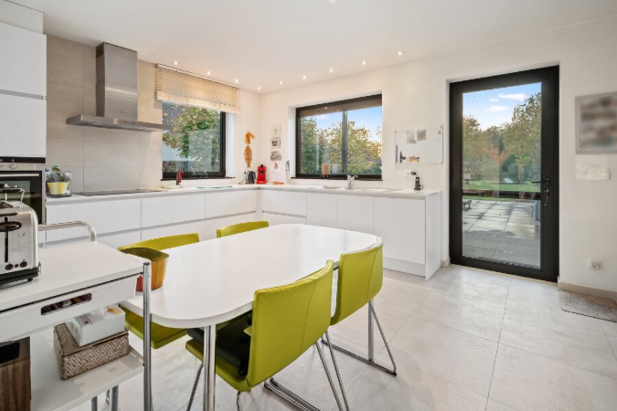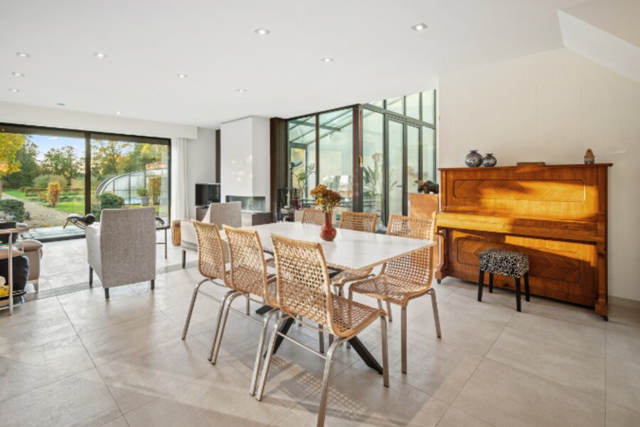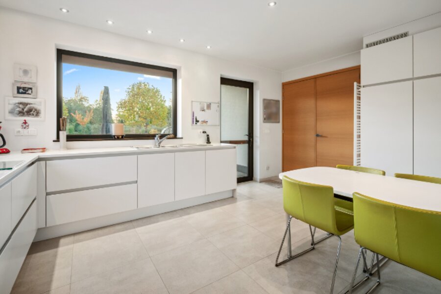 Omvat: inkomhal, gastentoilet met wastafel, vestiaire, lichtrijke living met gashaard + orangerie-veranda, volledig ingerichte keuken 21m² met eethoek en handdoek droger, koele berging, wasplaats, inpandige garage met sectionale poort,