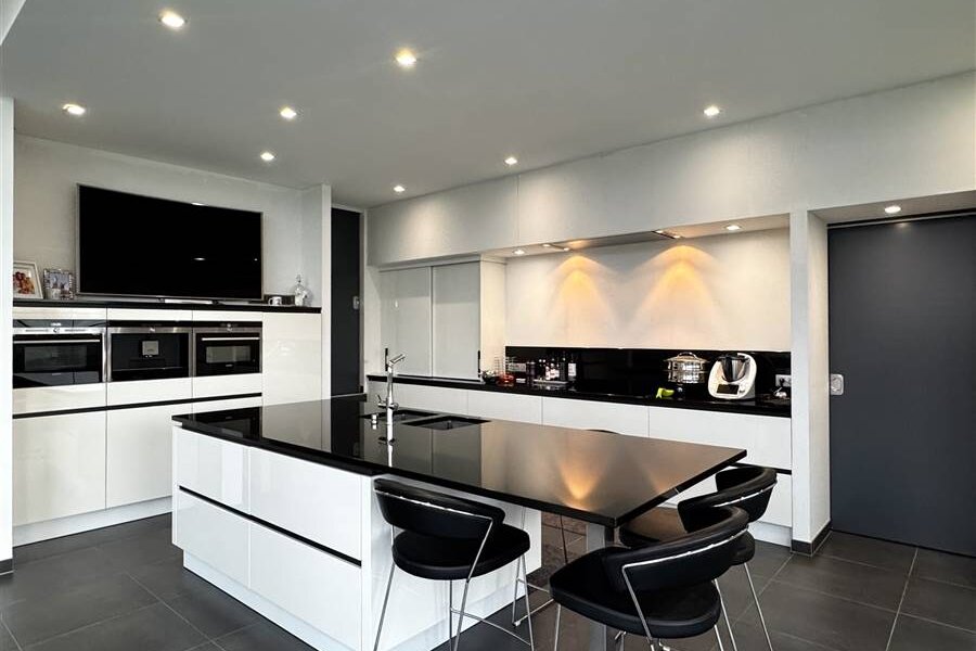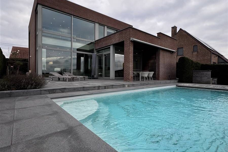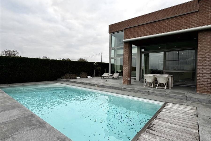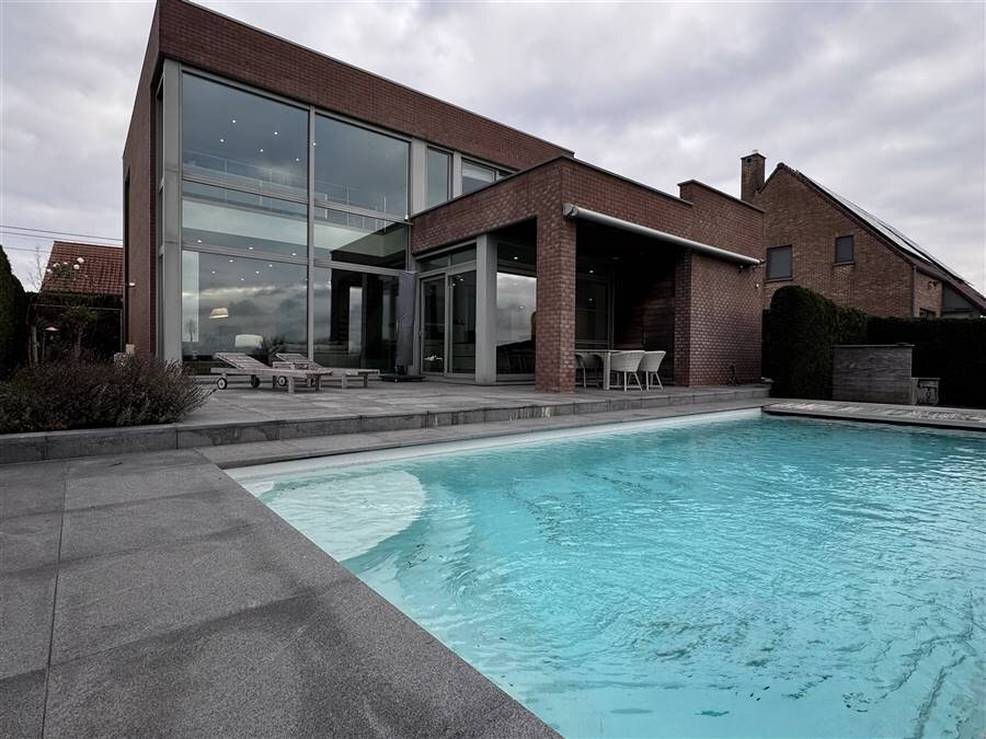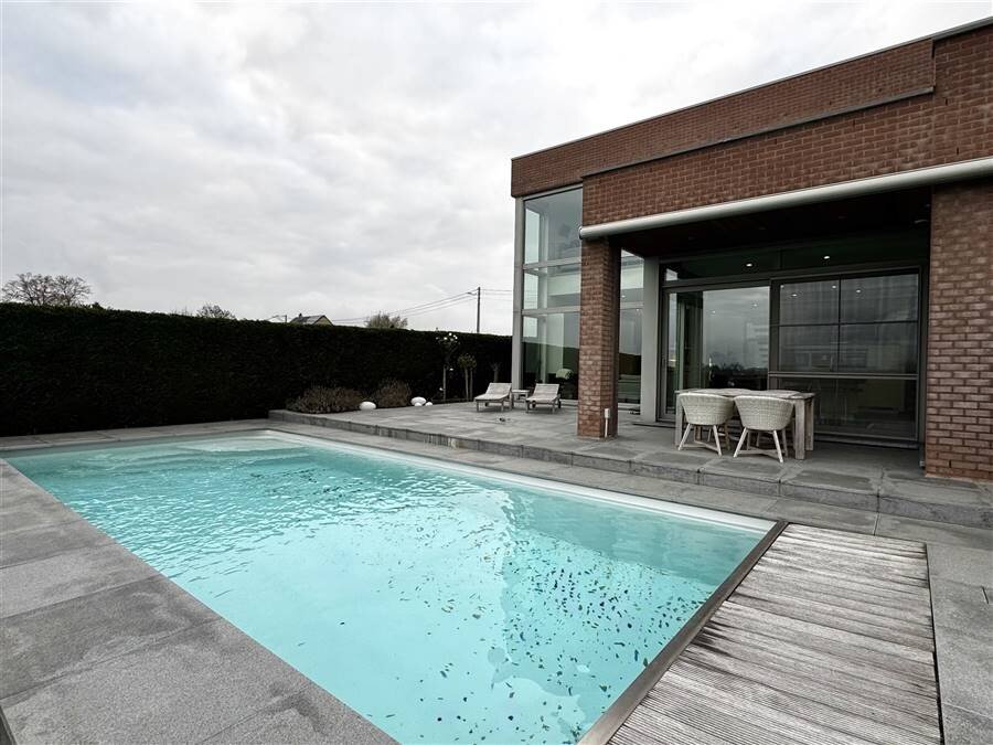 Coup de cœur assuré! Superbe maison contemporaine de 2015! Nichée dans un environnement calme et baignée de lumière, cette construction cubique moderne séduit par son confort et ses finitions. Dès l’entrée, vous serez charmé par le vaste hall disposant d’une toilette séparée. Le rez-de-chaussée offre un séjour particulièrement lumineux, agrémenté d’un insert au gaz moderne, ainsi qu’une cuisine de luxe entièrement équipée avec des électroménagers de grande qualité. Une buanderie fonctionnelle et un garage. À l’étage, la suite parentale avec sa salle de bain, son dressing et son accès direct à une terrasse exclusive. Une seconde chambre dispose de sa propre salle de douche. Un spacieux bureau, baigné de lumière, offre la possibilité d’être transformé en troisième chambre. Vous y trouverez également une toilette séparée et un grenier. À l’extérieur, le charme opère tout autant : une magnifique piscine de 10x4 m, équipée d’une volet électrique, d’un robot, d’un local technique et d’un vestiaire comprenant douche, lavabo et WC. La grande terrasse prolongée par un jardin constitue un espace idéal pour recevoir et profiter des beaux jours. Côté technique, la maison est irréprochable : électricité conforme, chauffage par le sol, pompe à chaleur, PEB B, domotique, screens, tente solaire, climatisation, panneaux solaires, robot tondeuse, caméras, ainsi qu’un espace parking. Cette propriété offre un confort de vie exceptionnel. Une opportunité rare à ne pas manquer ! Info IMMO FRANCE