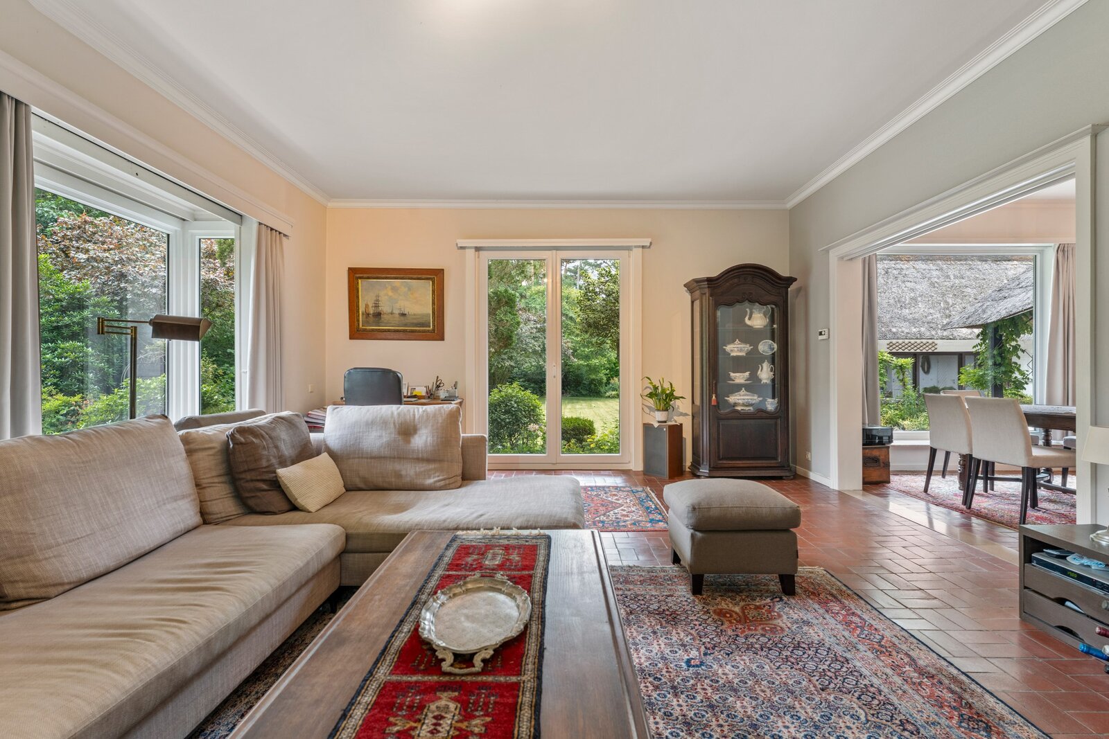 La villa vous accueille par une allée privée avec un grand parking. Dans le hall d'entrée se trouvent un vestiaire, des toilettes pour les invités et l'accès à la cave et à l'étage. Le salon lumineux d'environ 51 m², avec cheminée et de grandes baies vitrées, offre une vue sur le jardin. La cuisine (environ 11 m²) est directement accessible depuis la terrasse couverte.