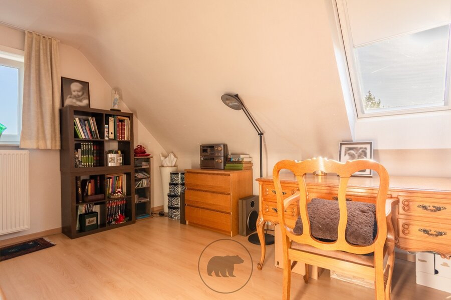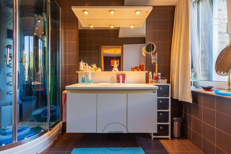 De inkomhal van het privatief appartement heeft een veiligheidsdeur en gastentoilet. Een glazen deur geeft toegang tot de lichtrijke leefruimte met open leefkeuken en annex berging. De leefruimte heeft toegang tot beide terrassen van zo'n 55 en 9 vierkante meter. Vanop deze terrassen heeft u een groen uitzicht, middenin een oase van rust en dit op wandelafstand van het bruisende centrum van de gemeente. Op deze eerste verdieping is er verder nog een slaapkamer met dressing en badkamer met douche.