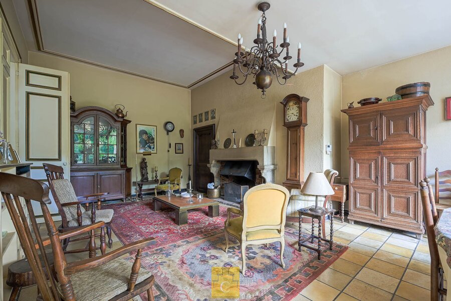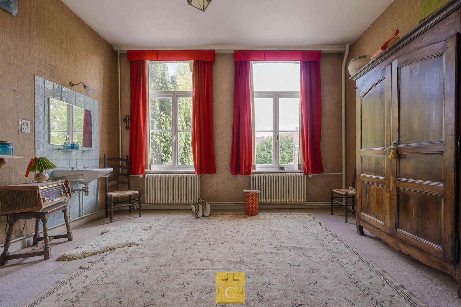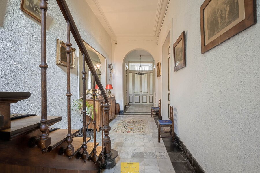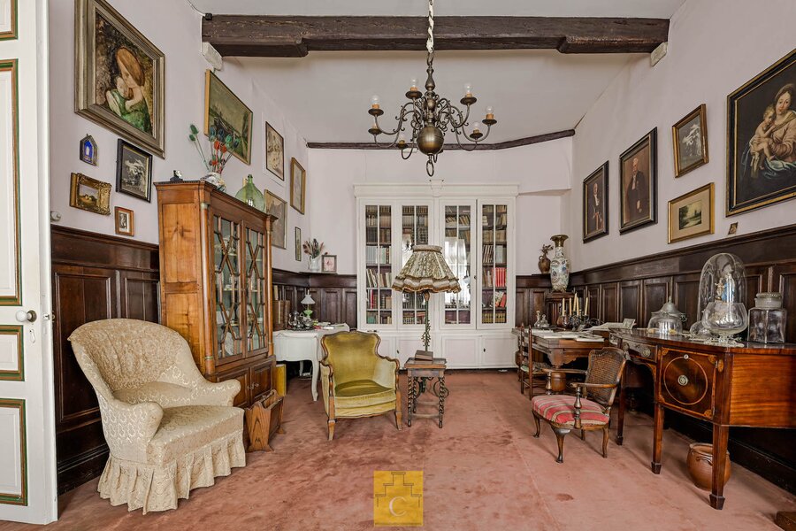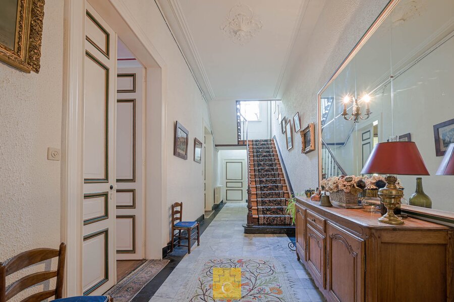 Indeling: Via de imposante inkomhal met marmeren vloer en monumentale trap komt u terug in de tijd dat groot wonen puur genieten was. Links bevindt zich een suite van salons met hoge plafonds, rijkelijk versierd met molures en rozassen, hoge dubbele deur, sierlijke marmeren schouwen en aansluitend een lichtrijke leefruimte met open haard en tuinzicht. Keuken en bijkeuken bieden functionele ruimte. Rechts van de hal wacht een indrukwekkend bureau, met lambrizering en Vlaamse schouw – ideaal voor wie op zoek is naar een thuiswerkplek met stijl. Op de eerste verdieping bevinden zich vijf royale slaapkamers, elk met hun eigen unieke elementen en historische details. Badkamer. De grote zolderverdieping, bereikbaar via een vaste trap, biedt talloze mogelijkheden: atelier, extra slaapkamers, hobbyruimte... Gedeeltelijk onderkelderd. CV gas (condensketel Viessmann).