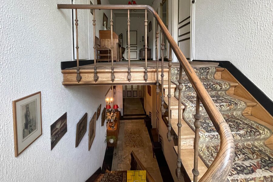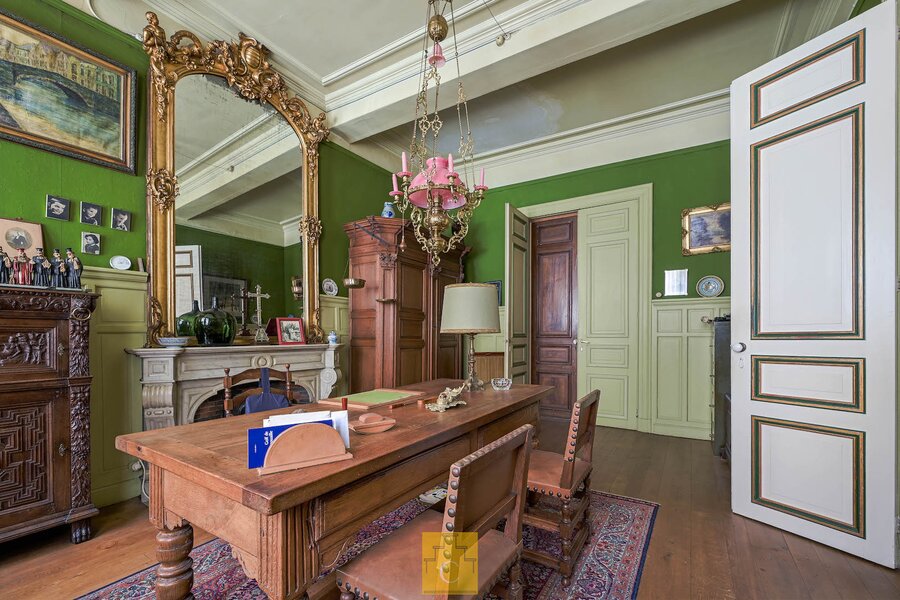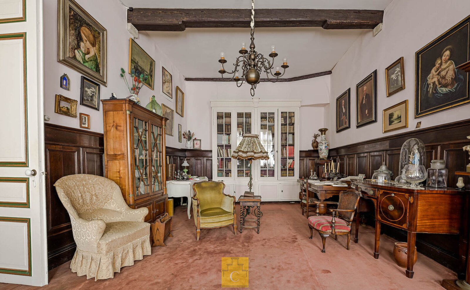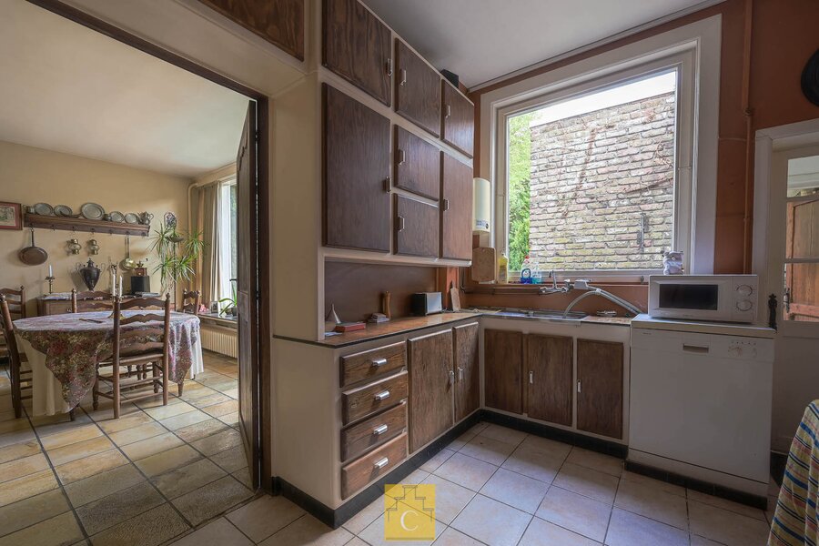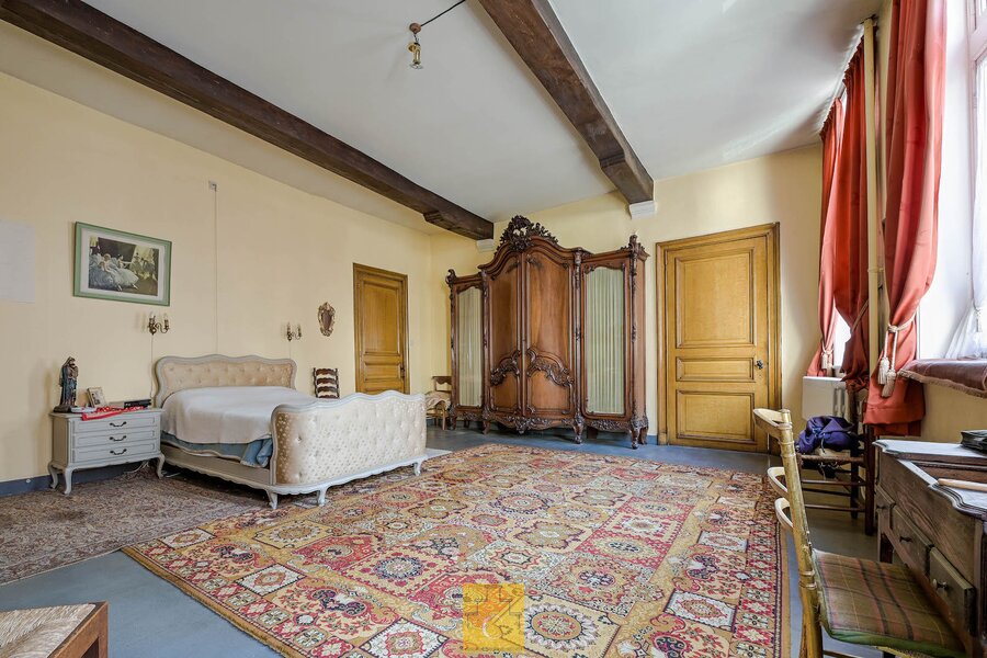 Indeling: Via de imposante inkomhal met marmeren vloer en monumentale trap komt u terug in de tijd dat groot wonen puur genieten was. Links bevindt zich een suite van salons met hoge plafonds, rijkelijk versierd met molures en rozassen, hoge dubbele deur, sierlijke marmeren schouwen en aansluitend een lichtrijke leefruimte met open haard en tuinzicht. Keuken en bijkeuken bieden functionele ruimte. Rechts van de hal wacht een indrukwekkend bureau, met lambrizering en Vlaamse schouw – ideaal voor wie op zoek is naar een thuiswerkplek met stijl. Op de eerste verdieping bevinden zich vijf royale slaapkamers, elk met hun eigen unieke elementen en historische details. Badkamer. De grote zolderverdieping, bereikbaar via een vaste trap, biedt talloze mogelijkheden: atelier, extra slaapkamers, hobbyruimte... Gedeeltelijk onderkelderd. CV gas (condensketel Viessmann).