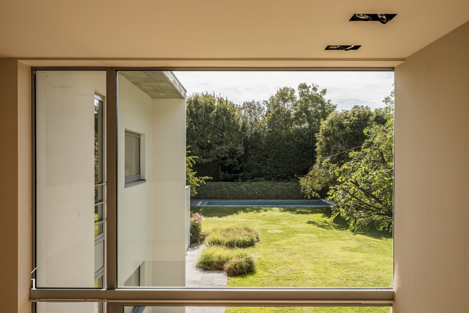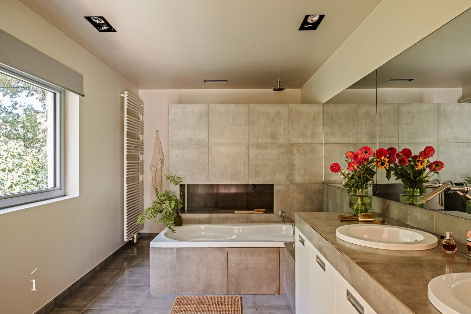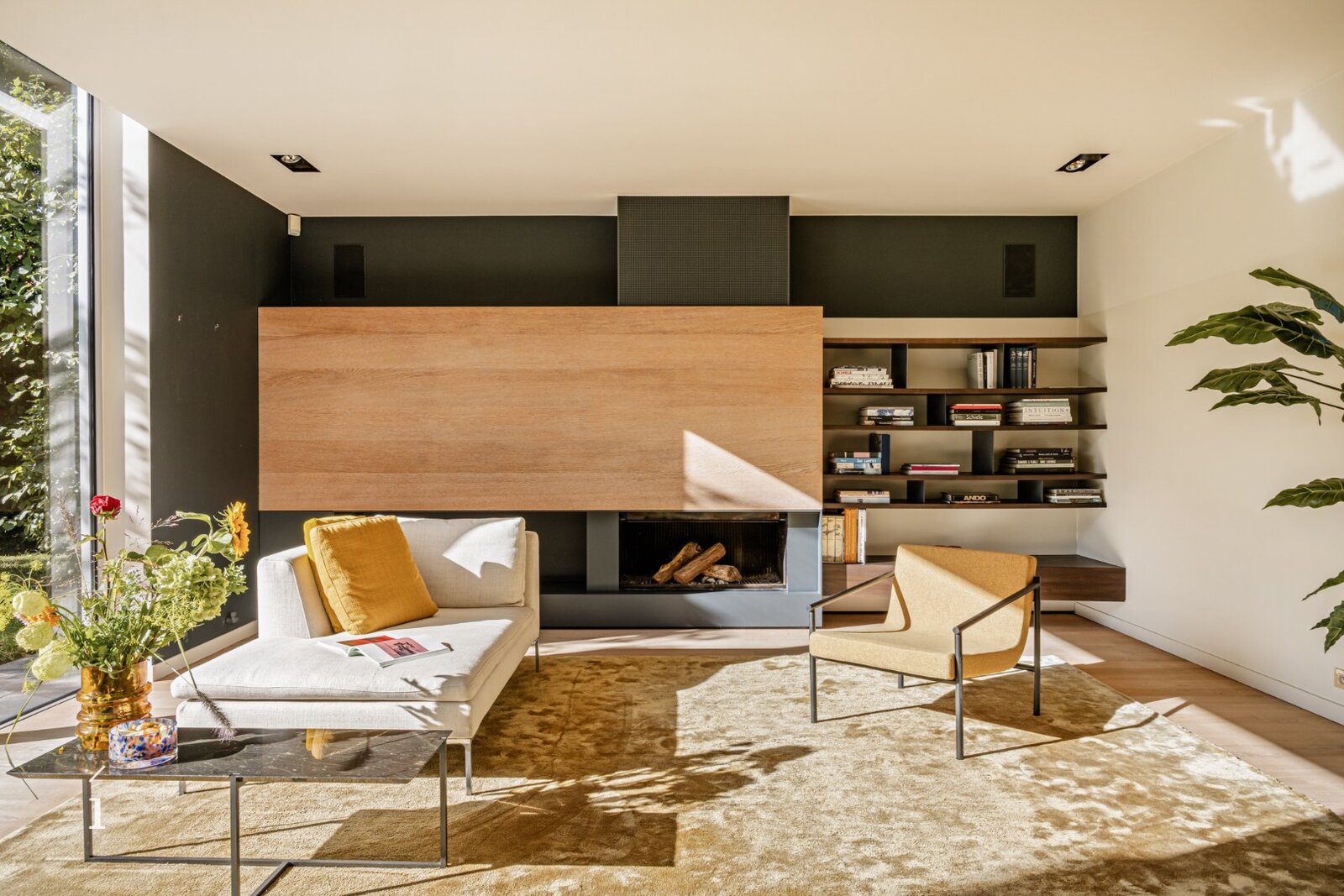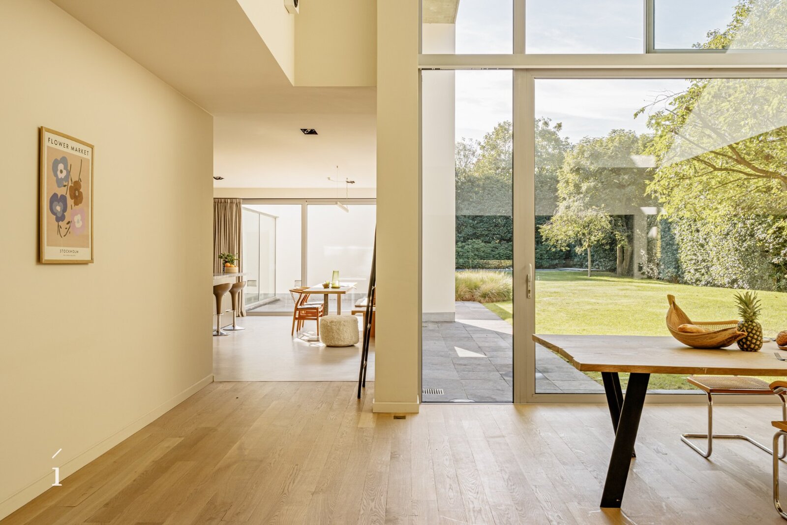 De ruime inkomhal zet meteen de toon met een vestiaire, gastentoilet en bureau . De leefruimtes zijn ontworpen met oog voor harmonie: de woonkamer, met zijn sfeervolle open haard, vloeit naadloos over in de eetkamer waar plafondhoge raampartijen en een indrukwekkende vide zorgen voor een adembenemend zicht op de tuin. Het intieme loungegedeelte in verzonken niveau creëert een gezellige cocon, perfect voor sfeervolle avonden met familie en vrienden.