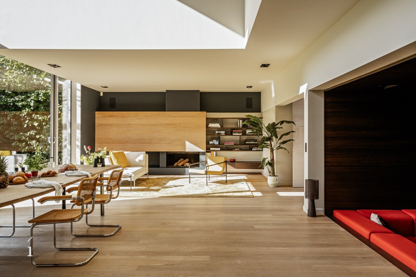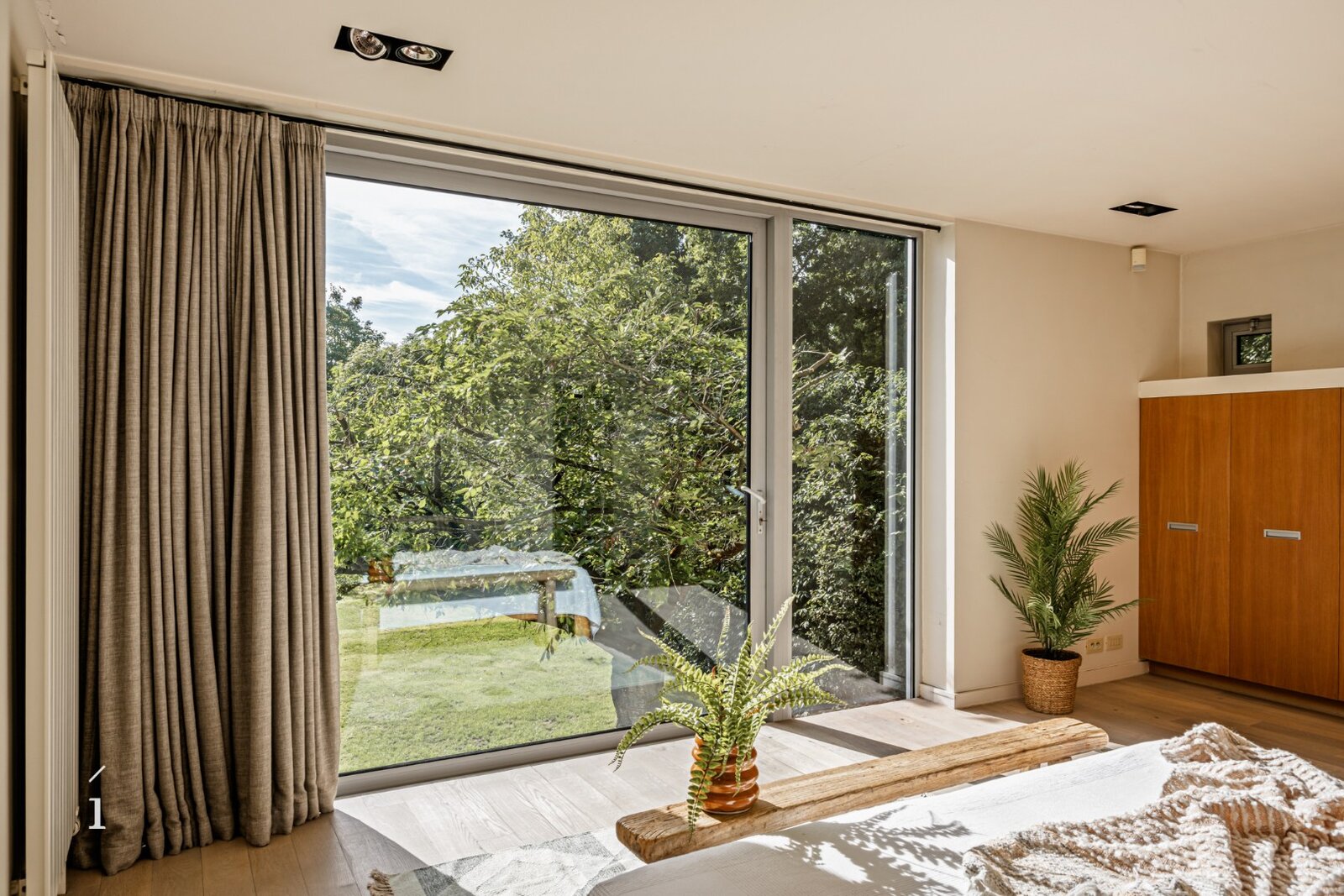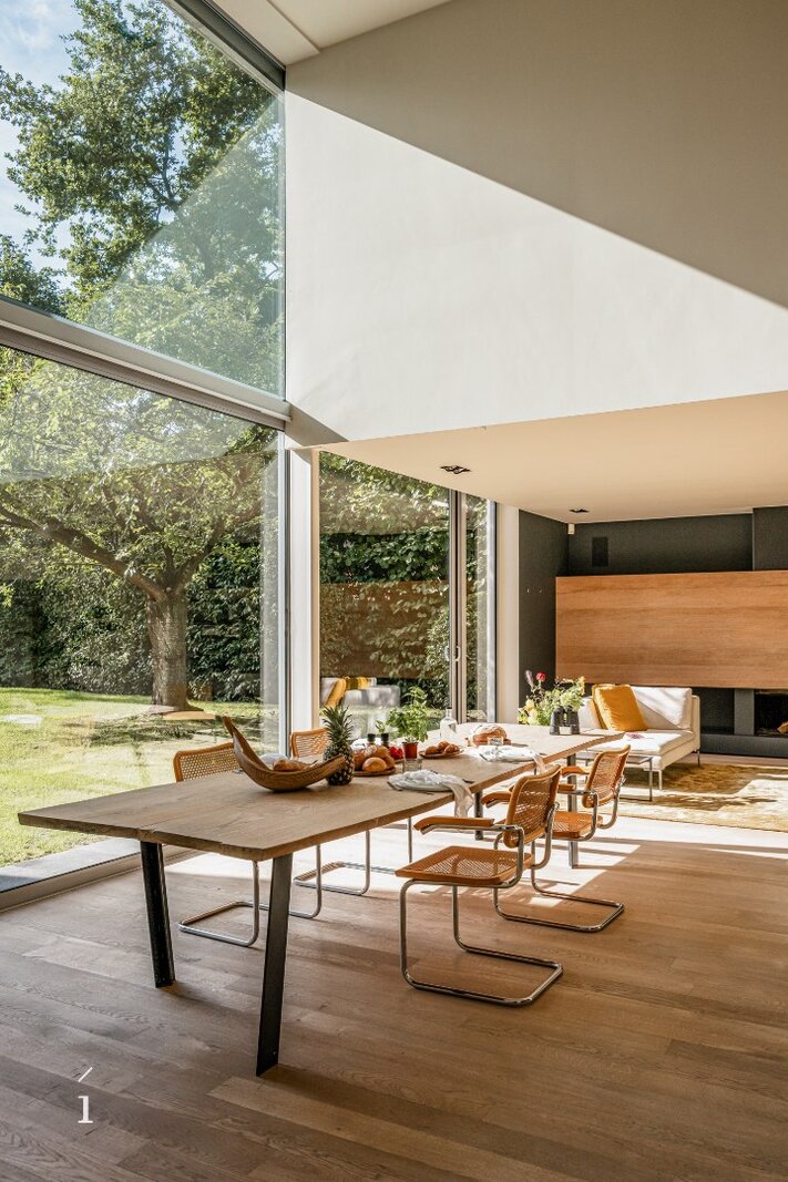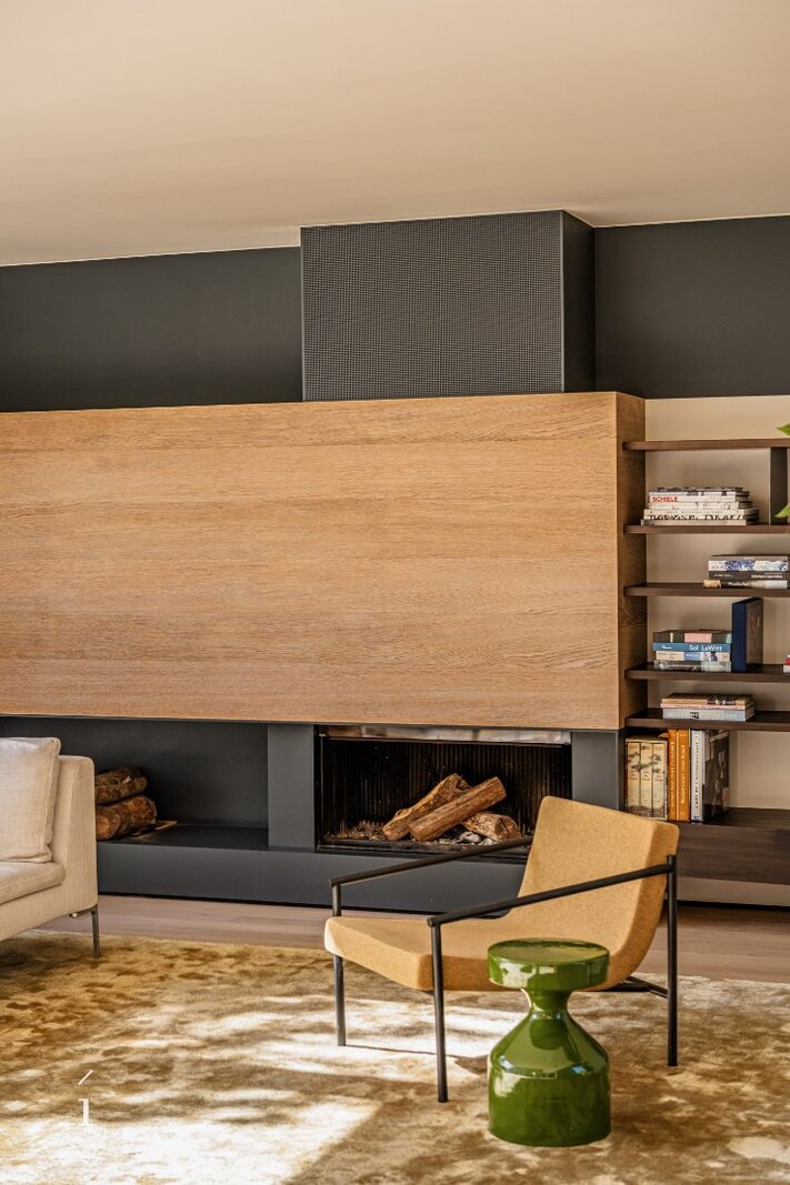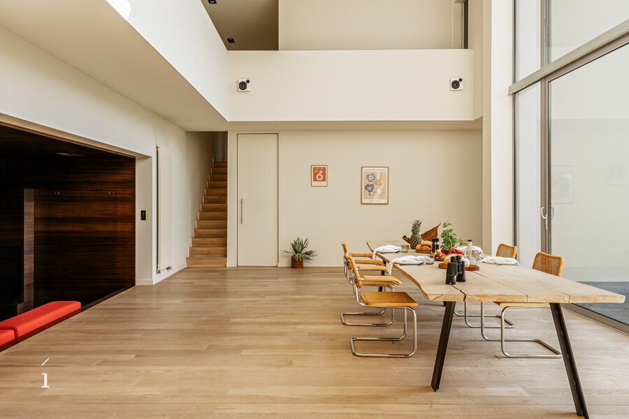 De ruime inkomhal zet meteen de toon met een vestiaire, gastentoilet en bureau . De leefruimtes zijn ontworpen met oog voor harmonie: de woonkamer, met zijn sfeervolle open haard, vloeit naadloos over in de eetkamer waar plafondhoge raampartijen en een indrukwekkende vide zorgen voor een adembenemend zicht op de tuin. Het intieme loungegedeelte in verzonken niveau creëert een gezellige cocon, perfect voor sfeervolle avonden met familie en vrienden.