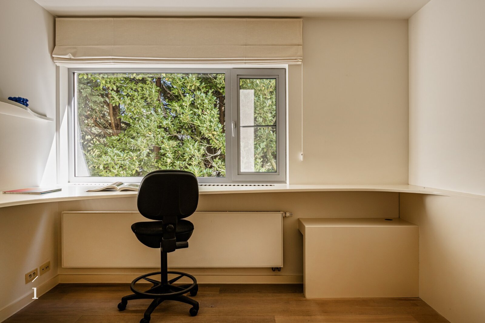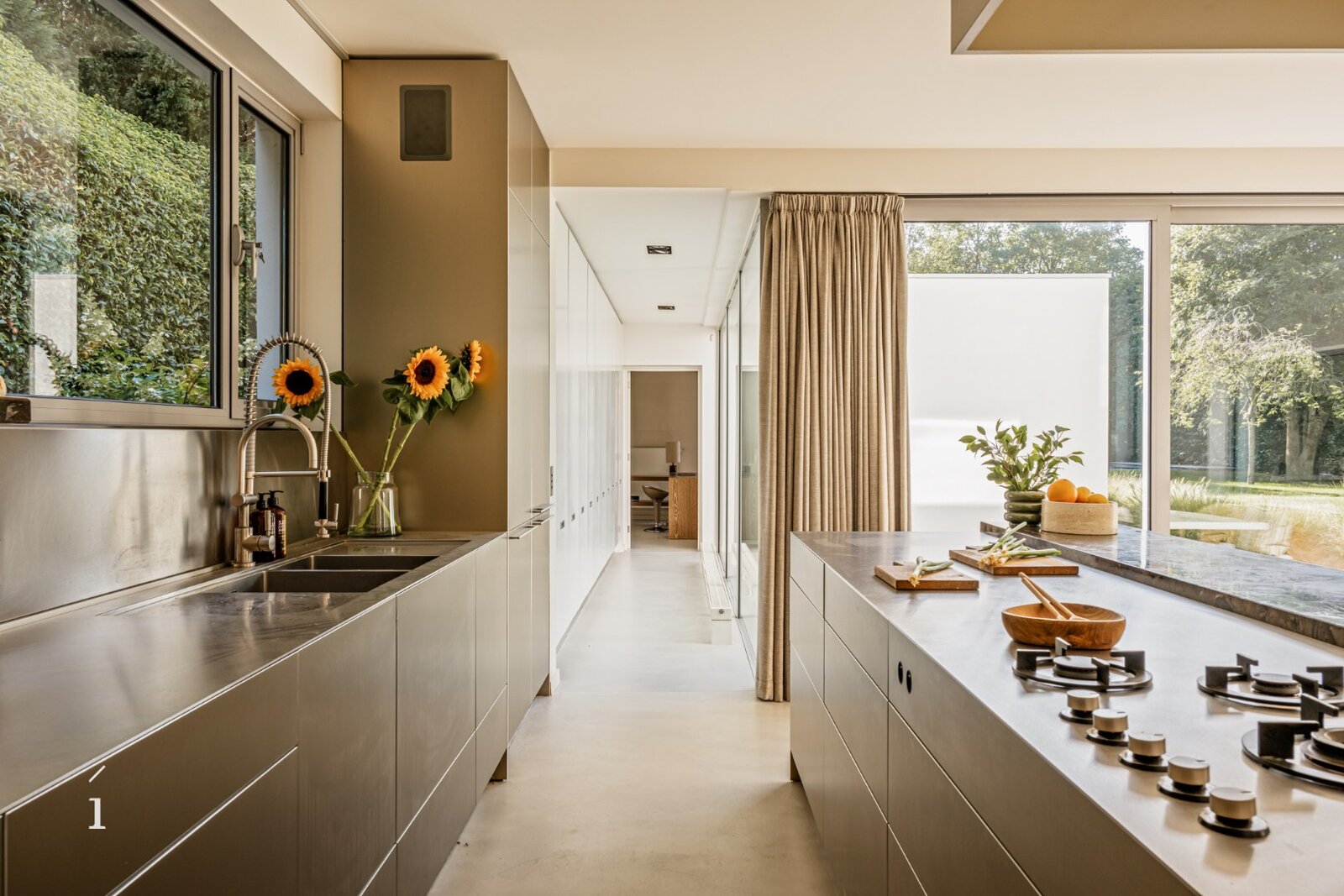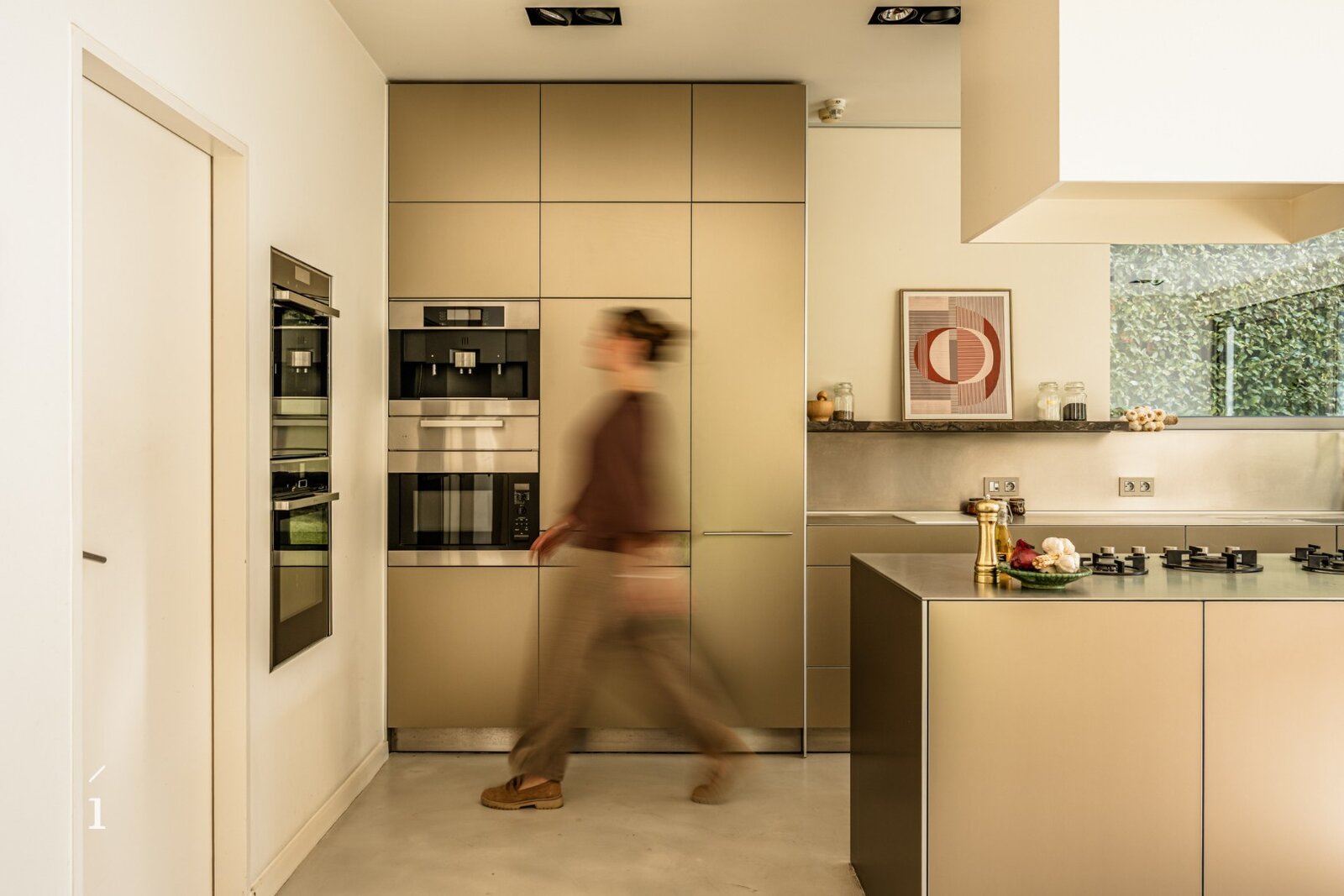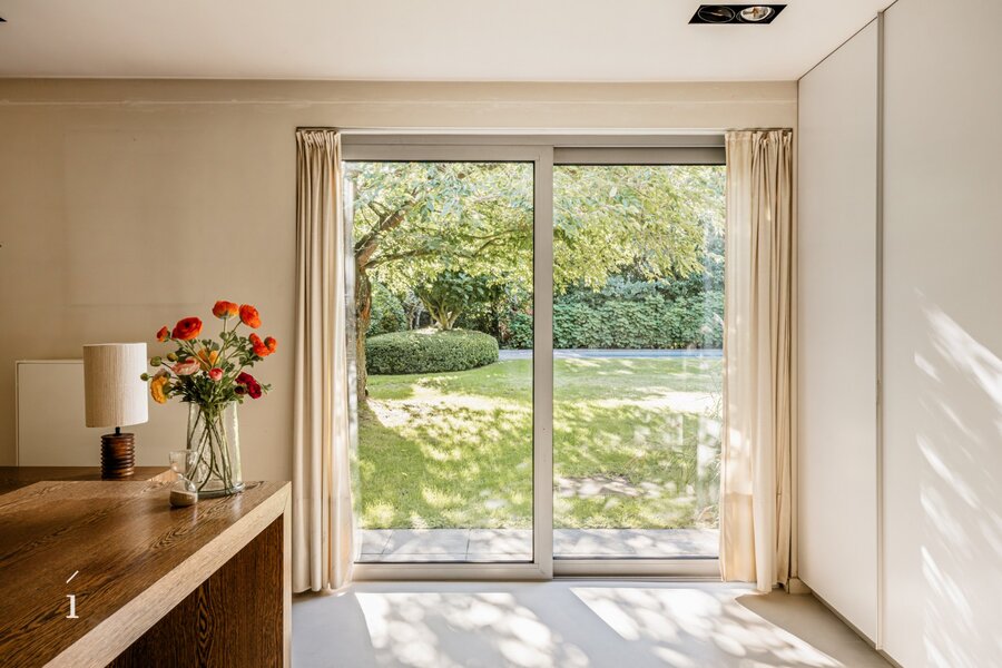 De aparte ingang met mudroom, extra vestiaire en toilet benadrukt het praktische comfort van deze woning. De keuken is een absolute blikvanger: een Bulthaup-keuken in champagnekleur, volledig uitgerust met hoogwaardige toestellen en een uitnodigende eetplaats. Via de keuken bereikt u een zonnig, intiem terras – perfect voor een ontbijt in de ochtendzon of een sfeervol aperitiefmoment.